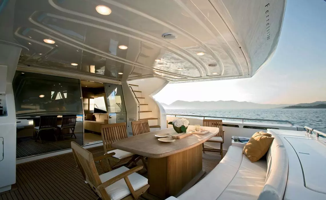 - Main deck salon, blending a living room with a formal dining area for up to eight guests, finished with premium materials typical of Ferretti’s craftsmanship.