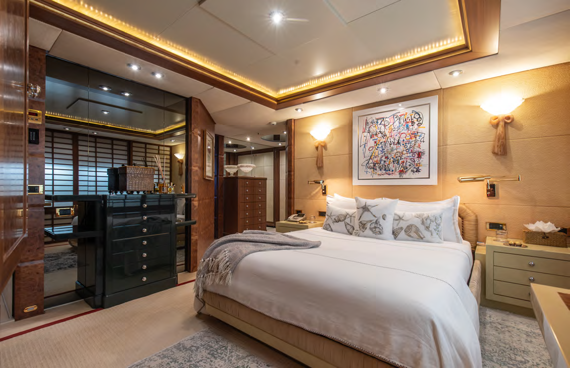 At the heart of the main deck lies a full‑beam master suite, complete with a private study—an elegant retreat with subtly Oriental notes, reflecting designer Donald Starkey’s nuanced approach to luxury. Nearby sits a single cabin, ideal for a child, nanny, or security staff.