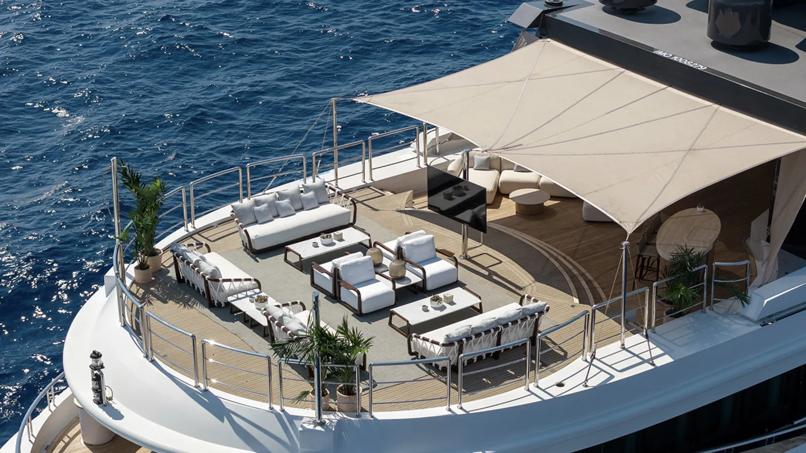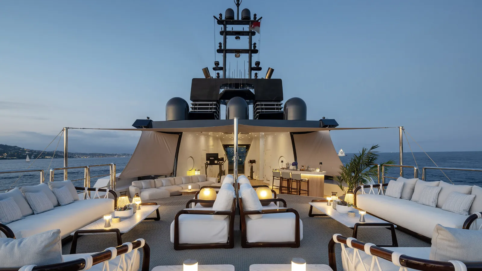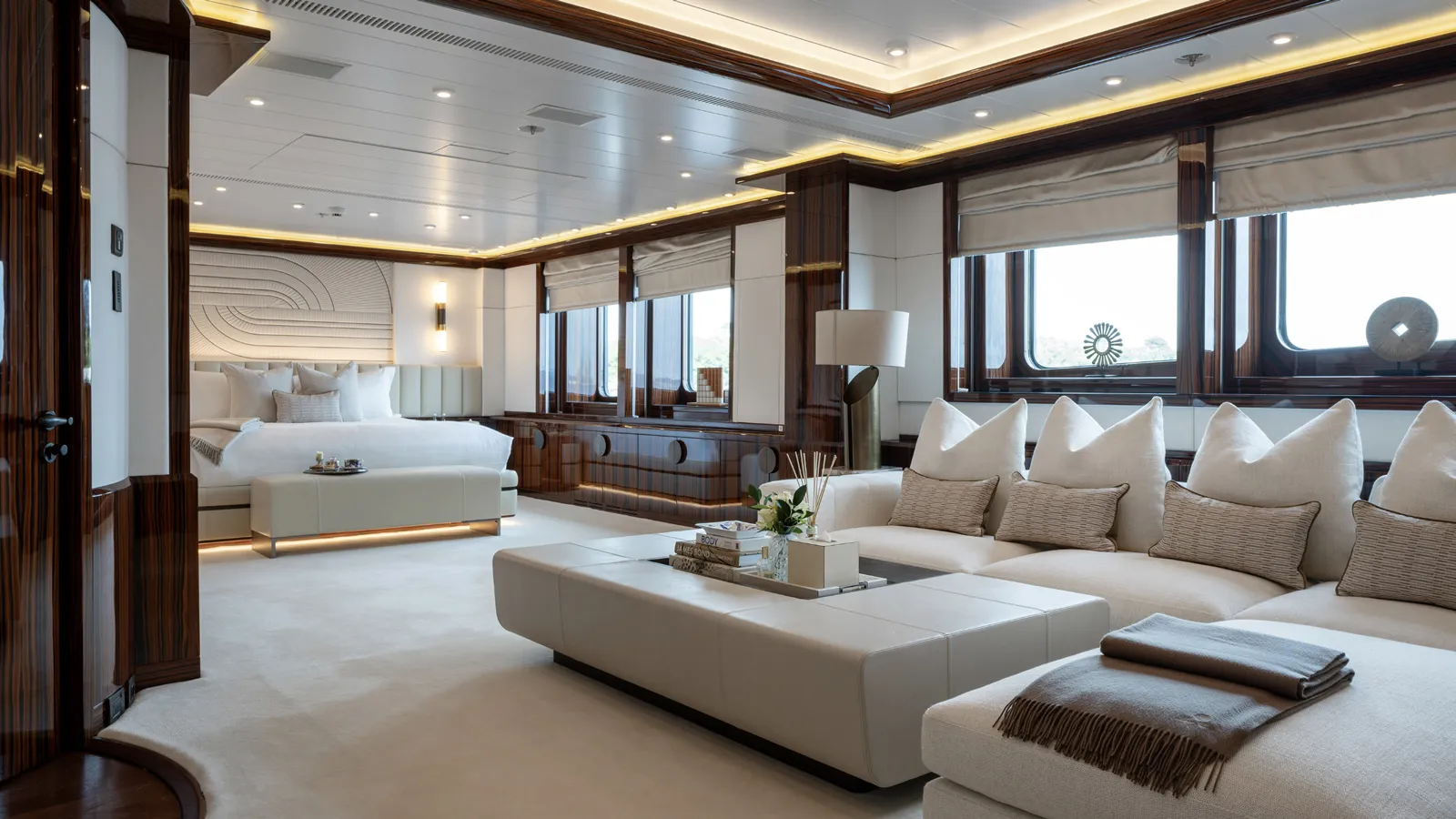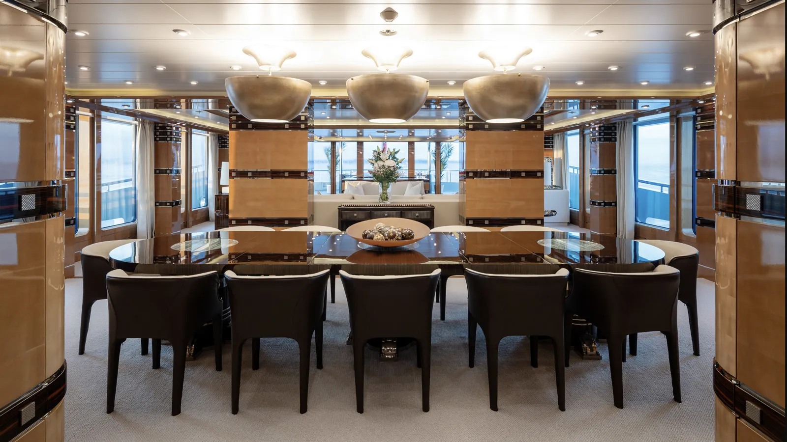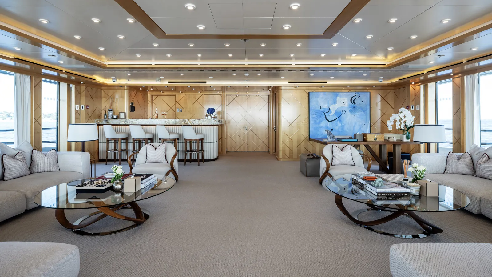 The 2024 refit brought a new helideck, fresh exterior furniture, and a dedicated Teppanyaki bar. Inside, the main-deck saloon showcases macassar, ebony, and sycamore wood with nickel-plated details and panoramic windows. A second lounge above offers two seating areas, a bar, and an office with striking floor-to-ceiling windows.