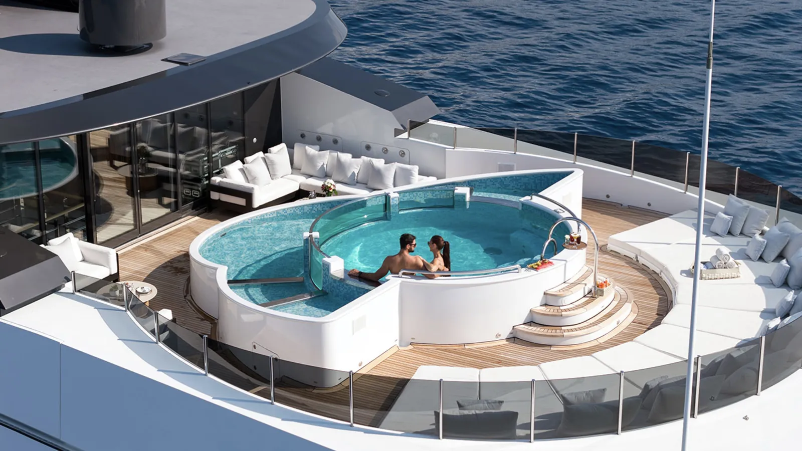 With 1,801GT of grandeur, AHS boasts expansive decks and lavish interiors, making her a charter favorite. Her sundeck is a highlight, featuring a 19,000-litre pool, a helipad that doubles as a sun lounge, seating for 18 at the exterior dining table, and an outdoor cinema for unforgettable gatherings.