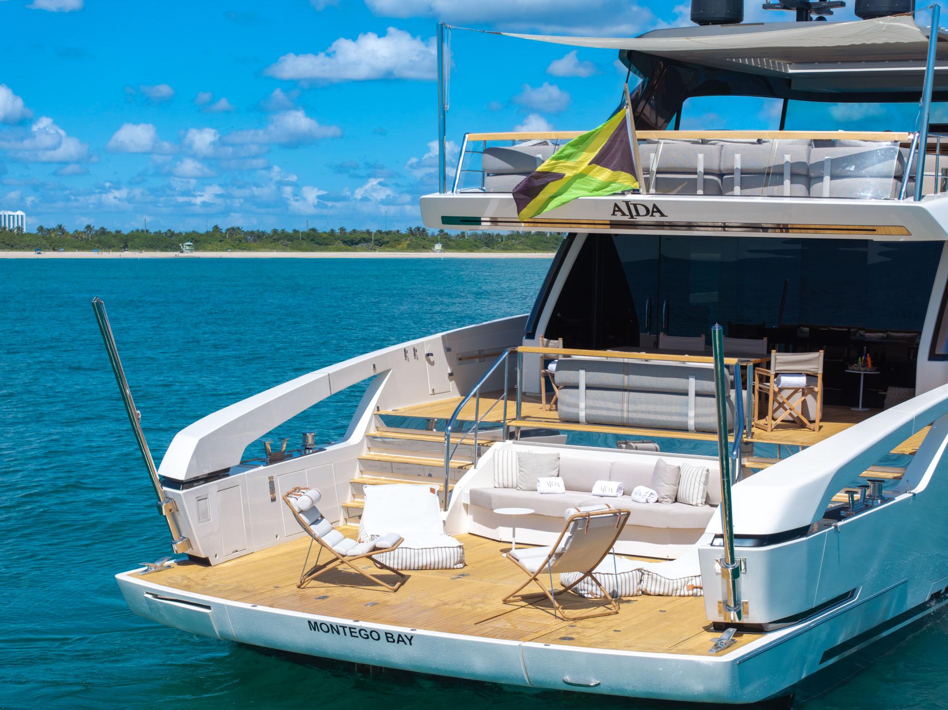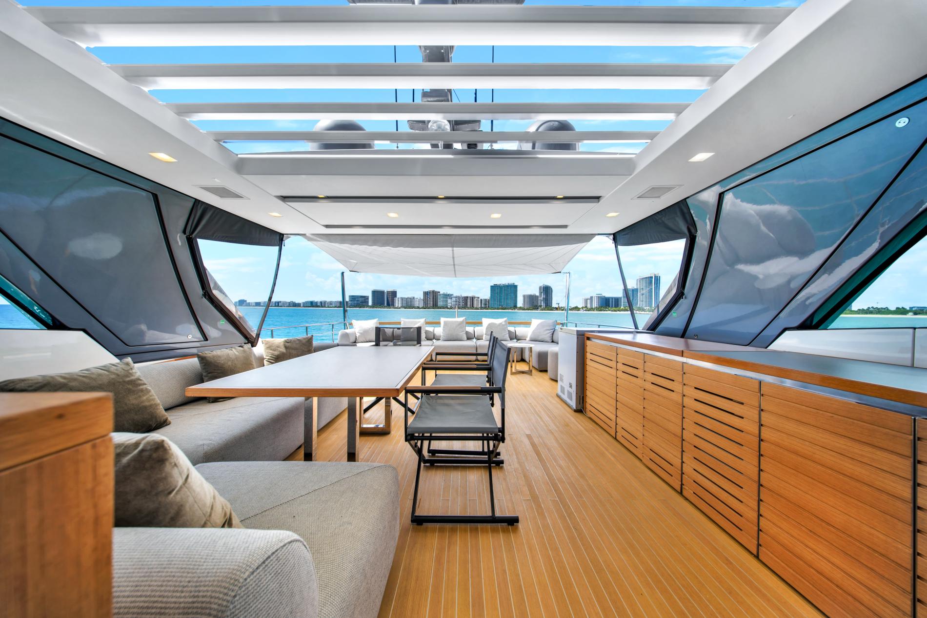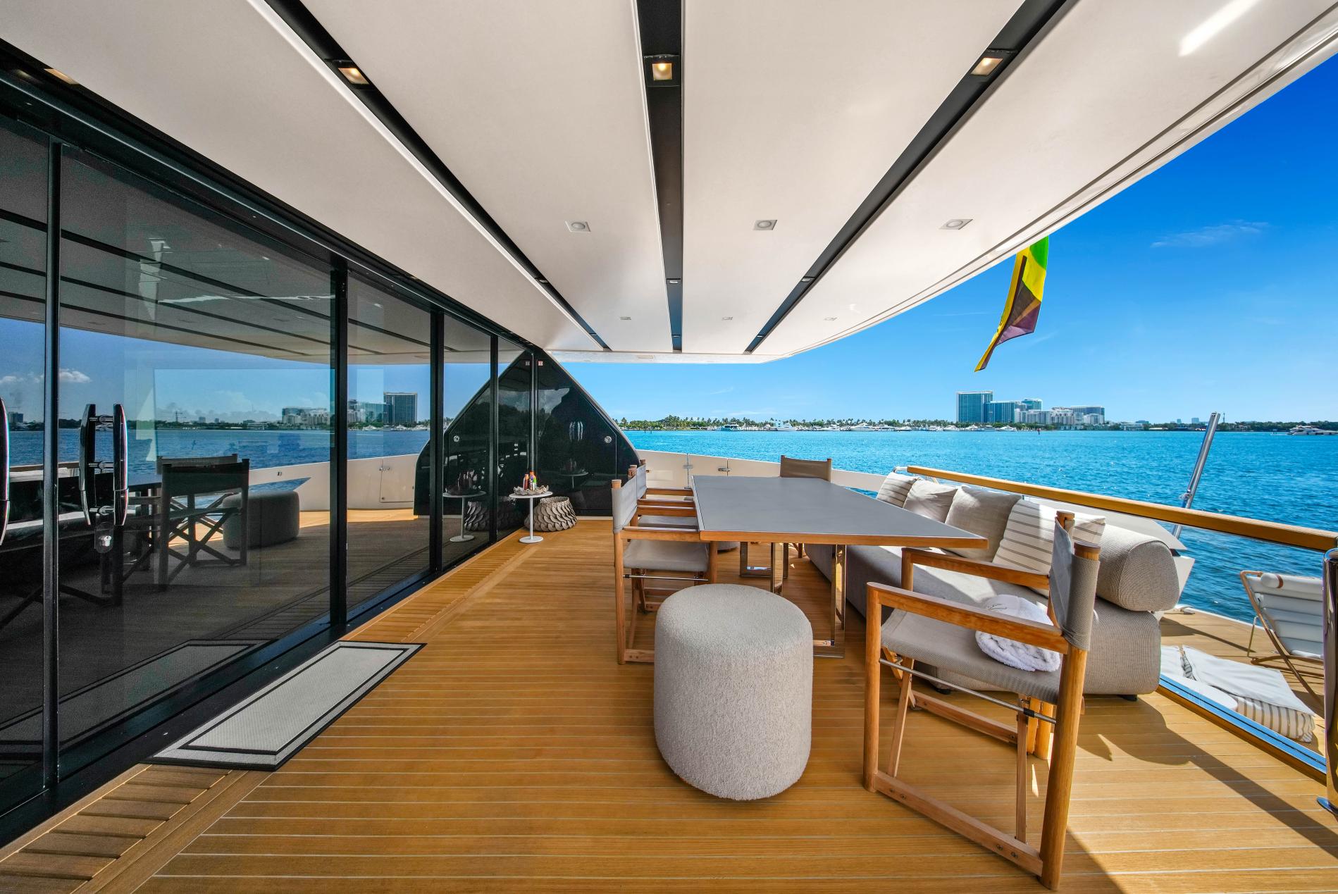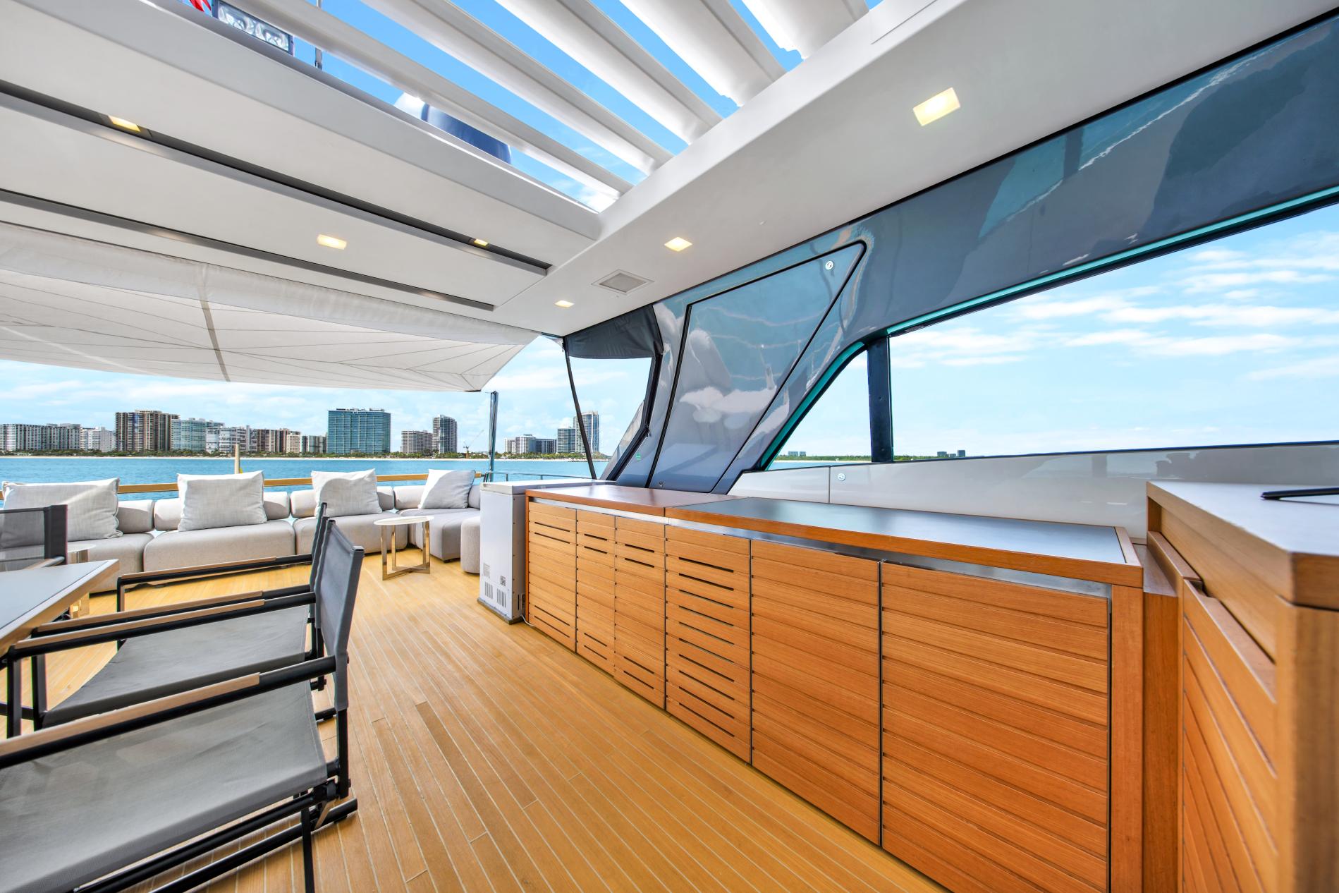 - Expansive Aft Deck: This two-level deck includes an al fresco dining area and a lower-level beach club with a hydraulic swim platform and a convertible swim ladder for easy tender access and beach club transformation.