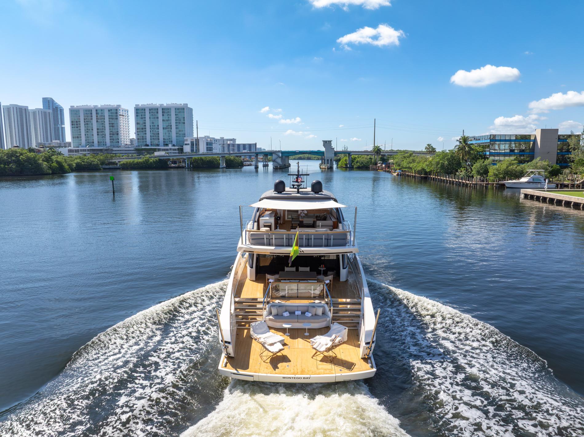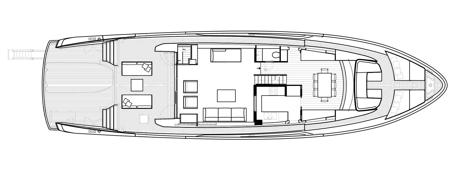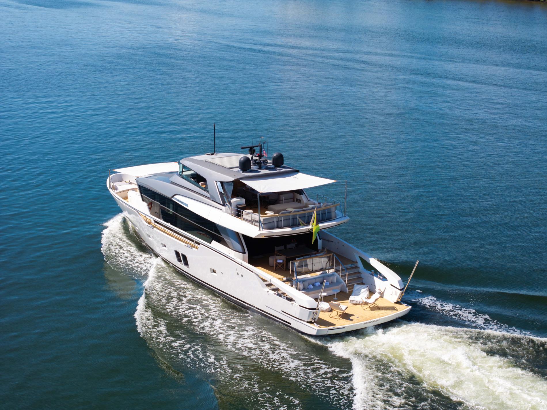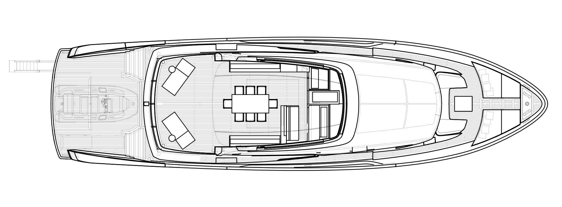 - Expansive Aft Deck: This two-level deck includes an al fresco dining area and a lower-level beach club with a hydraulic swim platform and a convertible swim ladder for easy tender access and beach club transformation.
