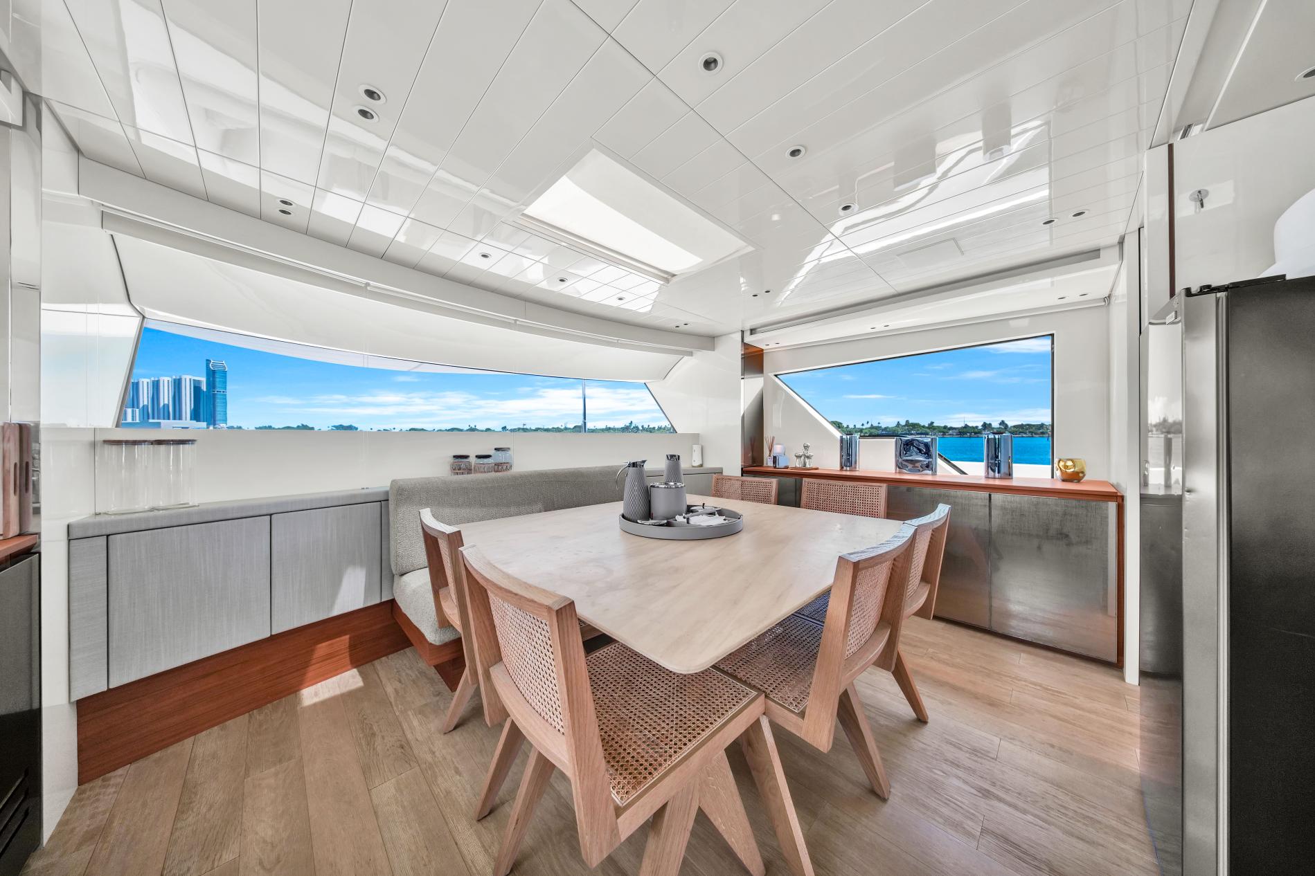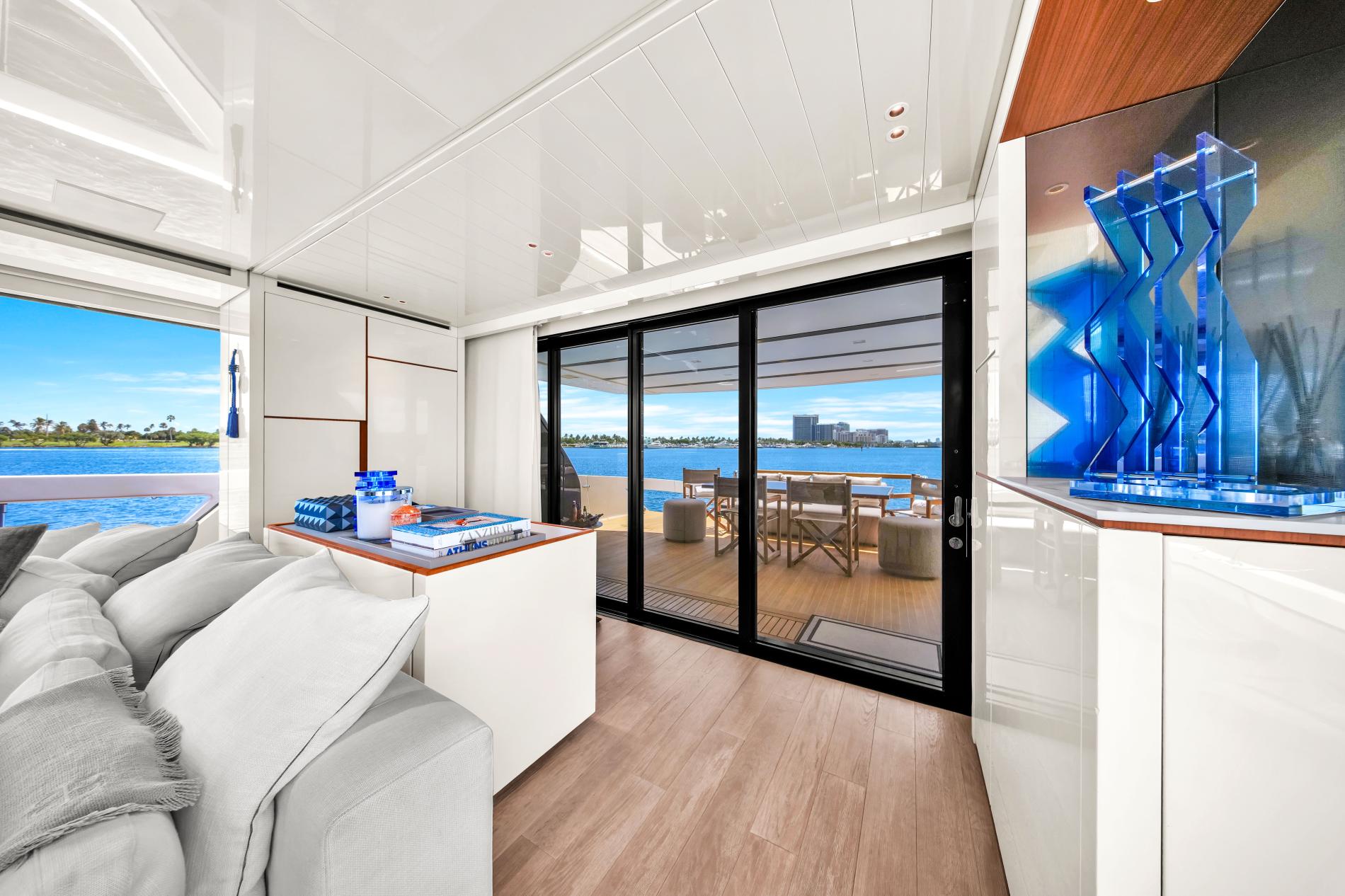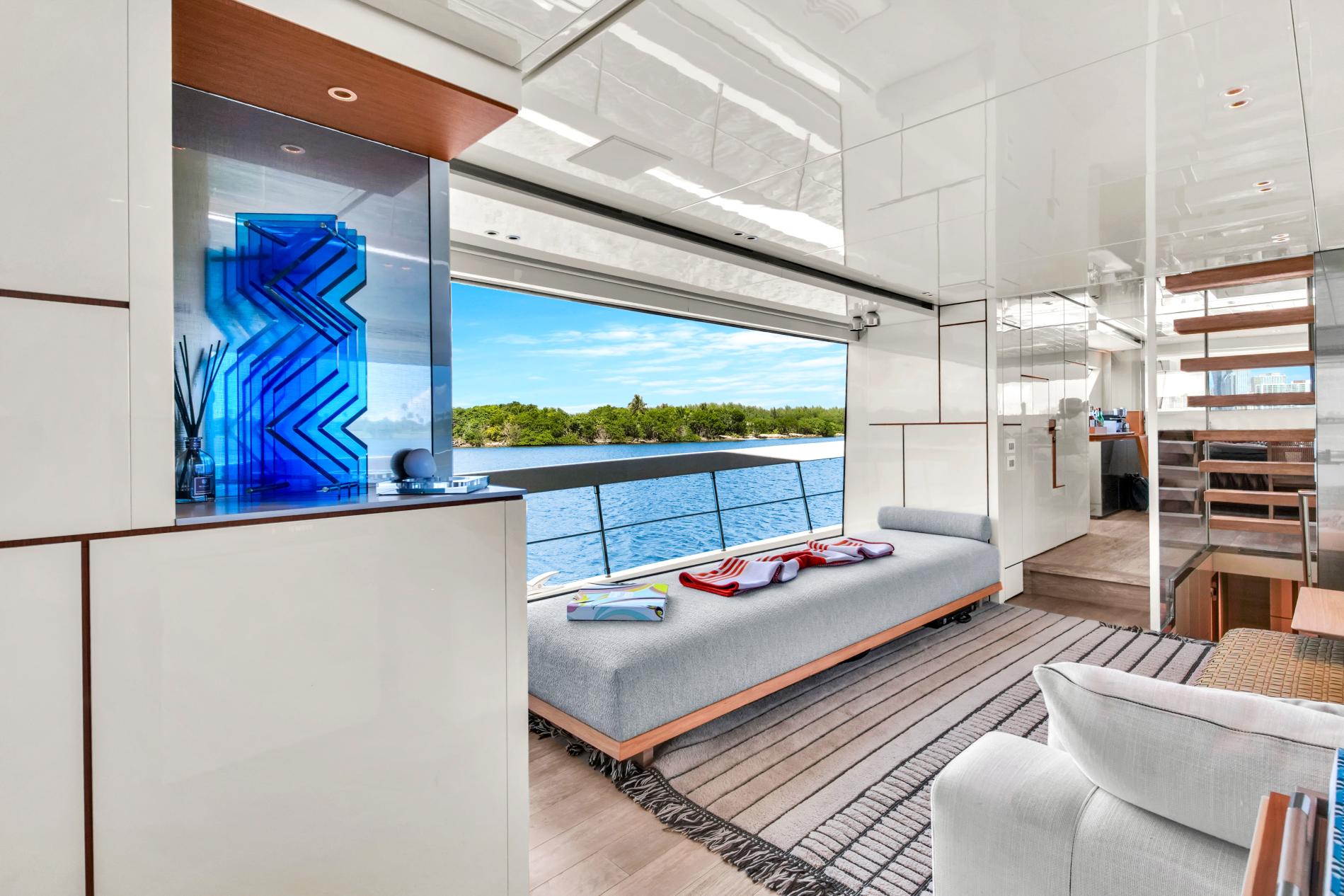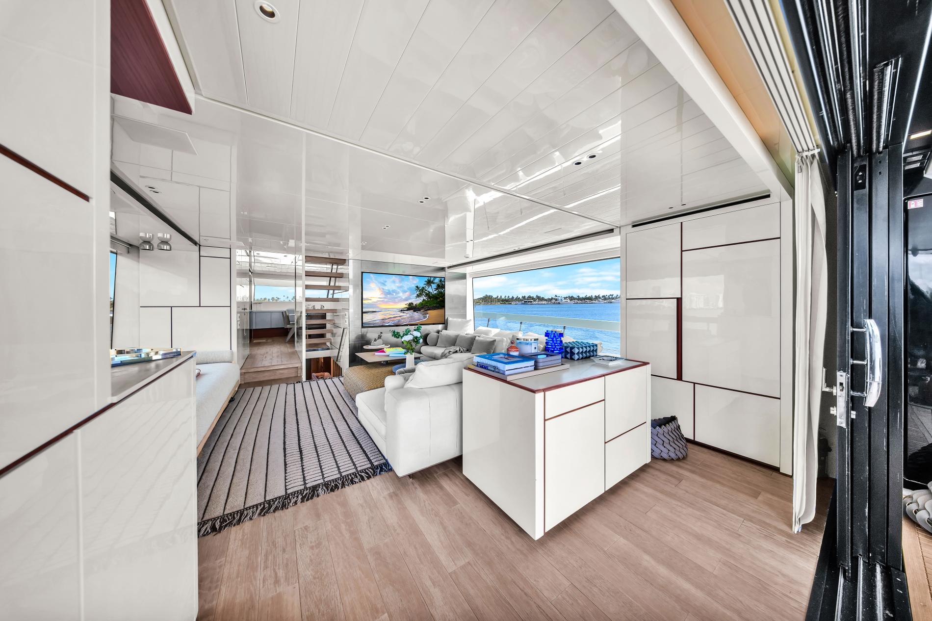 - Open-plan main deck with near full-height windows and enclosed galley