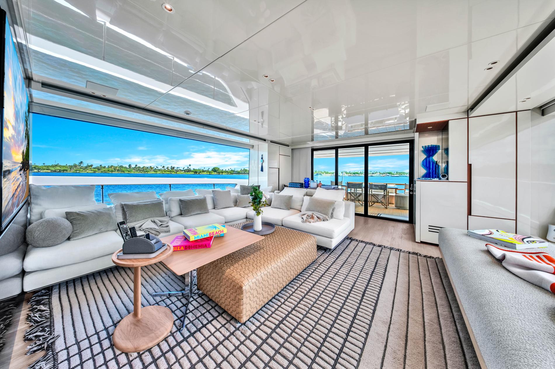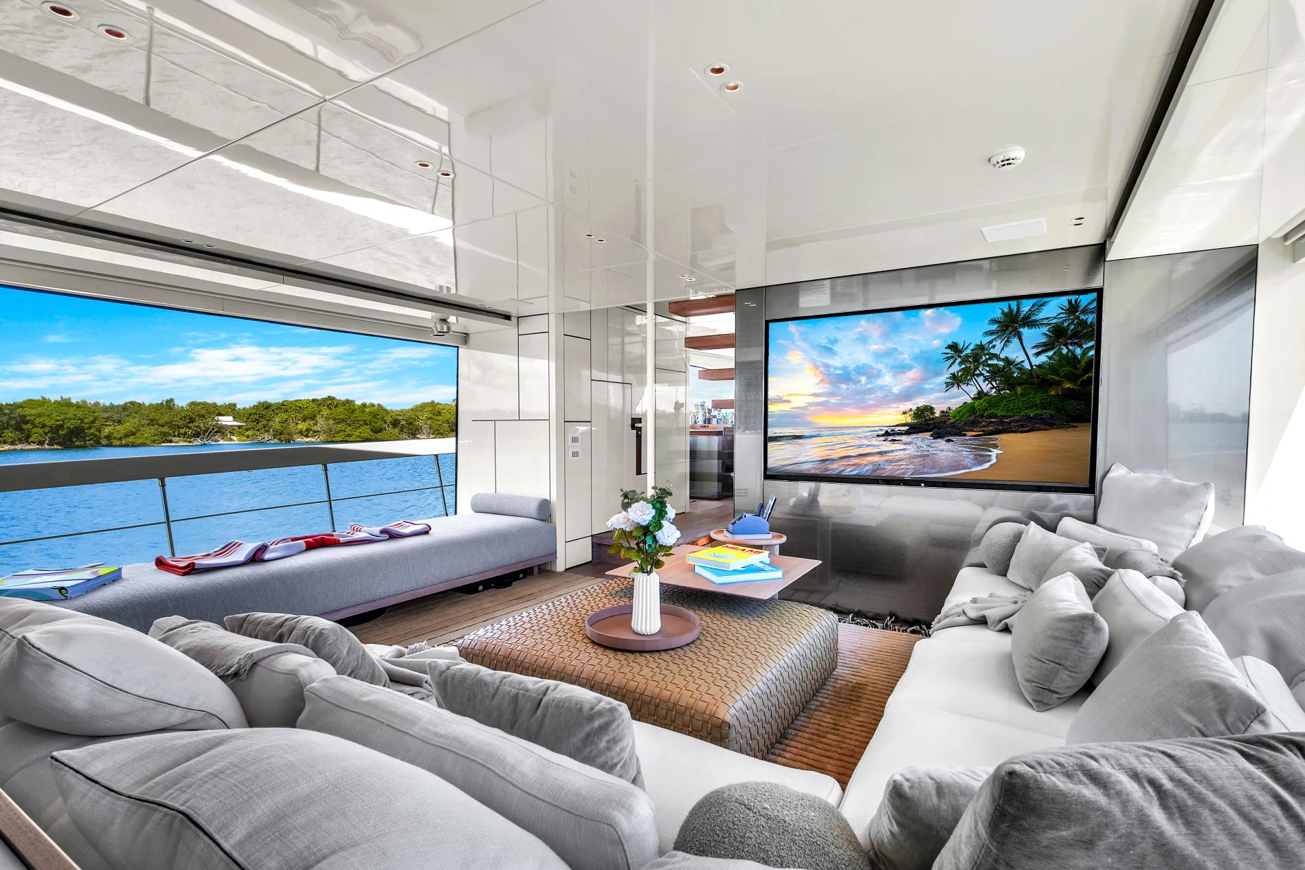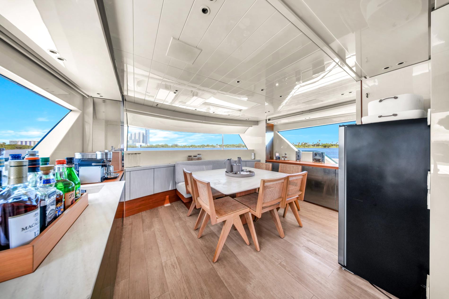 - Open-plan main deck with near full-height windows and enclosed galley