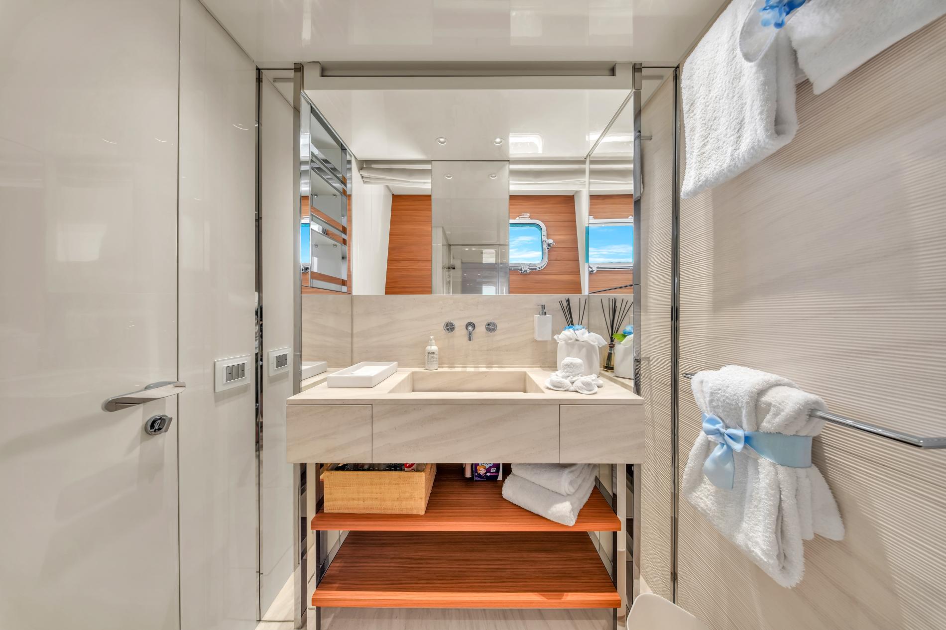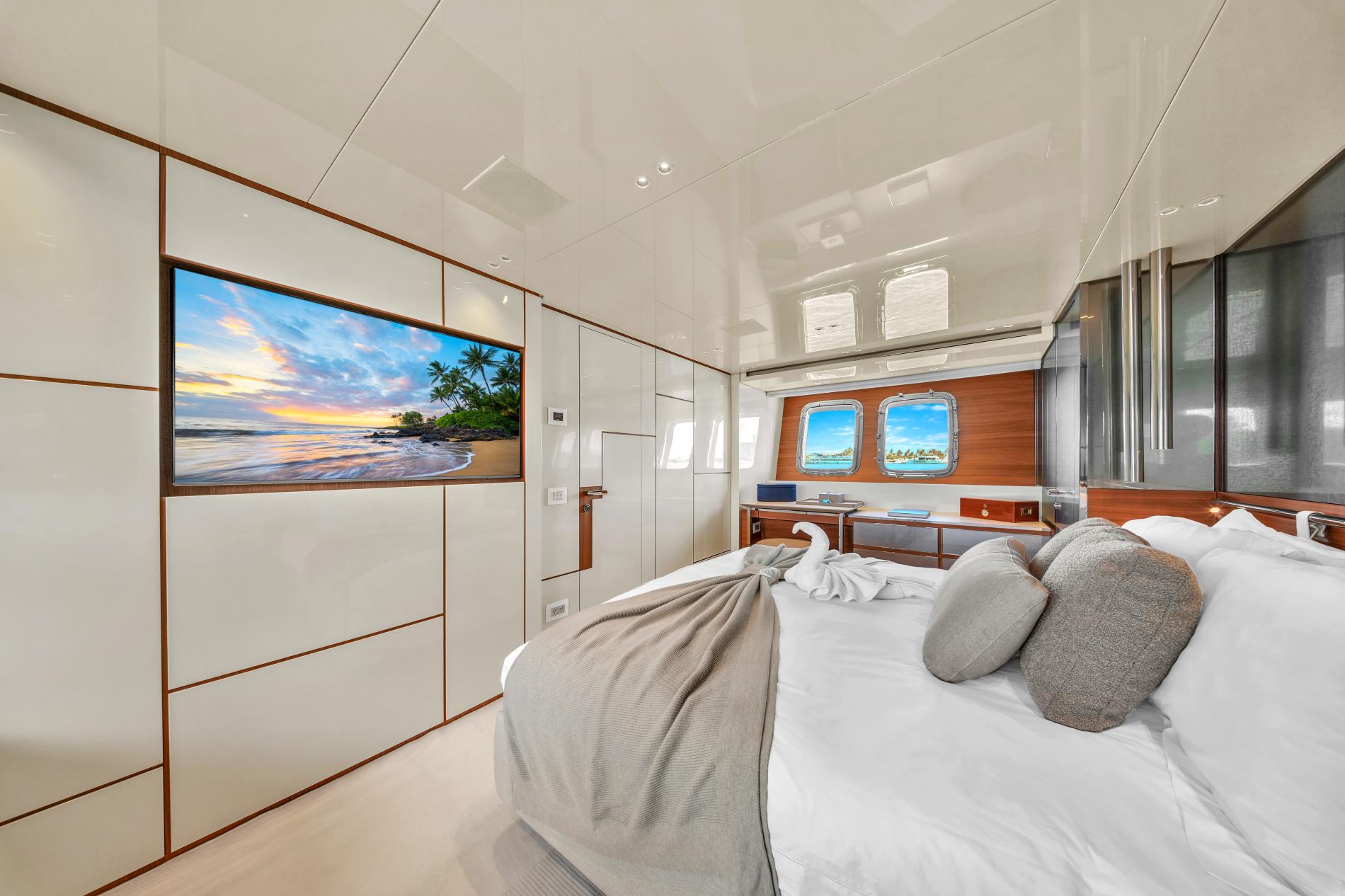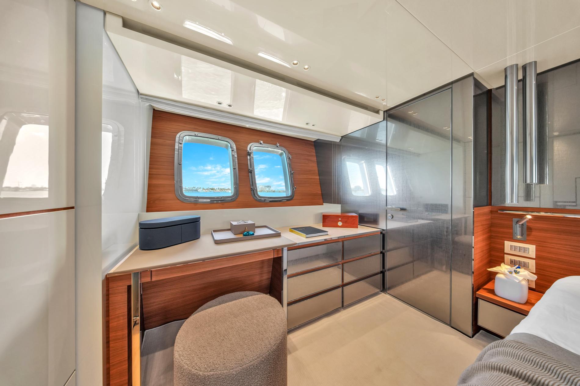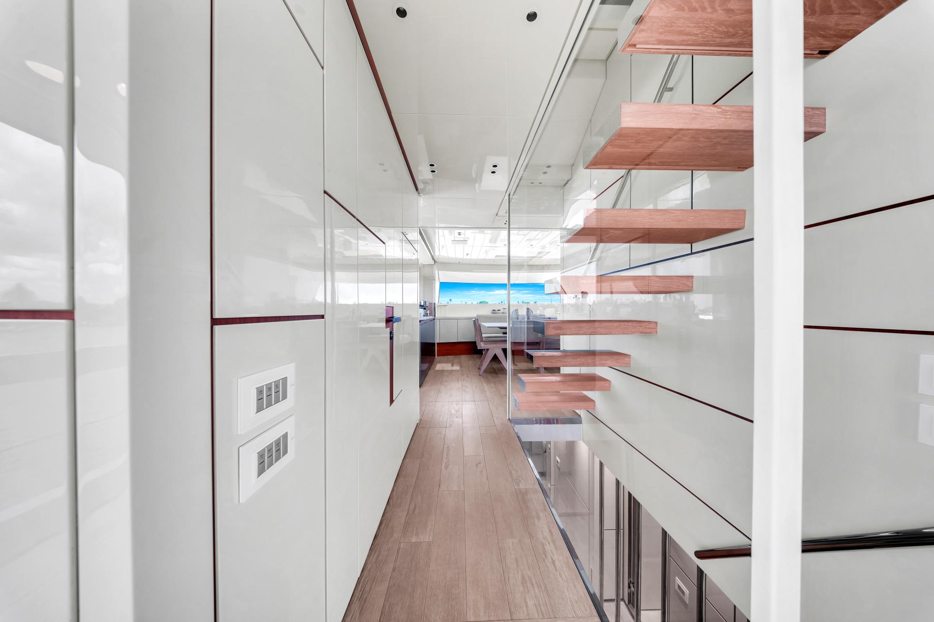 - Open-plan main deck with near full-height windows and enclosed galley