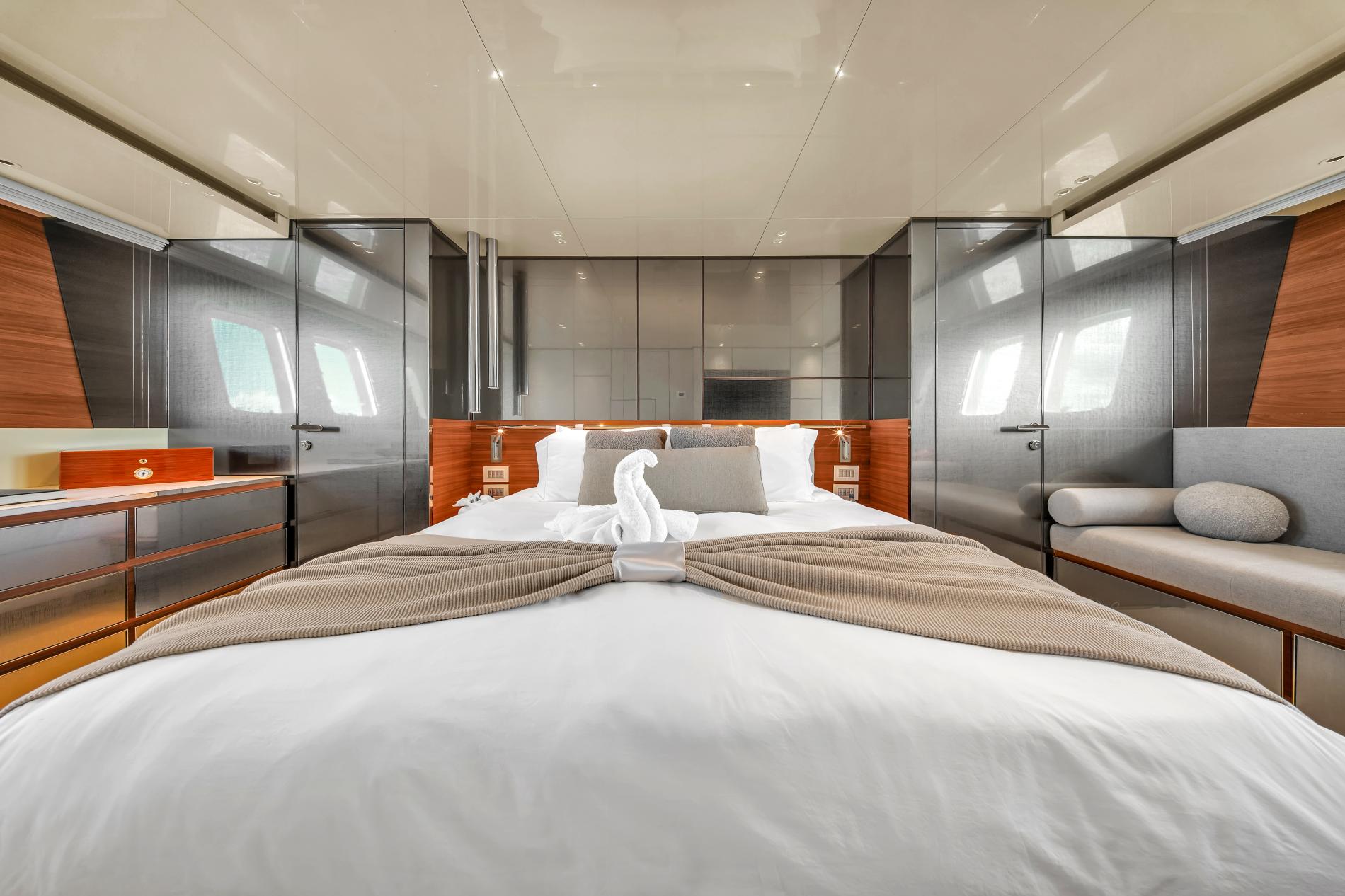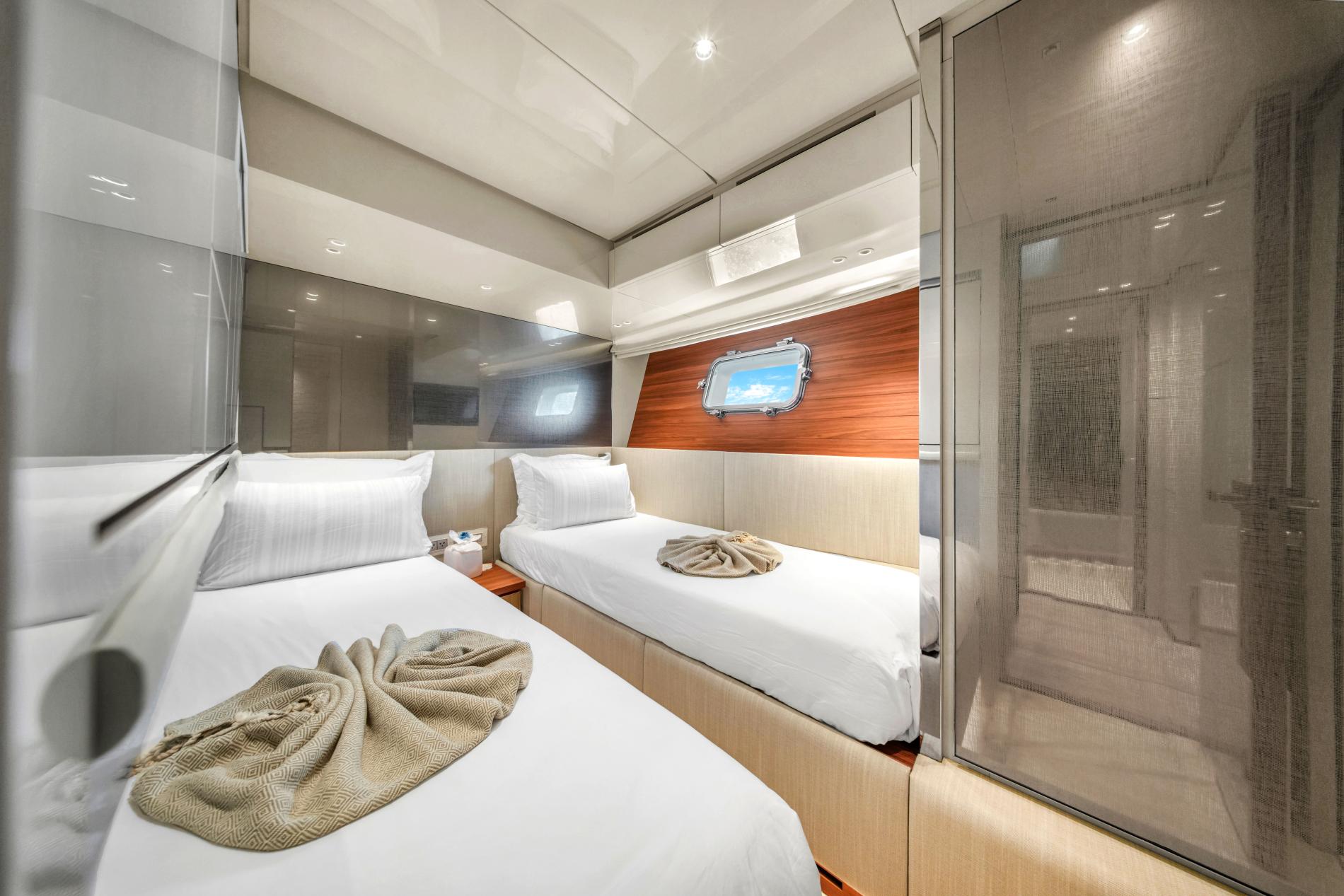 AIDA hosts eight to ten guests in four cabins, including a full-beam master suite, VIP, and two guest cabins. New carpeting adds comfort, while upgraded crew quarters accommodate four members for enhanced service. A guest area washer and dryer ensure practical luxury during extended stays.