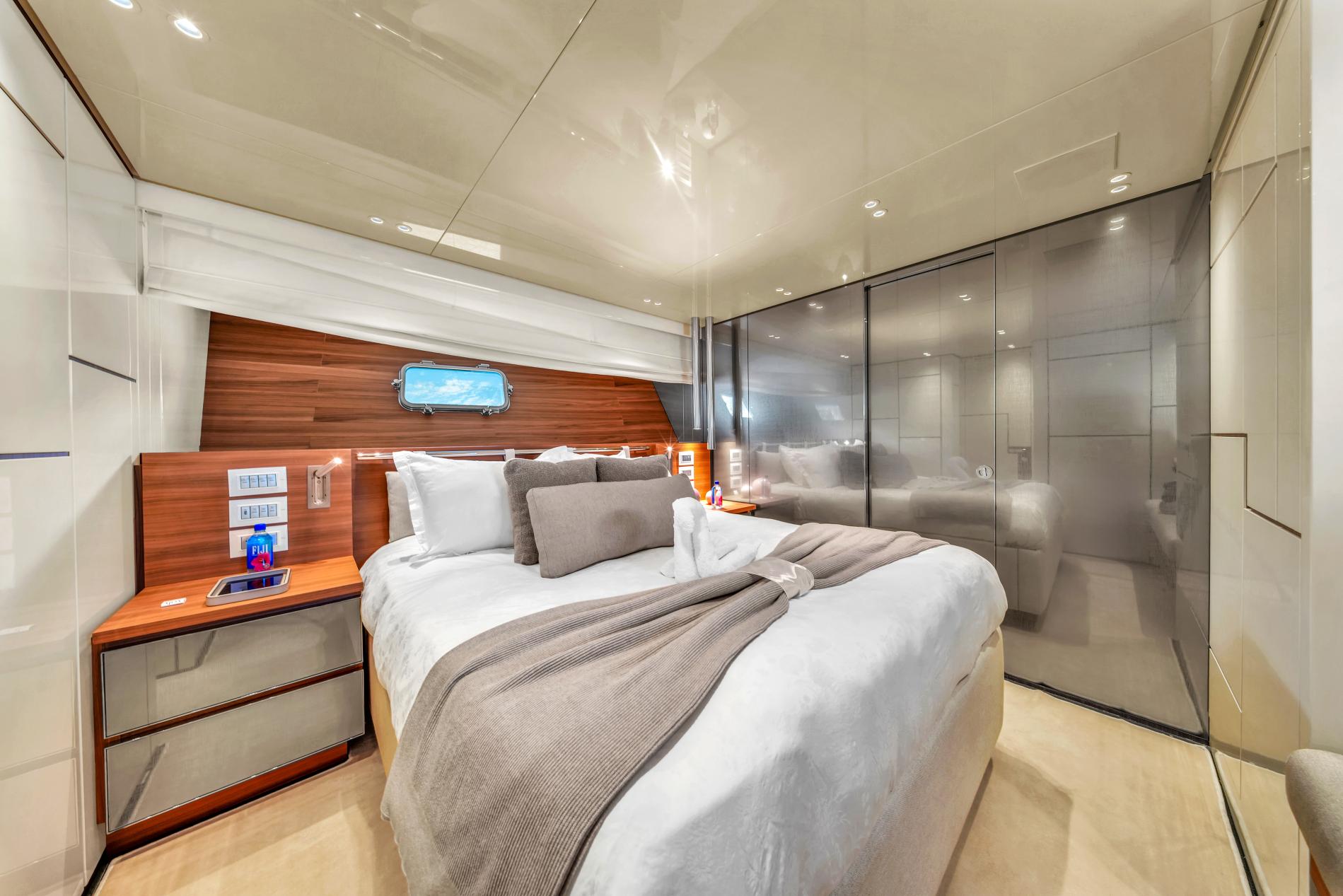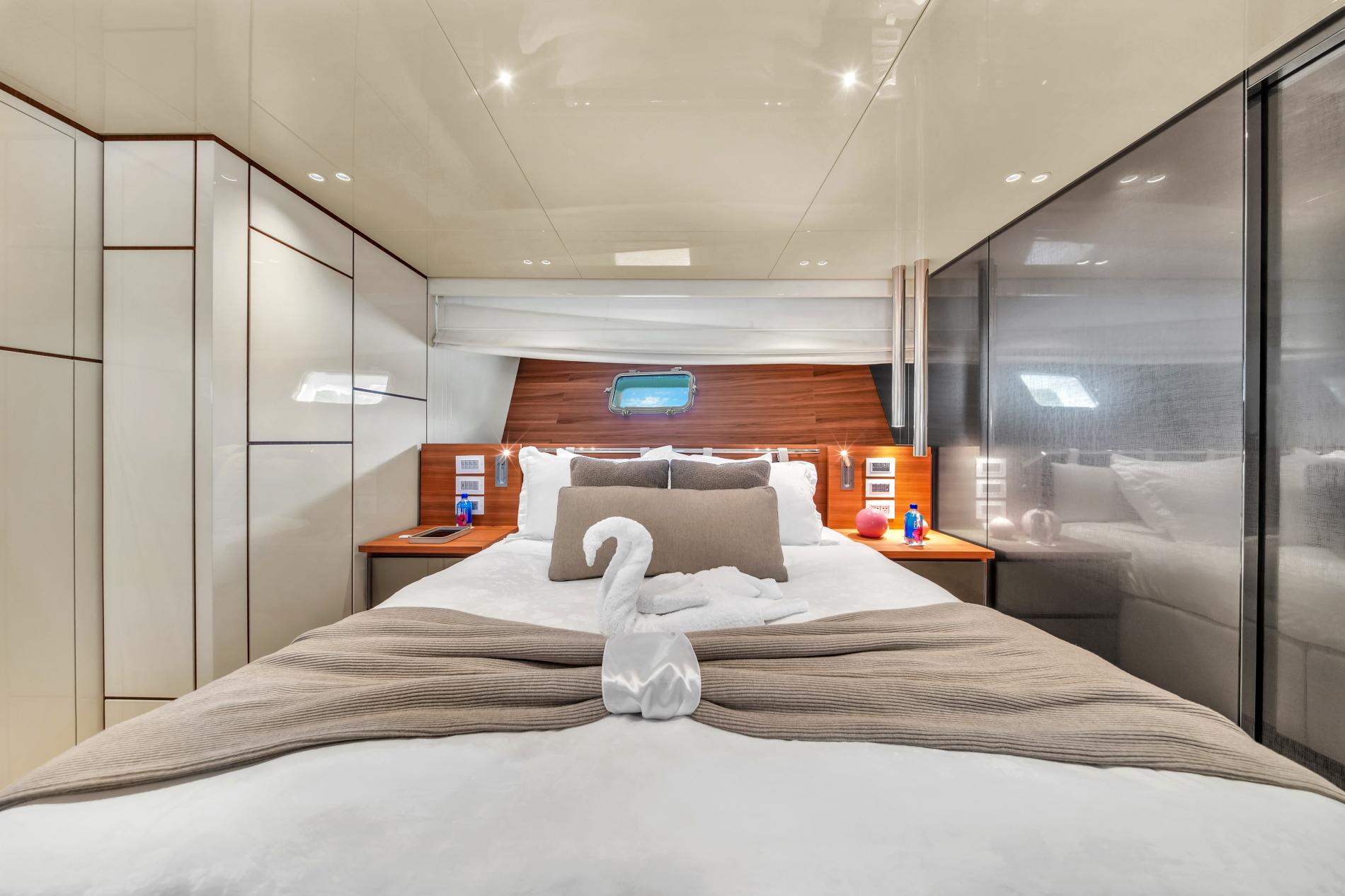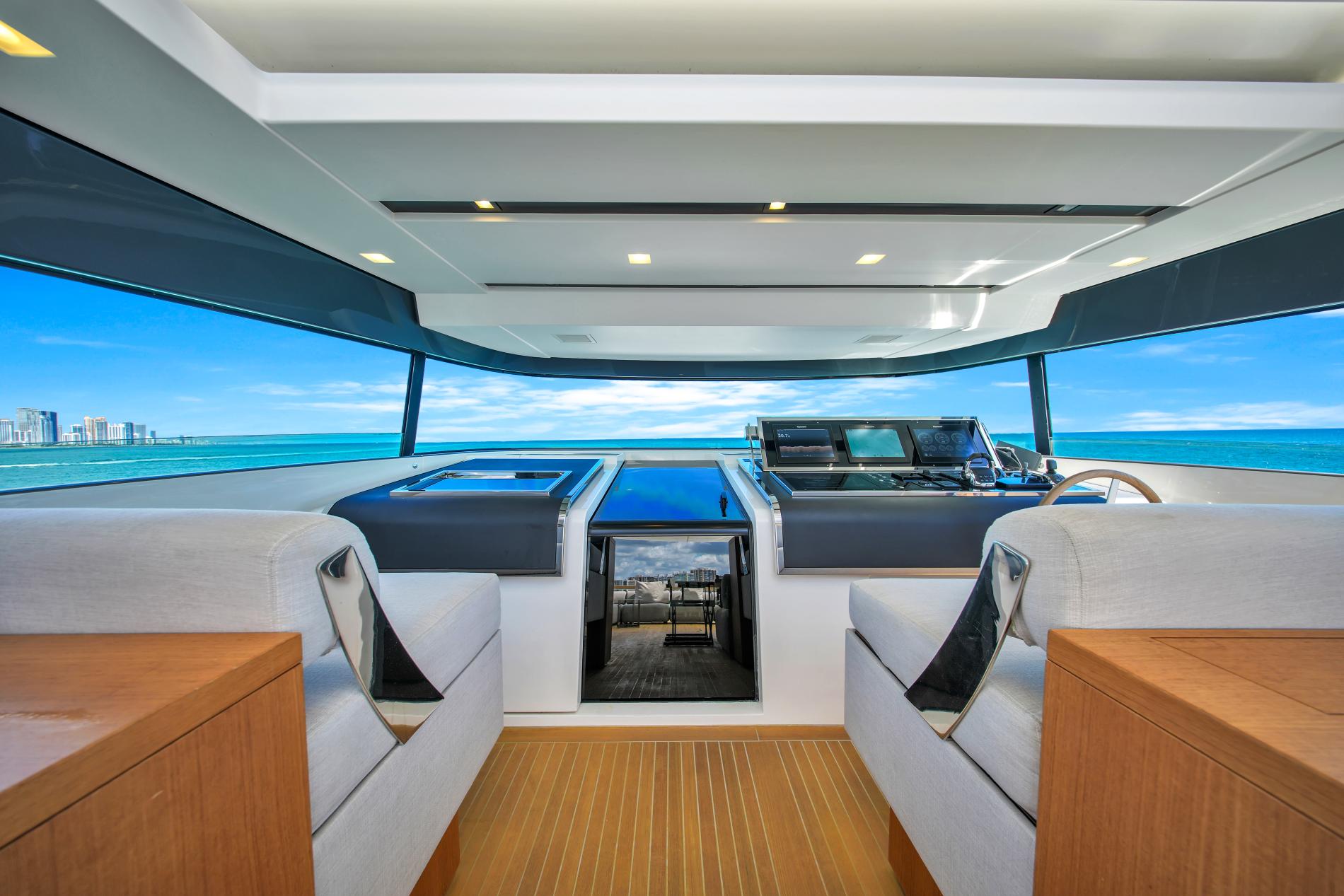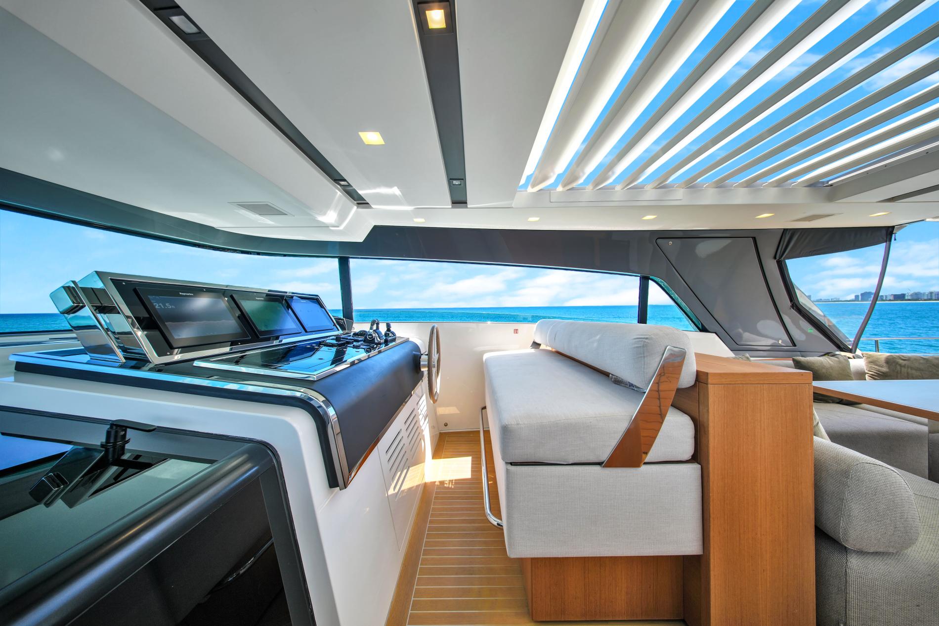- Adaptable Flybridge: The helm station is fully enclosed, with windows that open at the press of a button. An electric hardtop and modular sun lounge offer more options for relaxation.