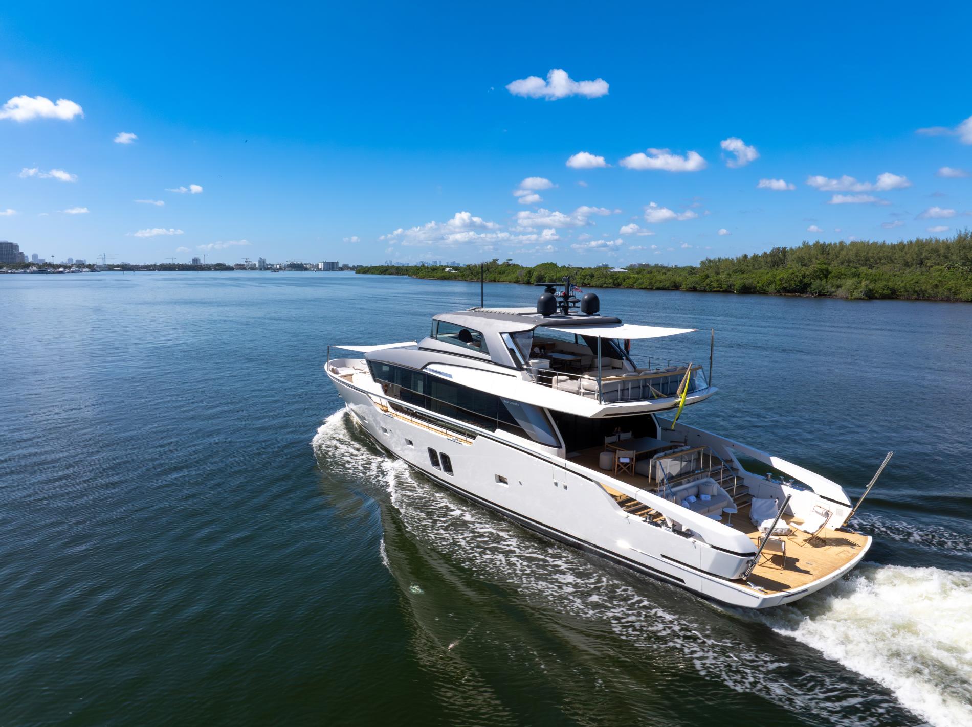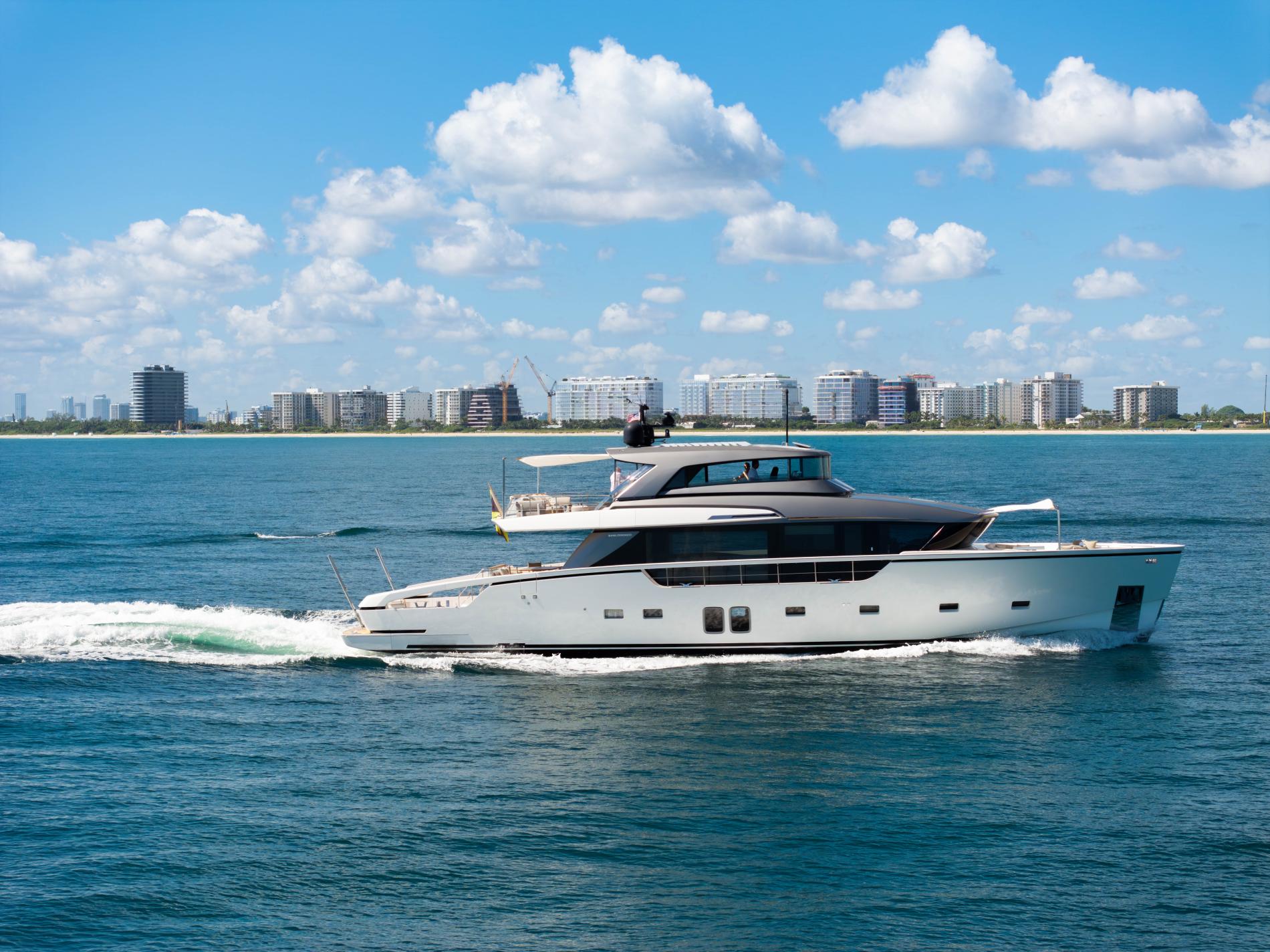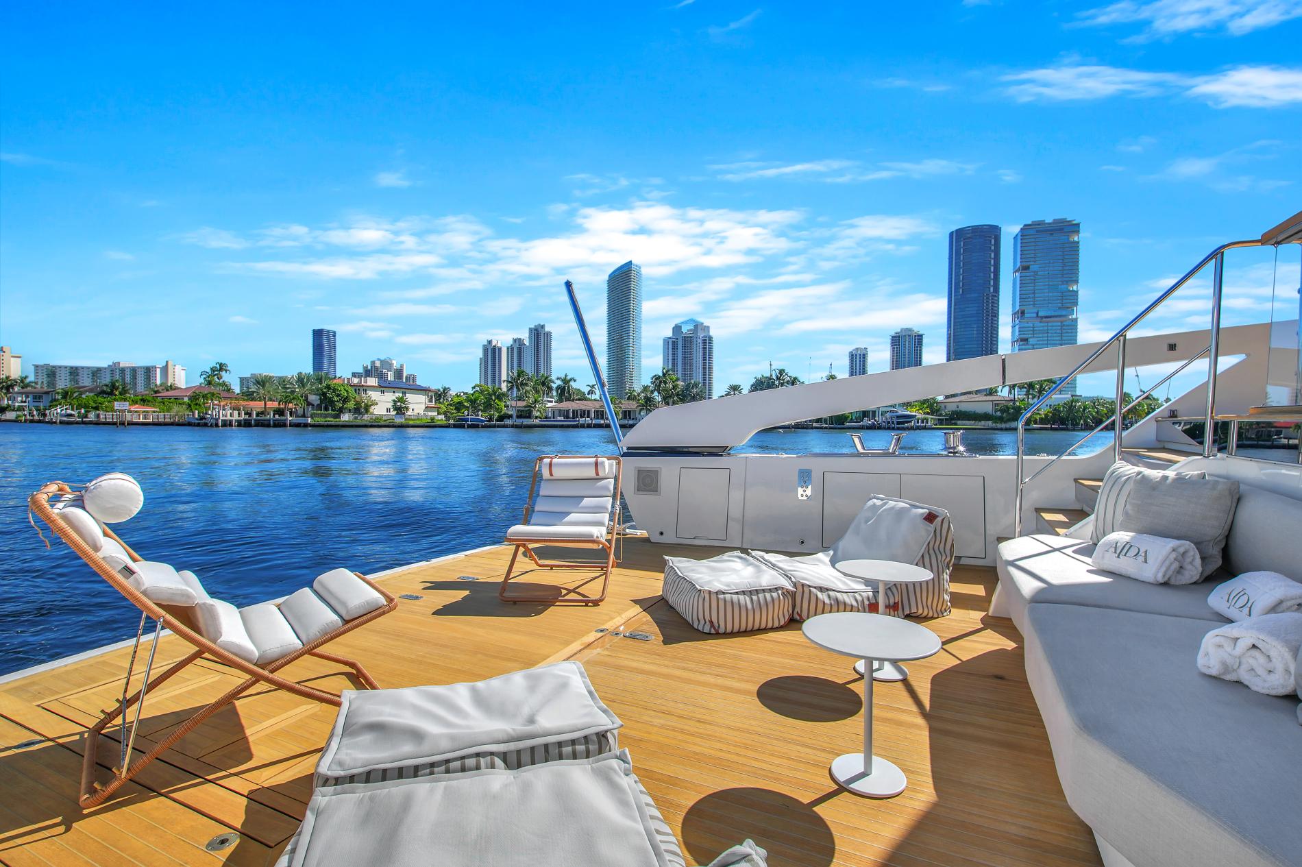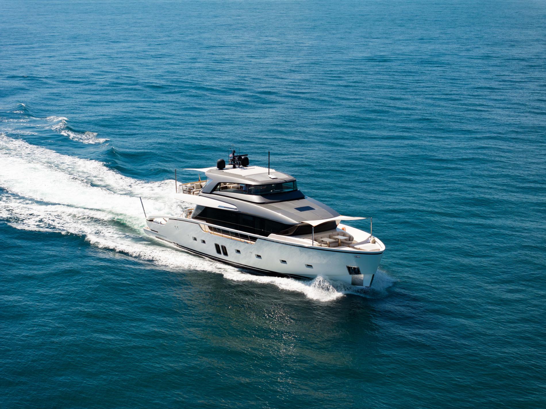 AIDA, part of Sanlorenzo’s SX88 series, showcases a perfect blend of explorer spirit and flybridge luxury. Designed by Officina Italiana Design with interiors by Lissoni & Partners, this 27-meter yacht is a marvel in both form and function. Her main deck flows seamlessly, while the enclosed flybridge helm features retractable windows, offering versatility and comfort. Triple Volvo IPS drives and a shallow draft make AIDA ideal for island adventures, especially in South Florida’s inviting waters.