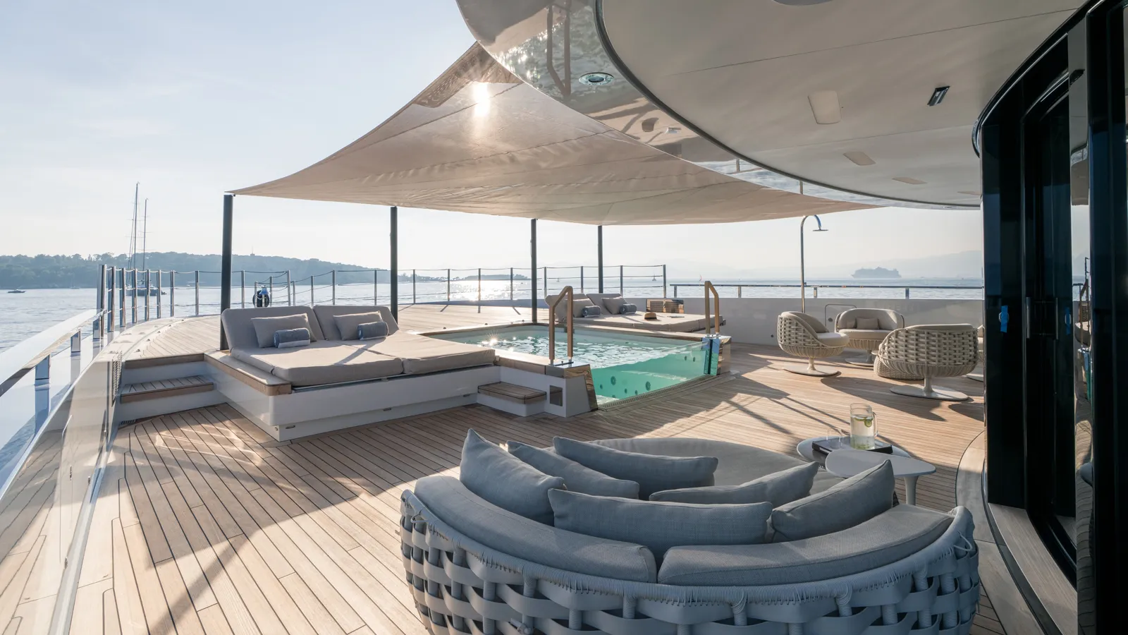 The lower deck hosts a beach club with fold‑out platforms, a lounge and bar, and direct access to the water. A wellness area with a hammam, treatment room and gym is also included, alongside crew accommodation for up to 16 and a tender garage.