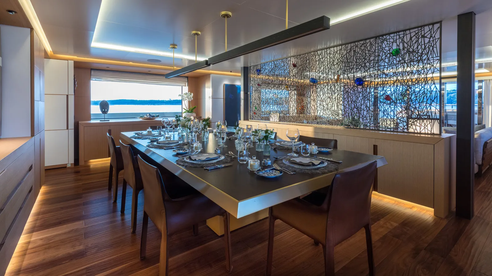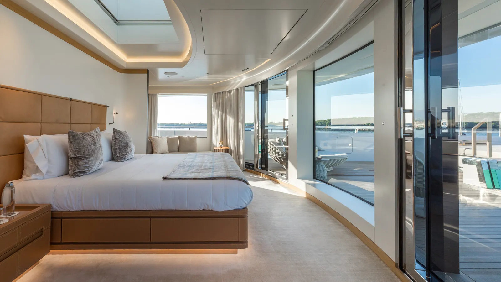 Alchemist accommodates up to 12 guests across five guest suites on the main deck and a dedicated owner’s deck. The owner’s deck includes a forward-facing suite, private lounge/study, his‑and‑hers bathrooms, dressing room, bar, skylounge and an exterior deck with a private pool/jacuzzi.