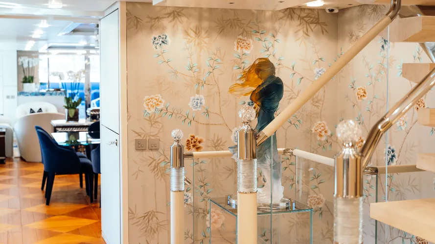 Exterior artistry designed by Mauro Micheli expertly melds Tiziana Vercellesi’s interior brilliance ensuring finalist placement within Boat International Design & Innovation Awards showcasing unsurpassed elegance across six guest cabins offering sanctuary exuding sophistication amidst leather parquet marbles silk wallpapers ebony veneers mother-of-pearl crystal handle accents melding Fendi loose furnishings throughout both inside out spaces accommodating twelve visitors accompanied ever-attentive eleven-member crew surpasses industry norms guaranteeing unparalleled service quality onboard all times during any expedition taken forward wards toward distant horizons beckoning always anew!