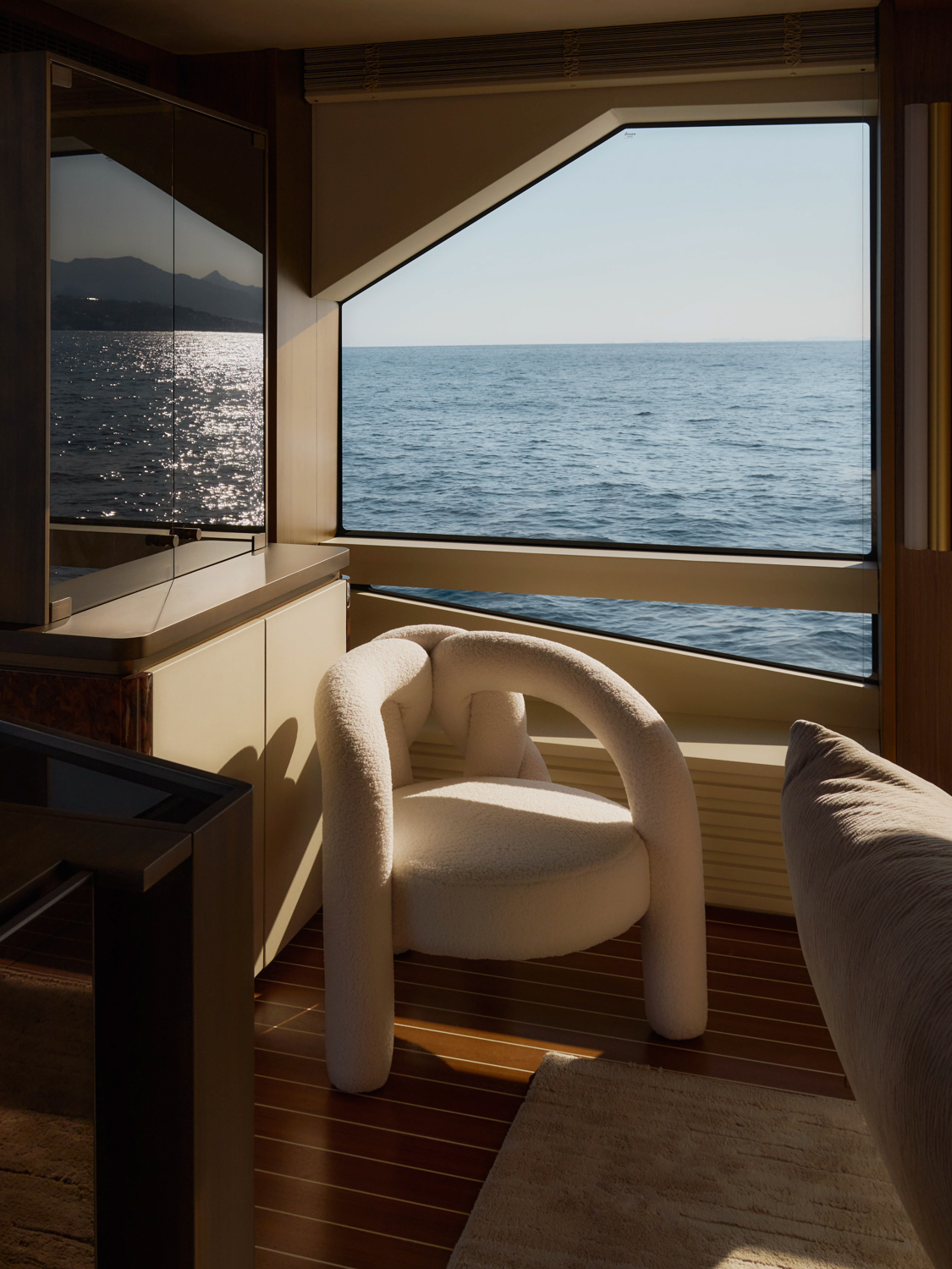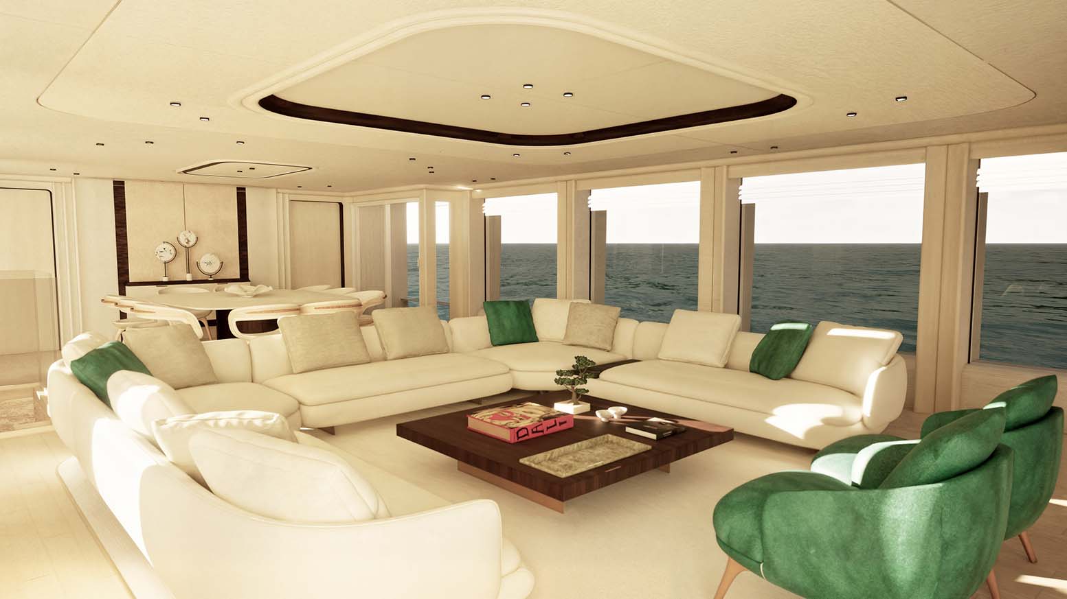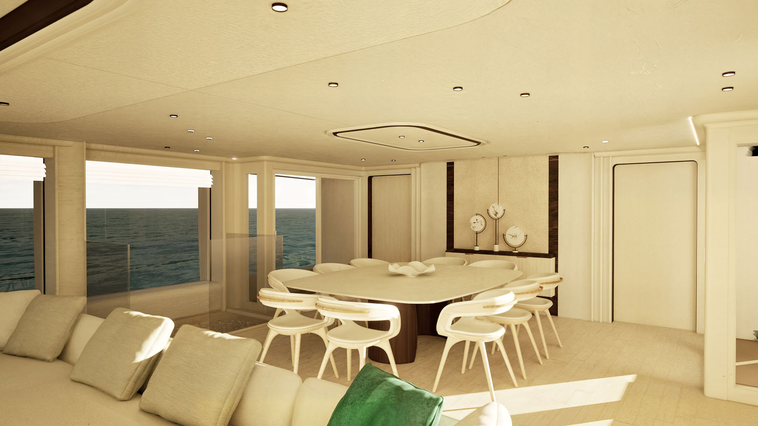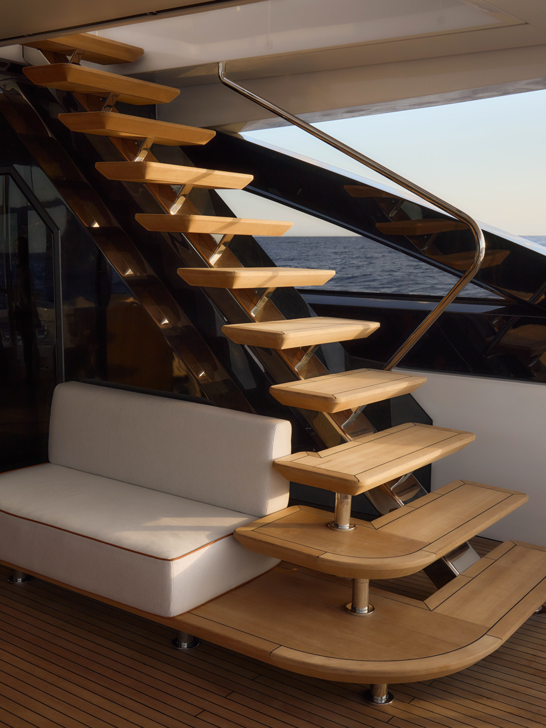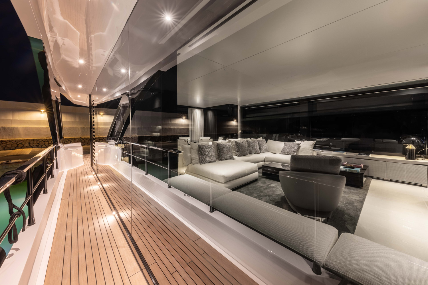 4. The yacht offers seamless indoor–outdoor flow thanks to large glazing and sliding doors.