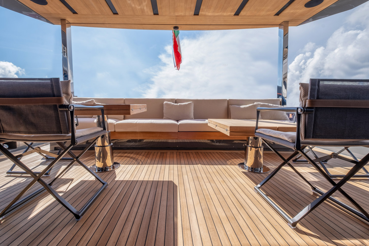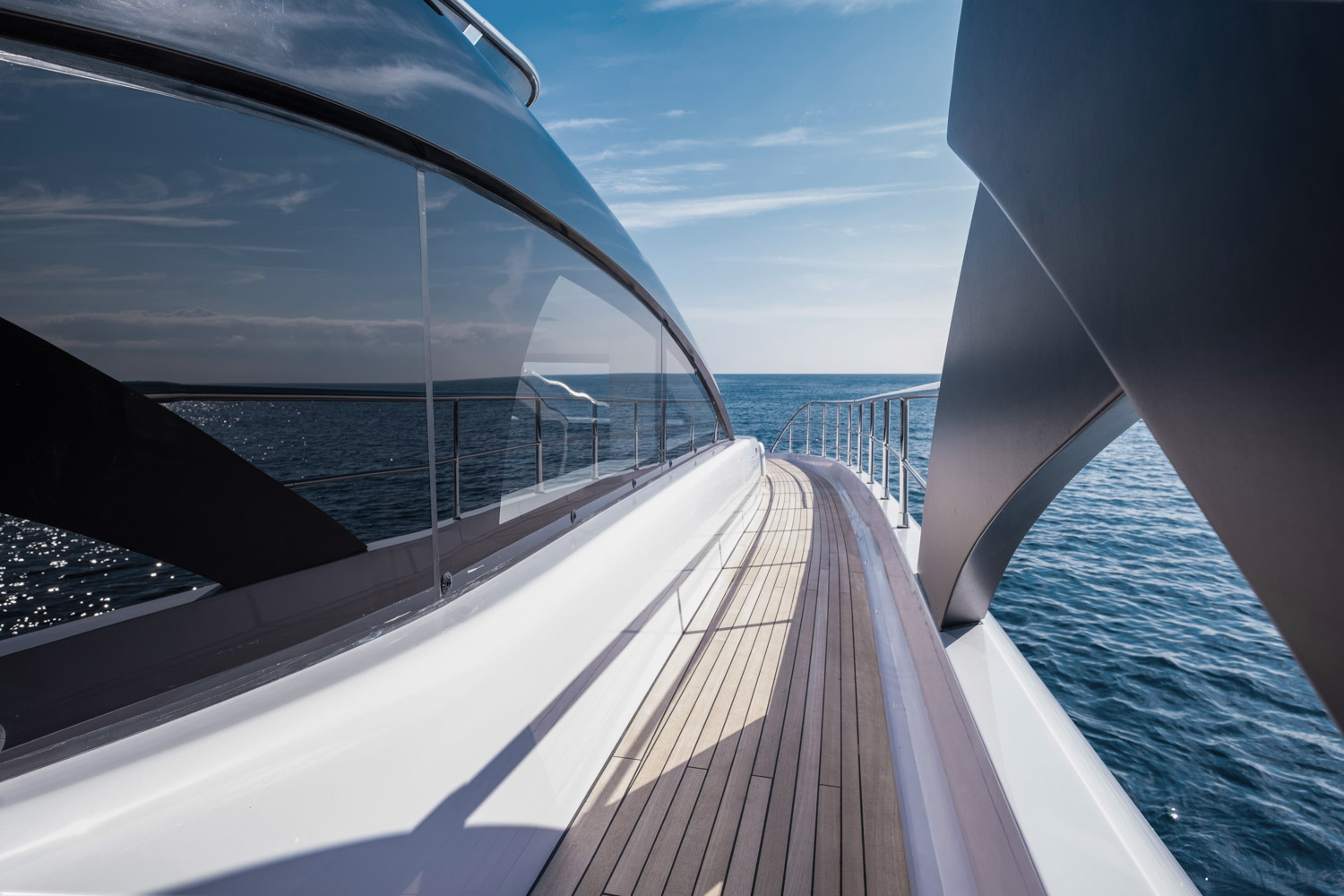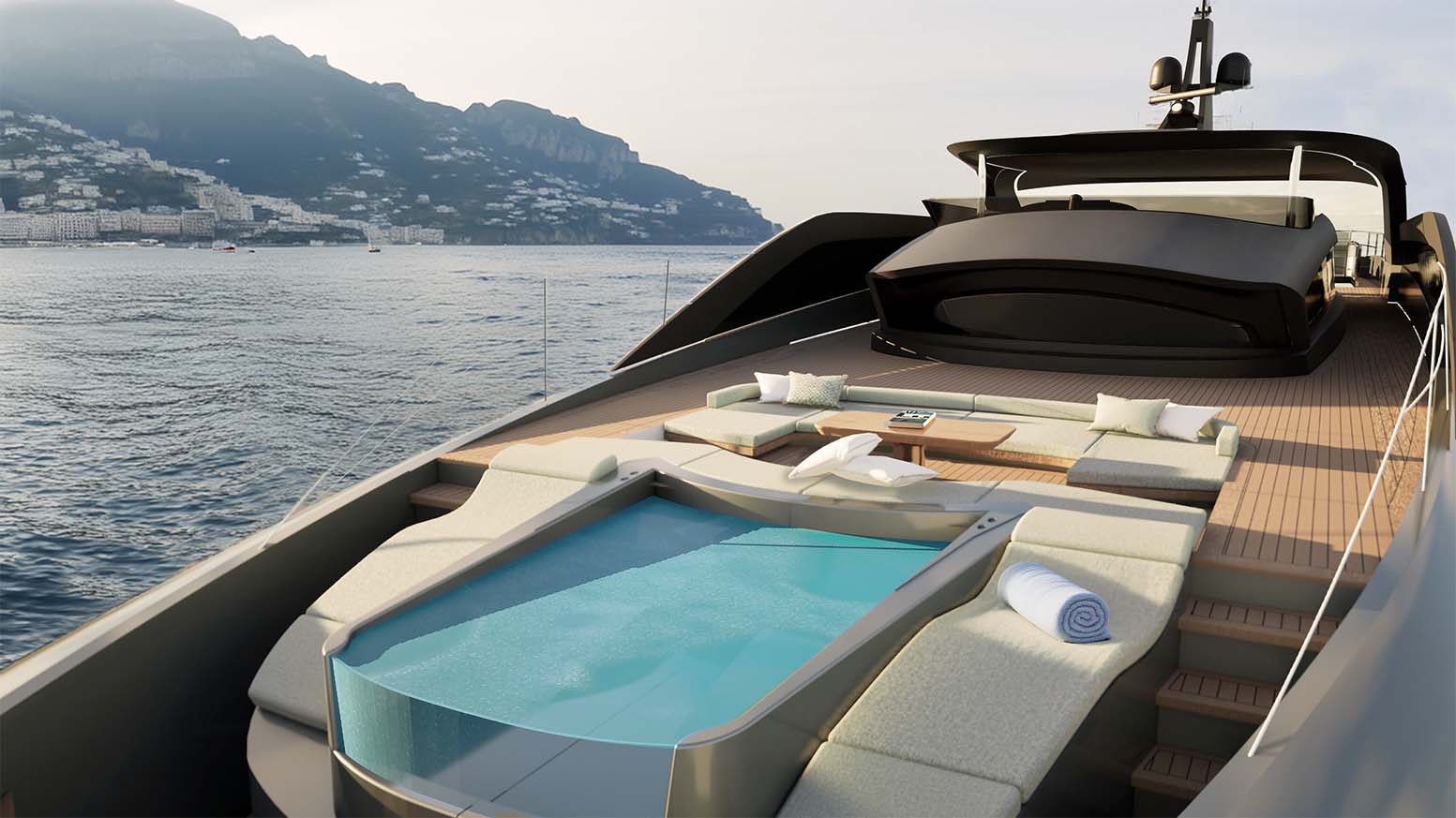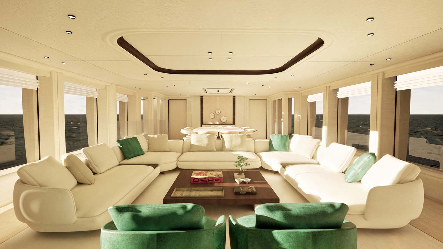 4. The yacht offers seamless indoor–outdoor flow thanks to large glazing and sliding doors.