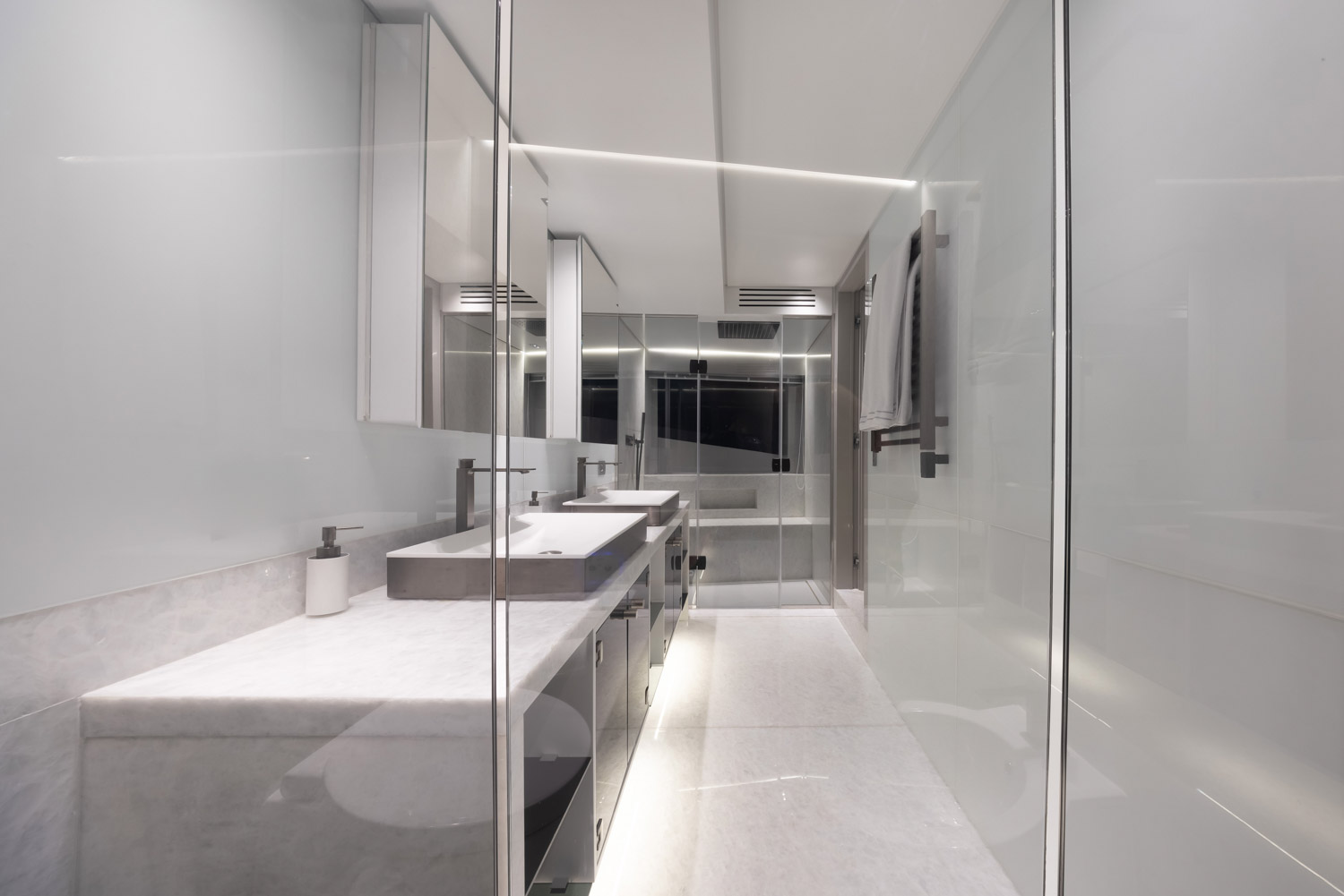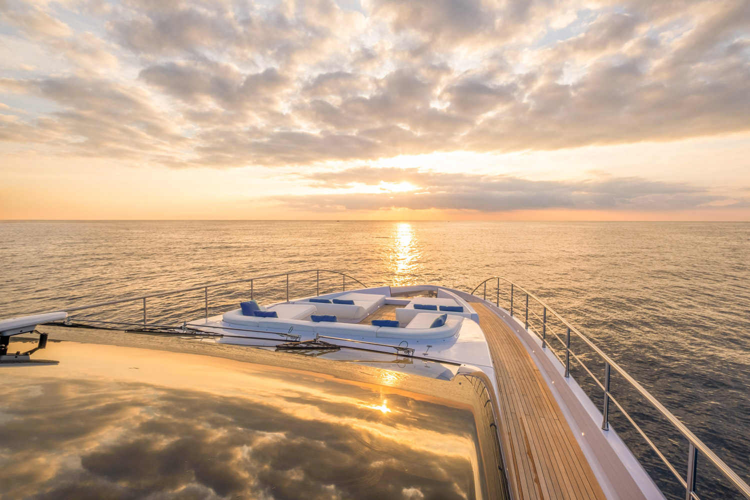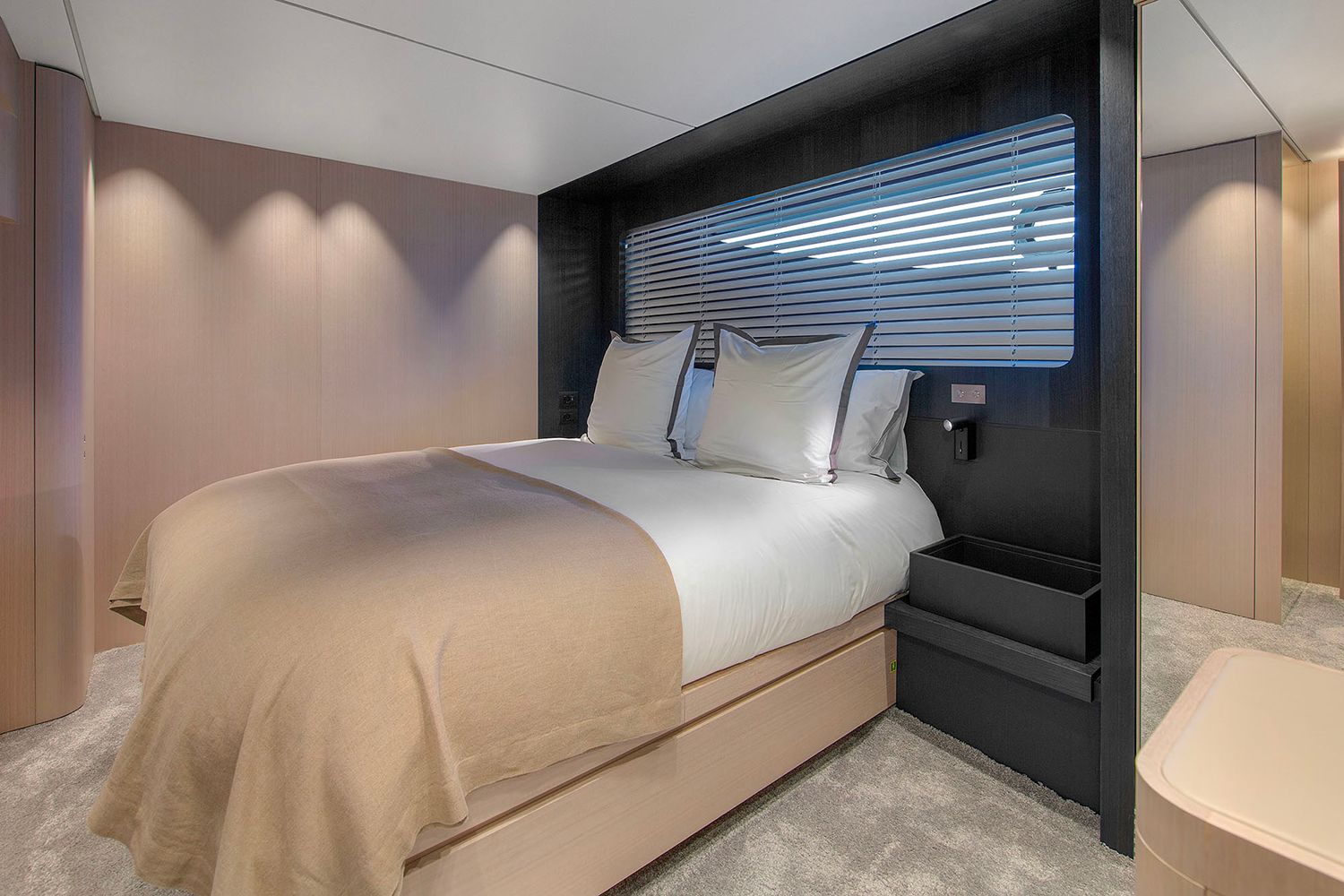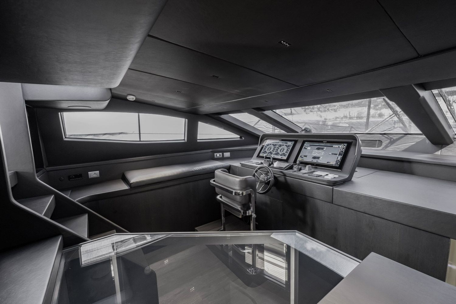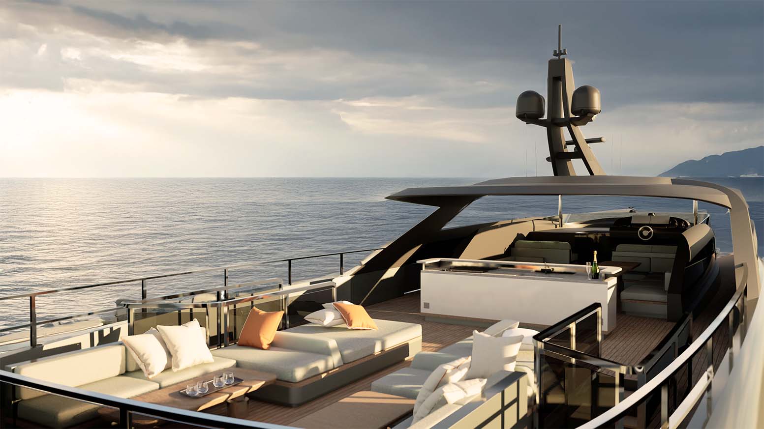 4. The yacht offers seamless indoor–outdoor flow thanks to large glazing and sliding doors.
