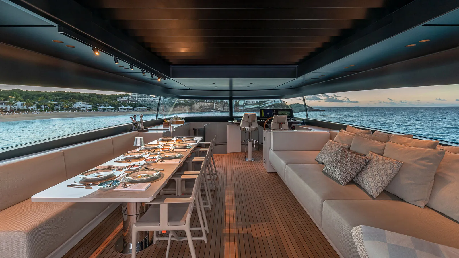 - Interior: Styled by Lissoni Associati, the interiors boast a modern, minimalistic flair. Enjoy open-plan dining, a spacious main saloon with sliding glass doors, and a central spiral staircase connecting all decks.