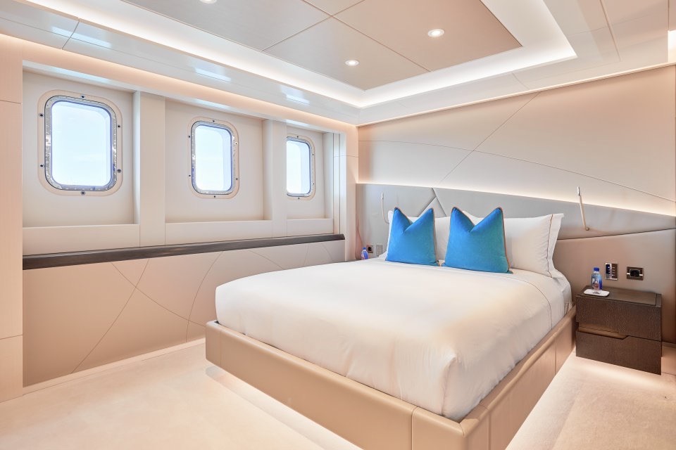 Accommodating up to 10 guests, ARKADIA’s five staterooms are spacious and refined. The main deck master spans the full beam and features a king-size bed, seating area, private study, his-and-hers dressing areas, and a large bathroom. Three double staterooms and a flexible twin/double cabin with Pullman are located on the lower deck, each with ensuite and oversized portholes for plenty of daylight.