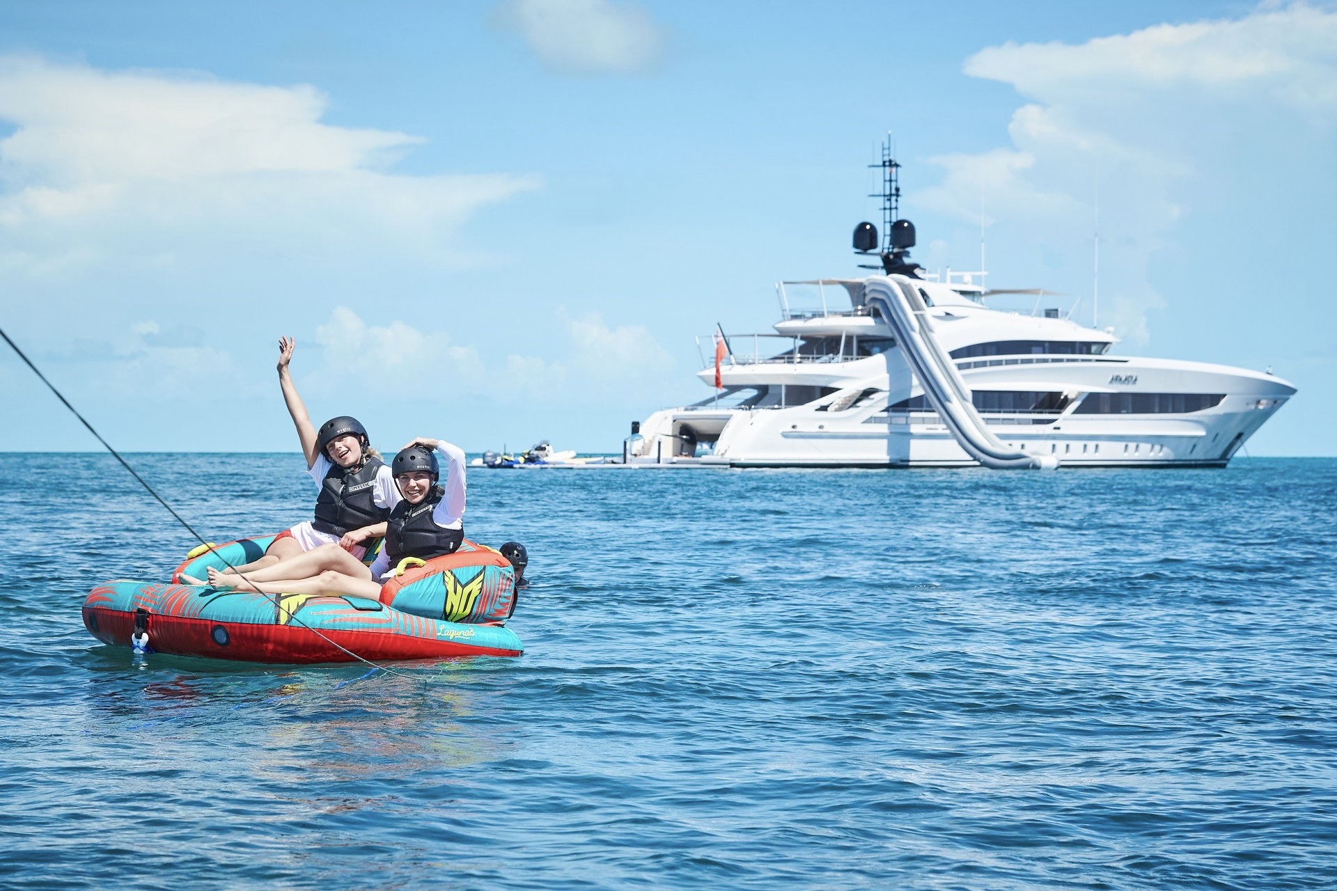 The fun continues with a packed toy box: SeaDoo Jet Ski, water skis, wakeboards, towables, kite surfer, kayaks, scuba and snorkel gear, electric bikes, and an inflatable slide. The beach club makes access easy, and onboard instructors are available for diving and kiteboarding lessons.