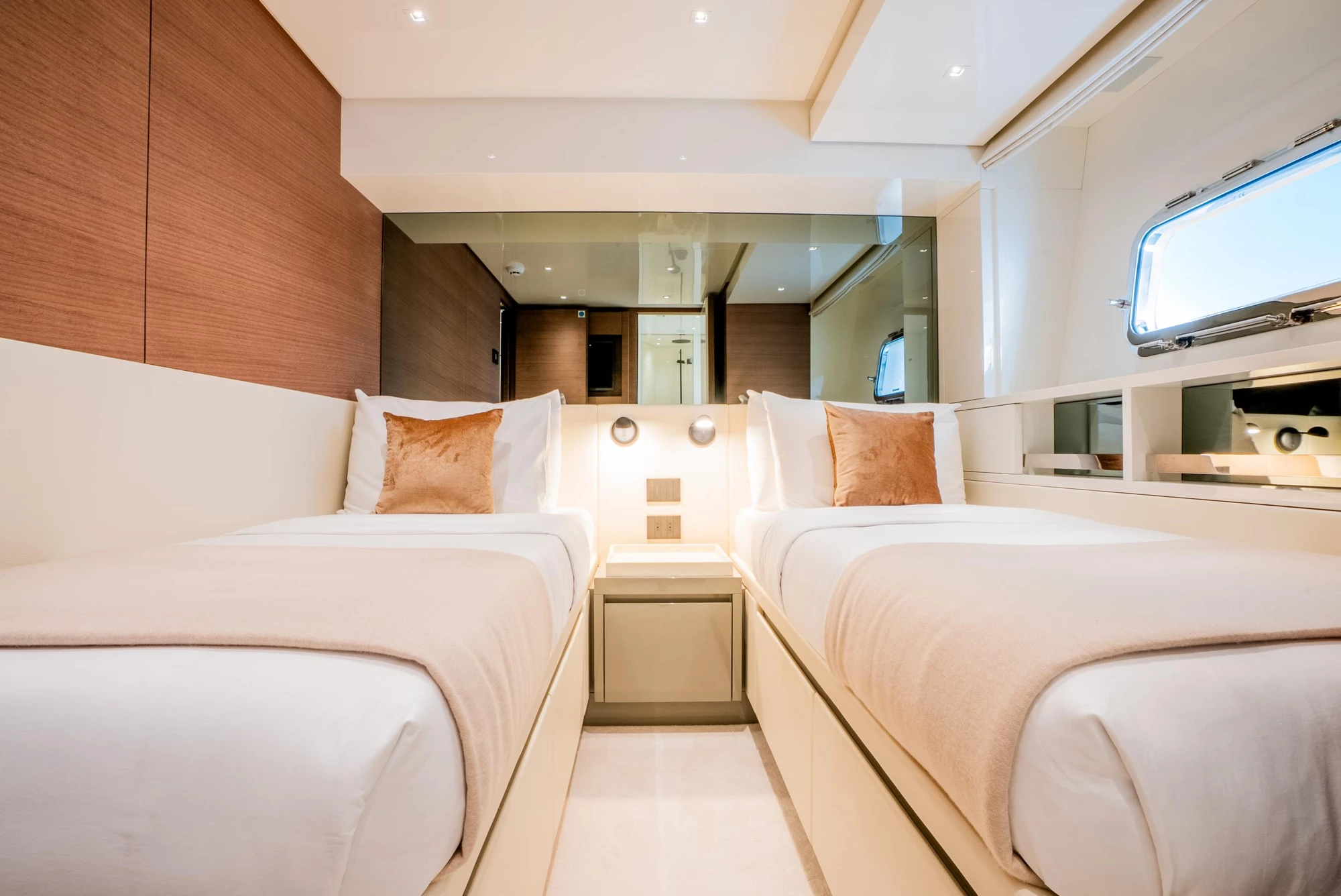 Accommodation is offered for 8 guests in 4 ensuite staterooms, including a full-beam Owner’s Stateroom, a VIP suite, and two twin staterooms. Crew quarters are forward for 4.