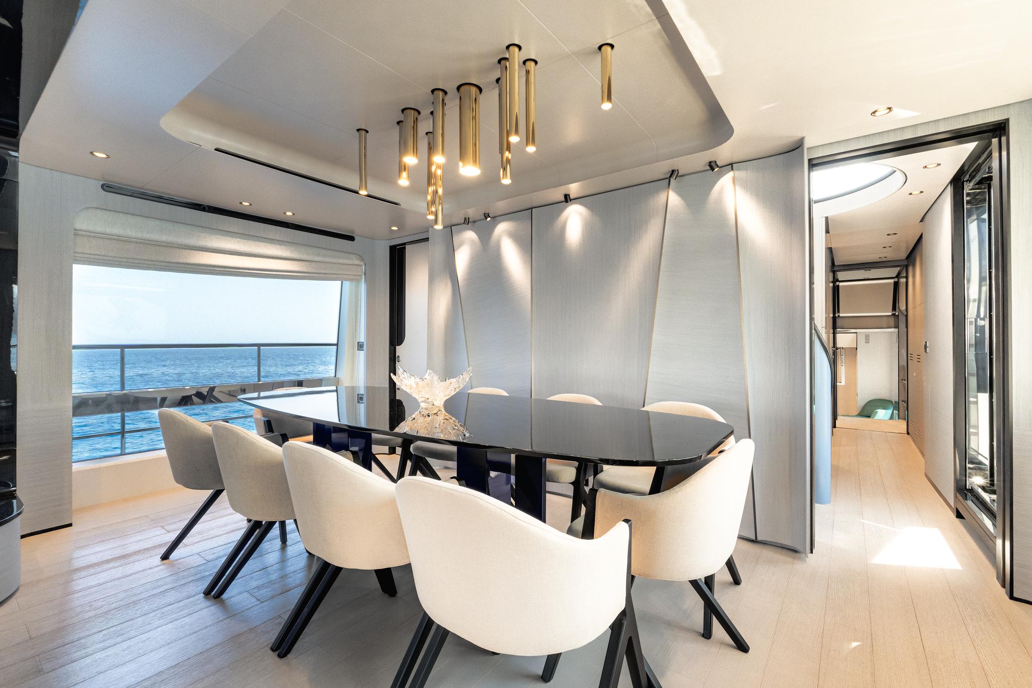Designed to host up to 10 guests across five luxurious suites, including a master stateroom on the main deck, the yacht also offers accommodation for four crew, ensuring a seamless and relaxed experience on board.