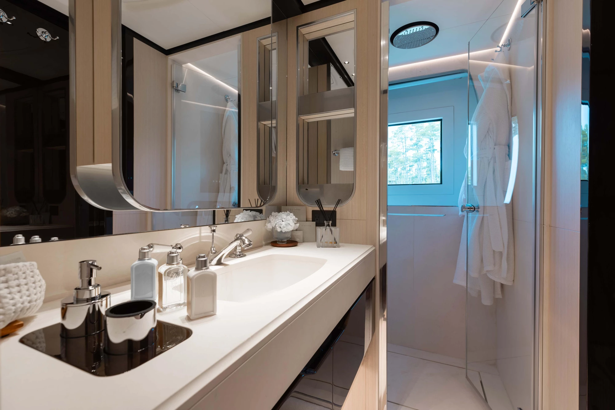 Inside, Giorgio Cassetta’s interiors blend warmth with modern style, accommodating up to 10 guests in 5 luxurious staterooms. The full-beam on-deck Owner’s Stateroom guarantees privacy, complemented by two queen VIP suites and two twin staterooms.