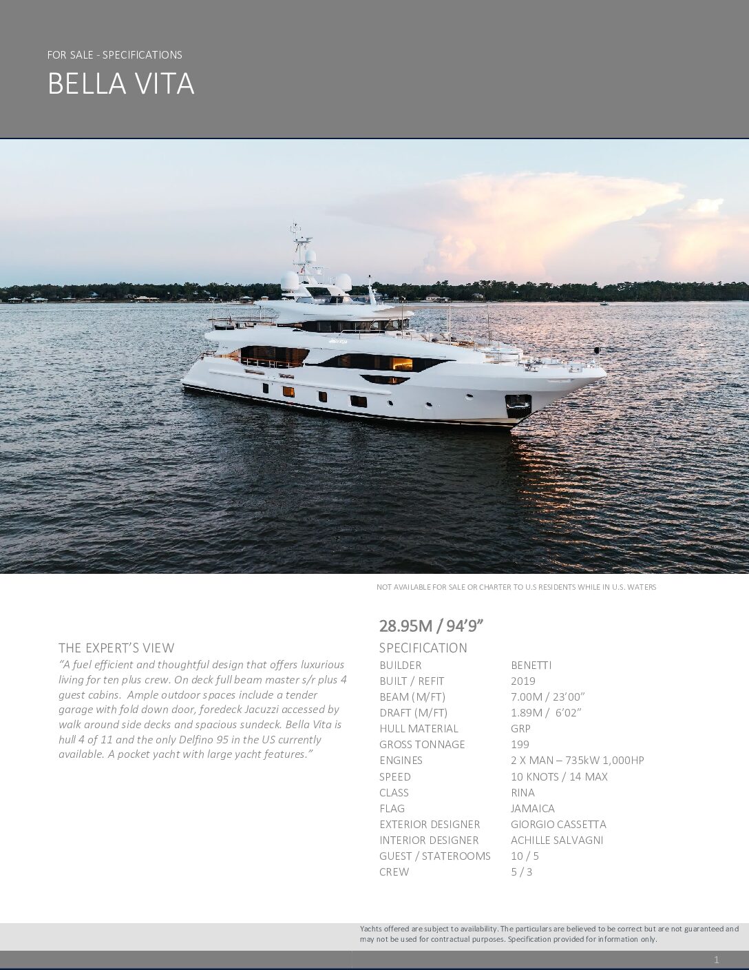 Powered by efficient MAN engines, BELLA VITA glides effortlessly at 13 knots, with stabilizers ensuring smooth performance even at anchor. As hull 4 of the limited Delfino 95 series, and the only one available in the U.S., BELLA VITA offers an exclusive mix of pedigree, practicality, and prestige.