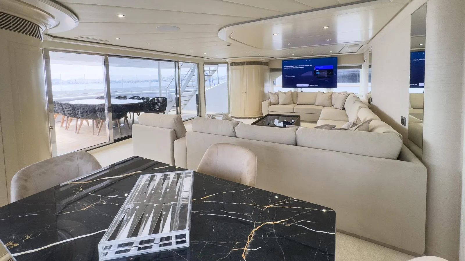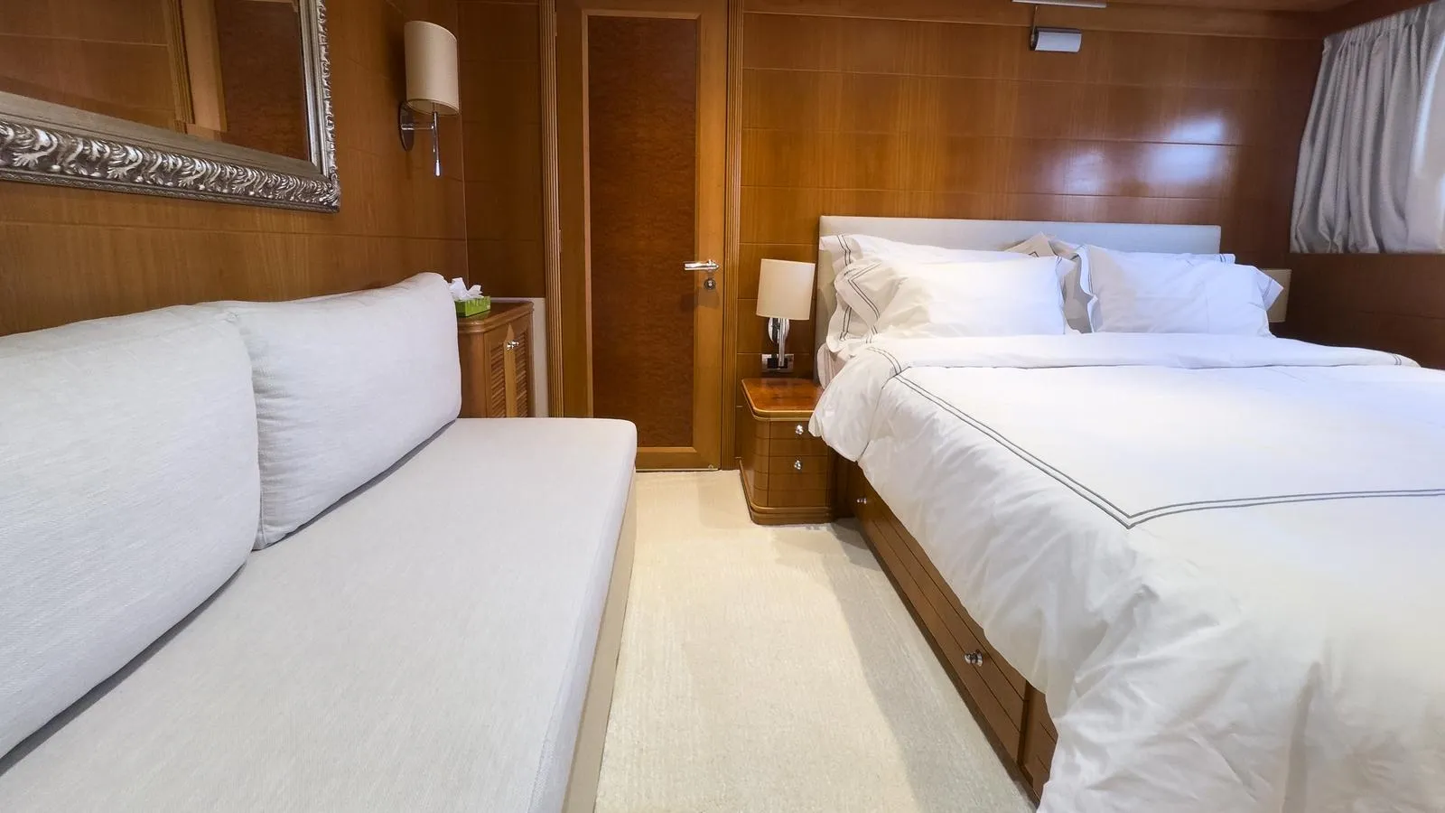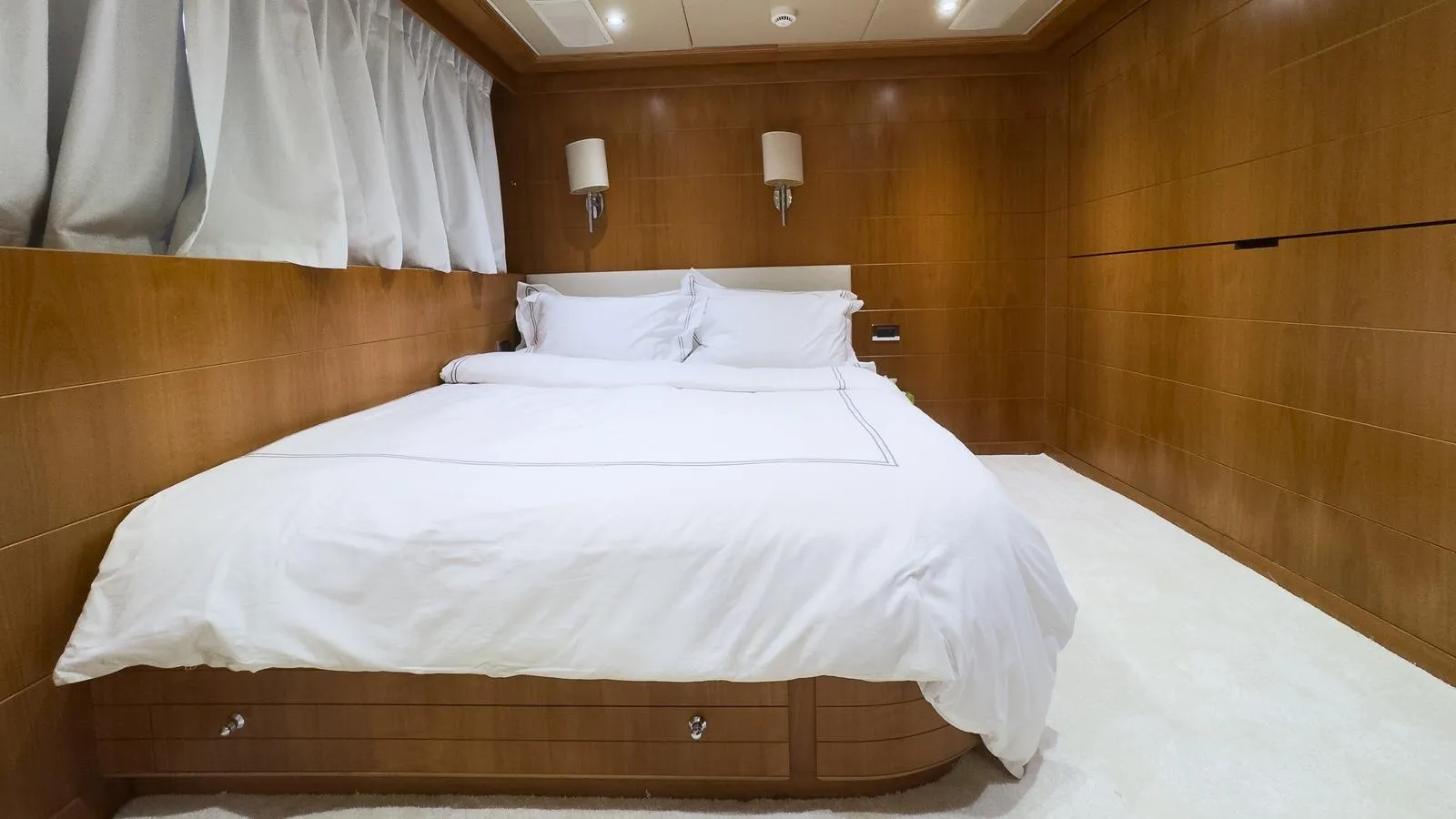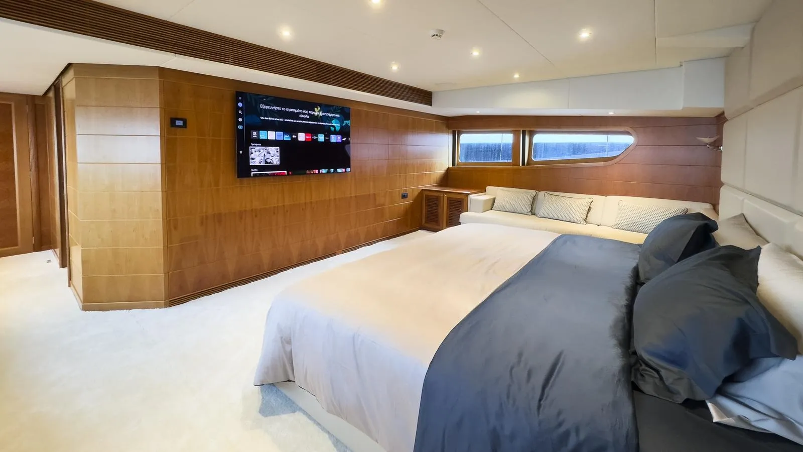 Designed by Omega Architects, her contemporary interior feels spacious thanks to an efficient layout and generous volume. Benik accommodates up to 16 guests in seven cabins, with crew quarters for eight.