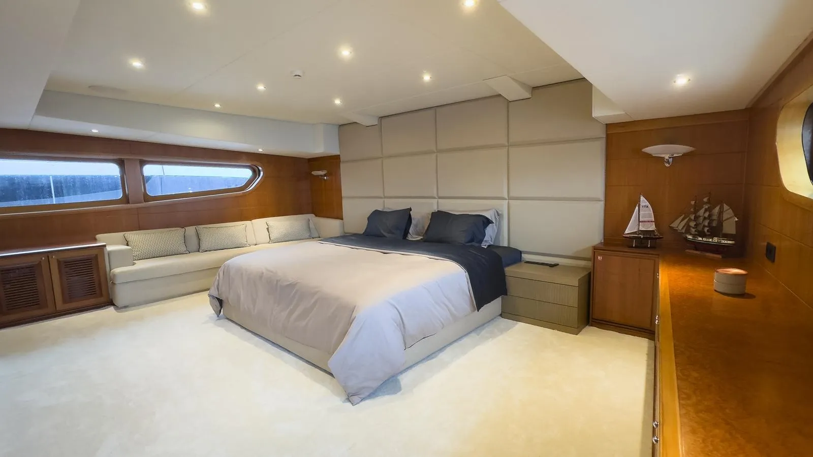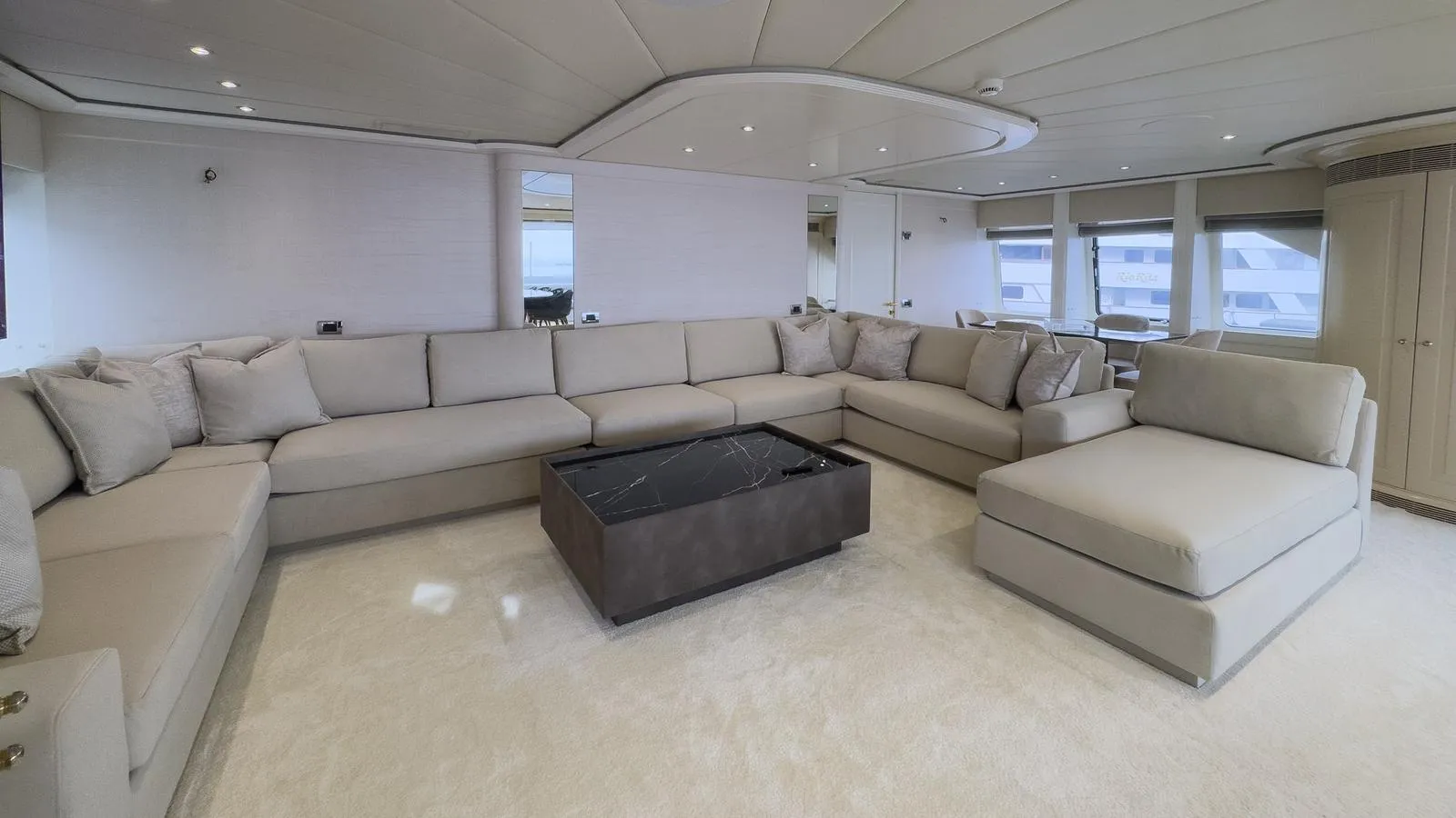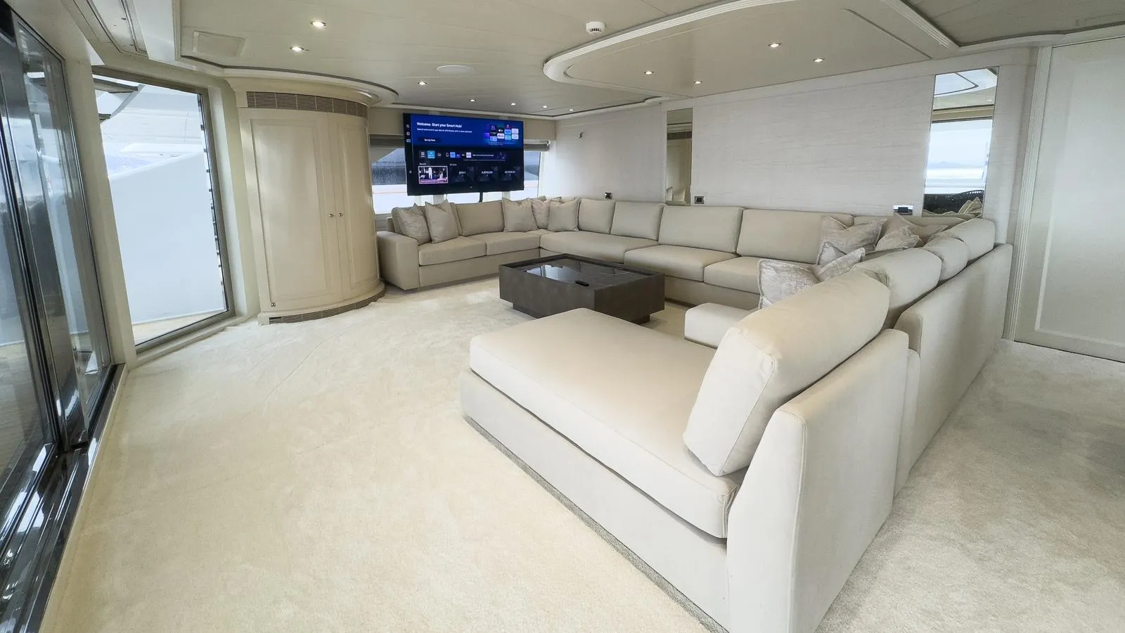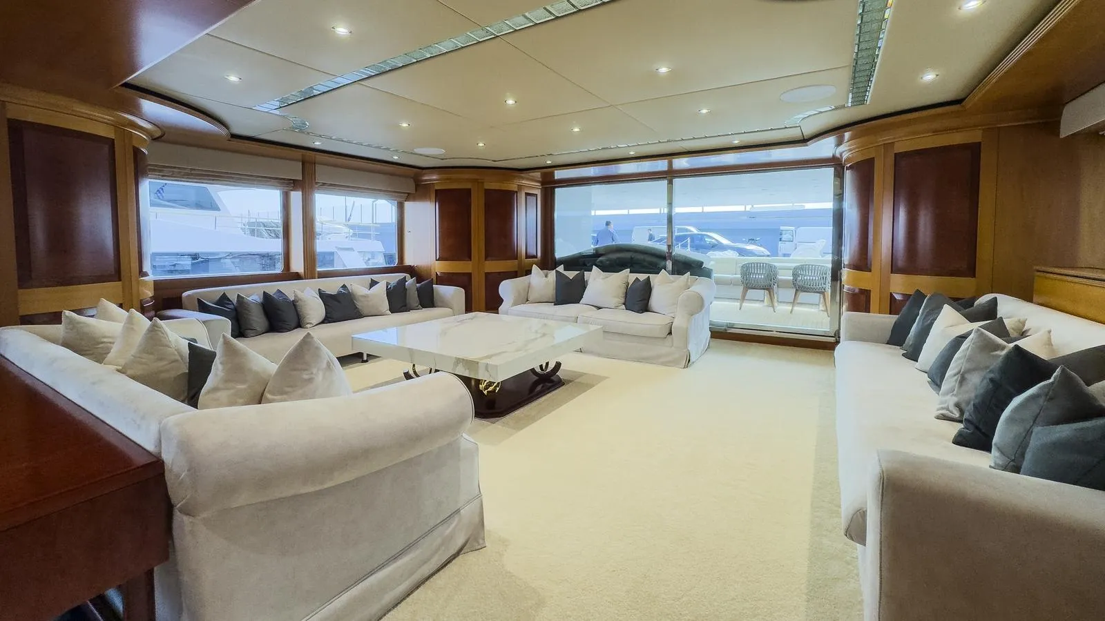 Powered by twin MTU 12V 4000 M90 engines, the 364GT yacht cruises at 18 knots and reaches 22 knots. Newly installed four‑square‑metre fin stabilisers enhance comfort both at anchor and underway.