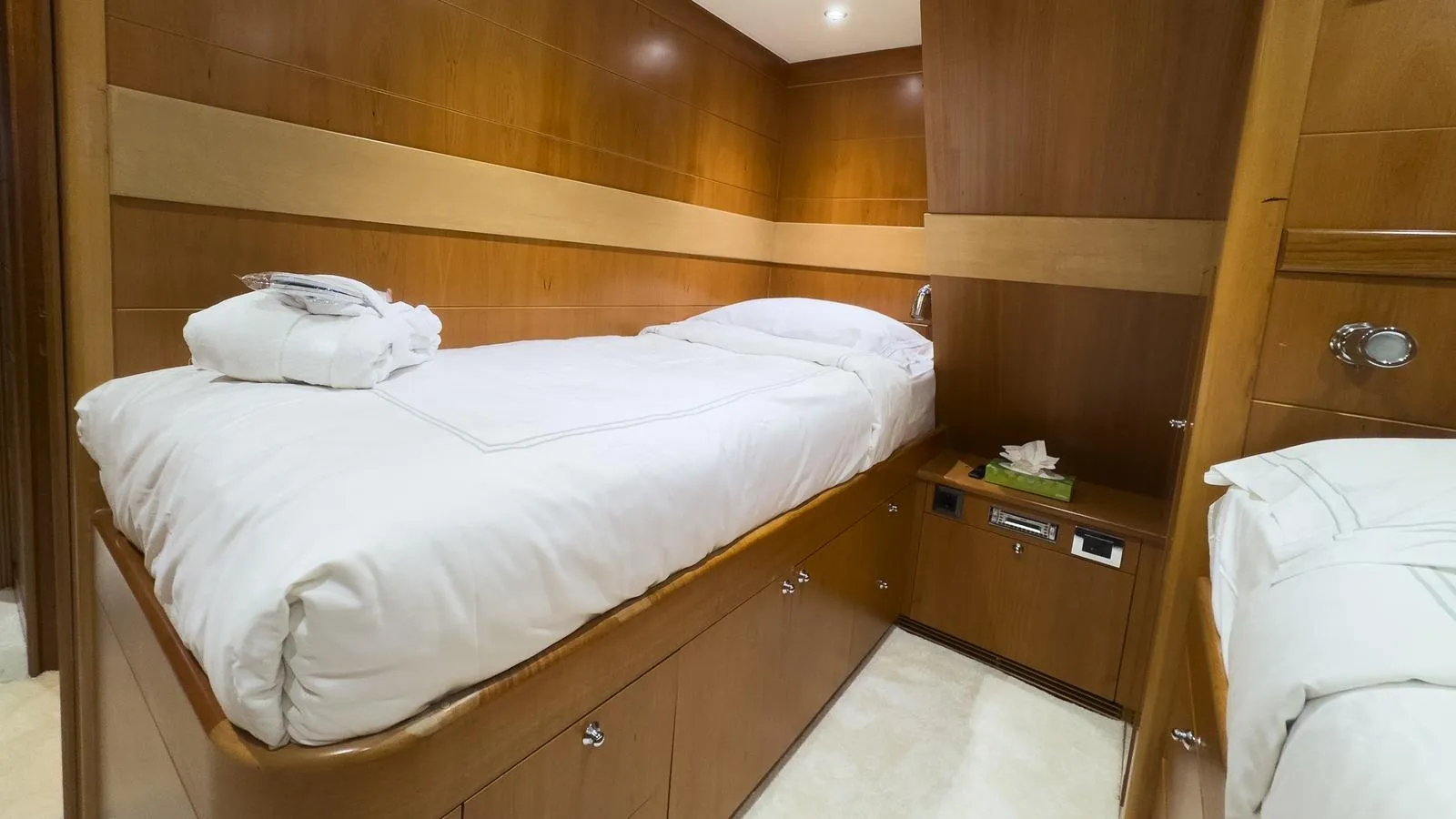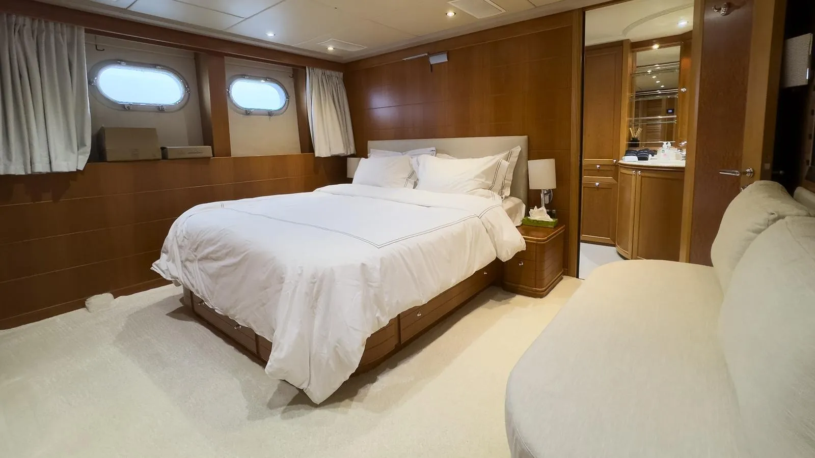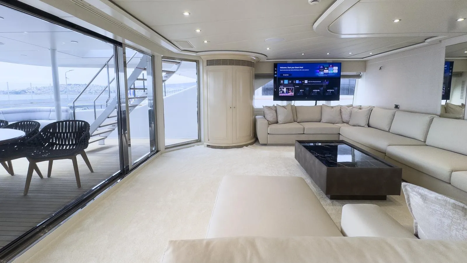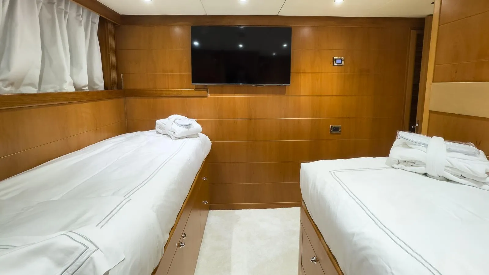 Powered by twin MTU 12V 4000 M90 engines, the 364GT yacht cruises at 18 knots and reaches 22 knots. Newly installed four‑square‑metre fin stabilisers enhance comfort both at anchor and underway.