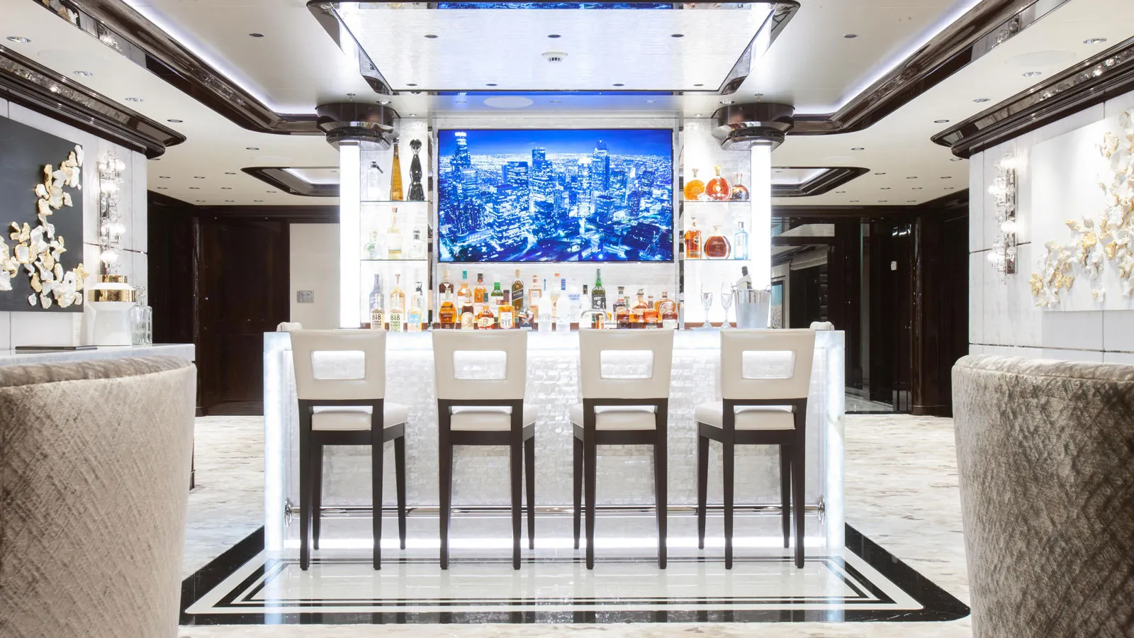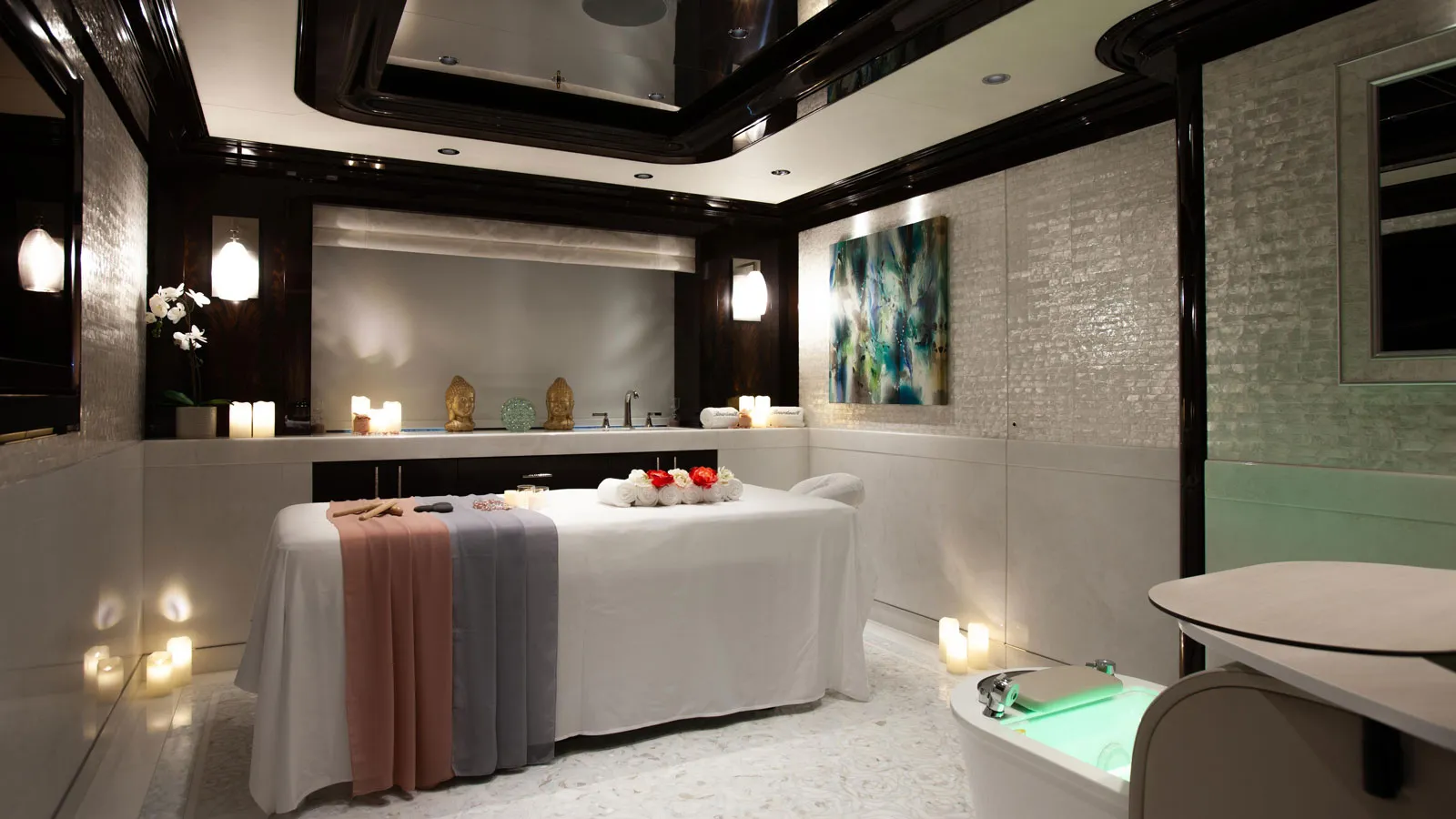 The lower deck hosts a “beach and fitness club” equipped with fitness gear, a treatment room, sauna, dive locker, and watersports options. A marble bar near the water adds to the appeal.