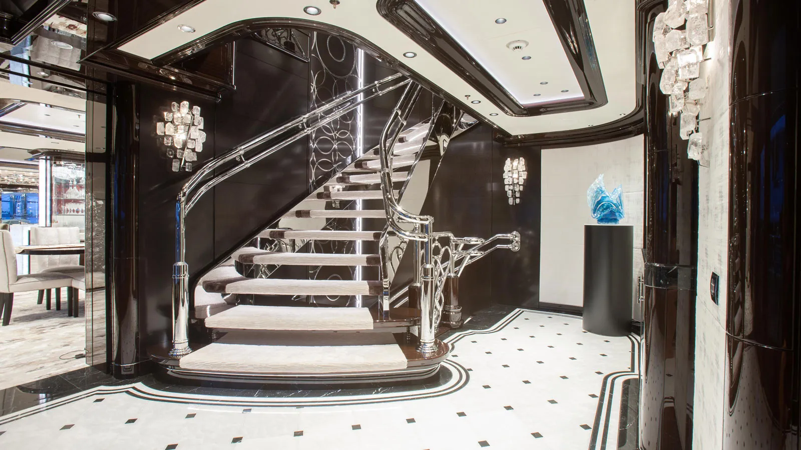 A standout feature is Boardwalk’s amenities, perfect for multi-generational enjoyment. The main saloon features twin lounges, a sit-up bar with a TV, and opal white marble accents. With six bars and a convenient lift, guests can easily navigate between decks.