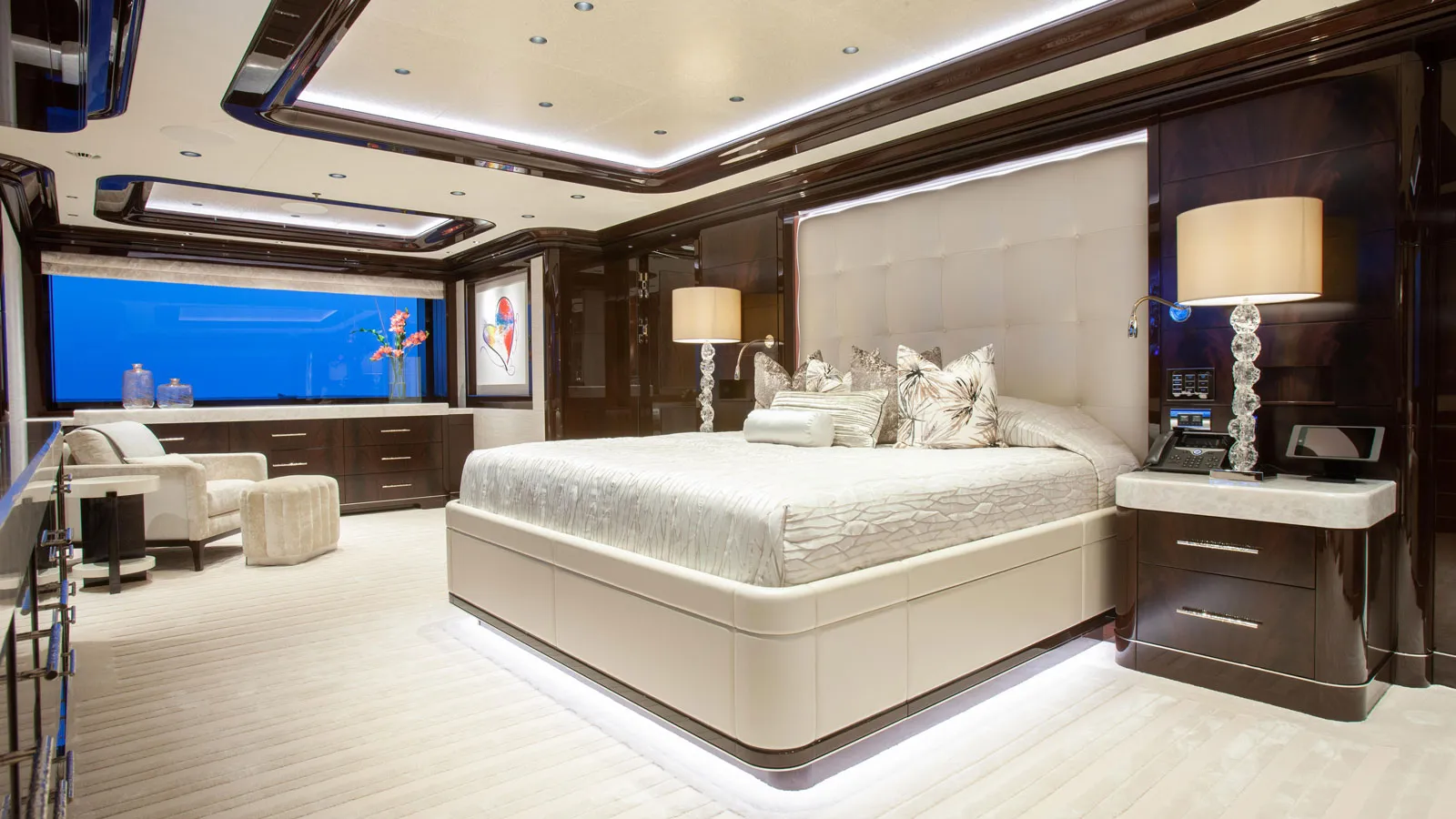 Boardwalk can accommodate 14 guests across seven spacious cabins. The main deck owner’s apartment boasts a lounge and balconies, with his and hers en suites and dressing rooms. Additional cabins are spread across the bridge and lower decks.
