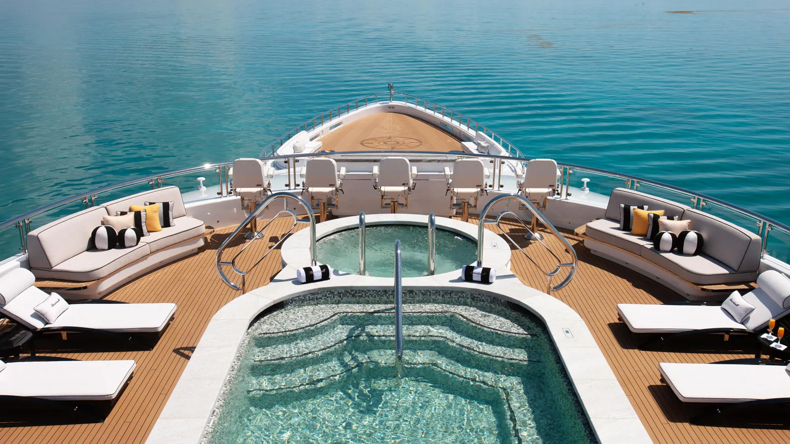 The sundeck dazzles with a six-meter mosaic-tiled pool, hot tub, sun loungers, and a bar. The observation deck offers breathtaking views, perfect for relaxation.