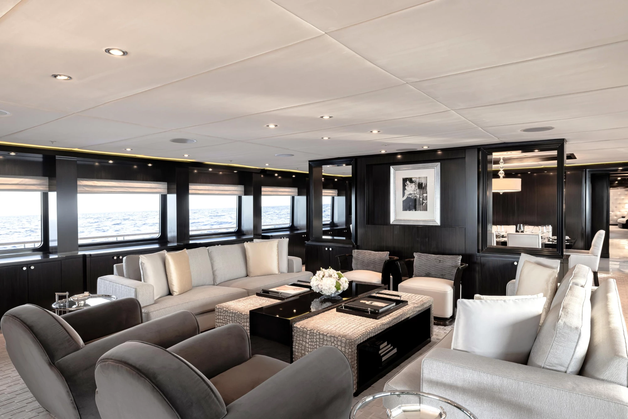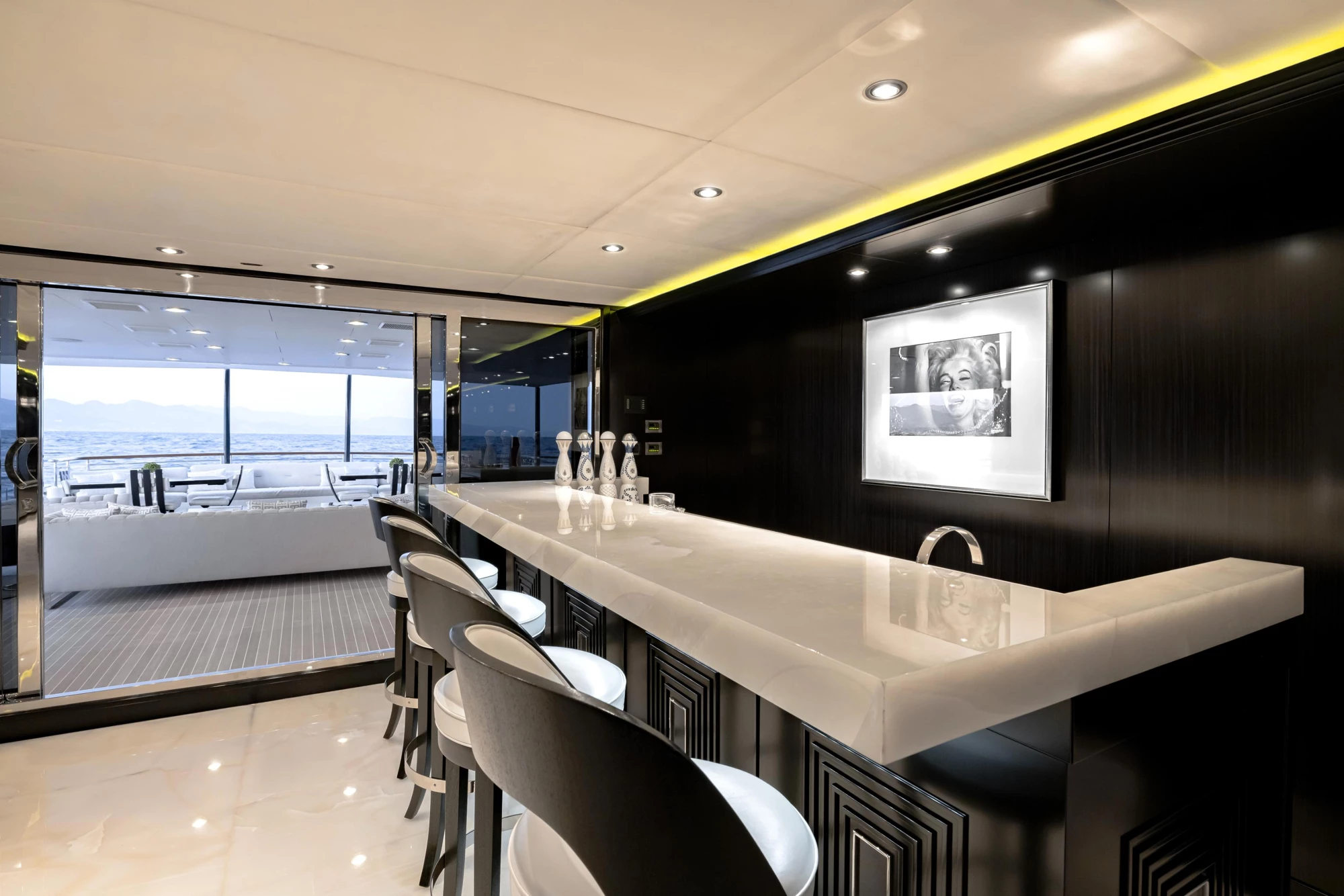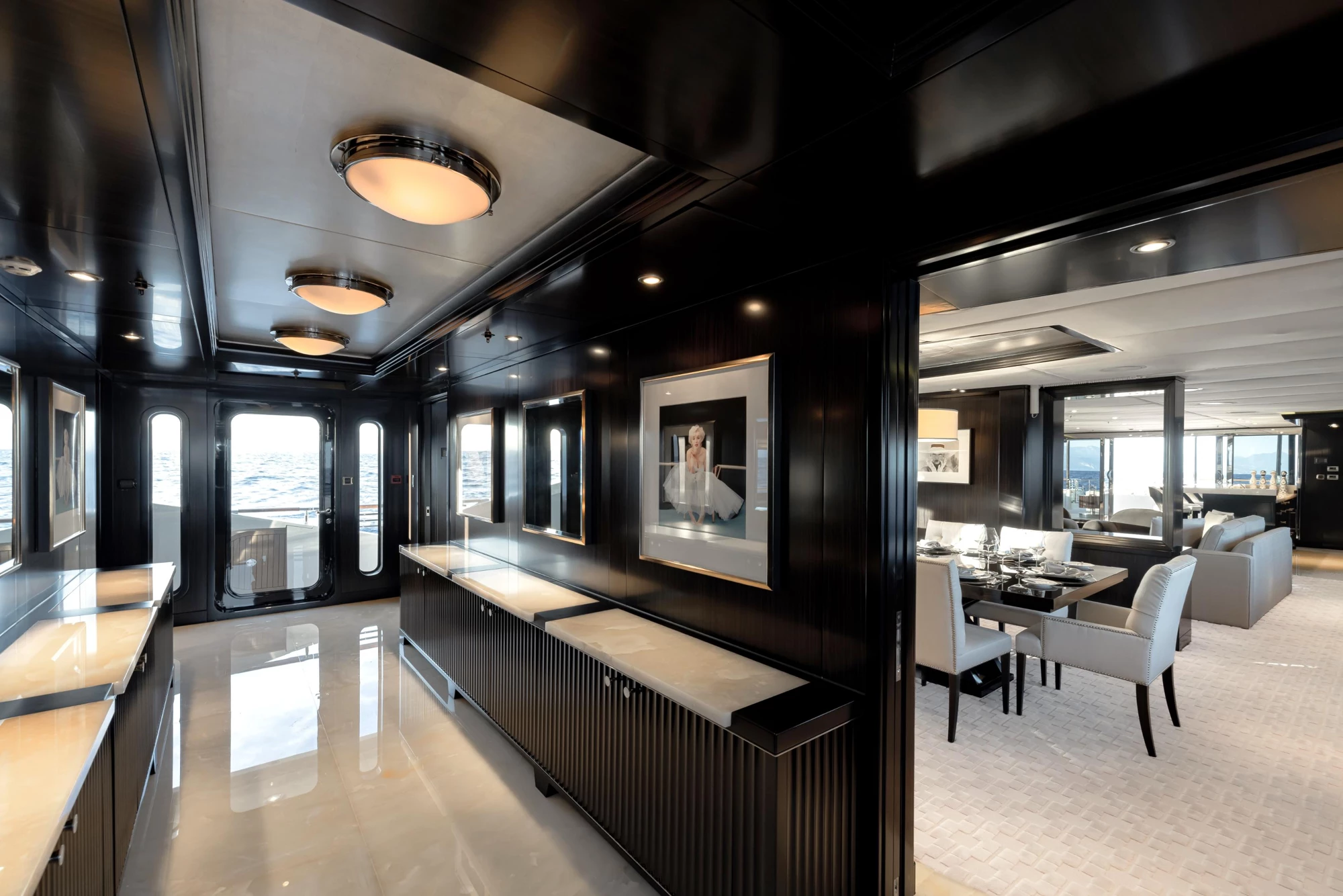 A full-custom yacht, CARPE DIEM’s Macassar and cherry ebony, white onyx, and tufted silk interior provides the perfect setting for the owner’s collection of vintage photographs from the Golden Age of Hollywood. The Art Deco theme travels from inside to the outside where much of the decor and cabinetry, finished to sustain the heat, humidity and salty environment, is in the same style and material as the interior.