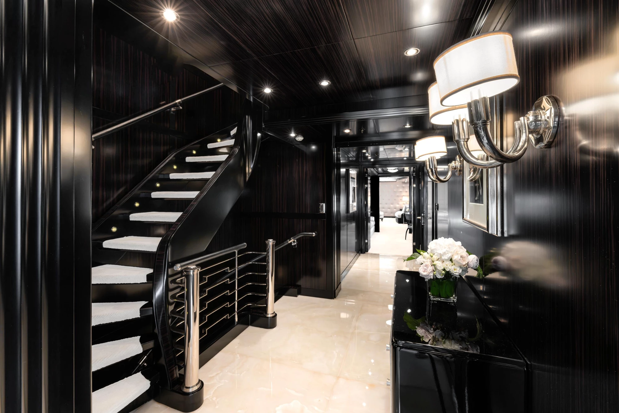 A showcase for American design and craftsmanship, her sleek exterior lines and naval architecture were by Trinity’s star designer, Geoff van Aller, while her elegant black and white Art Deco interior was created by Carol Williamson and Associates.