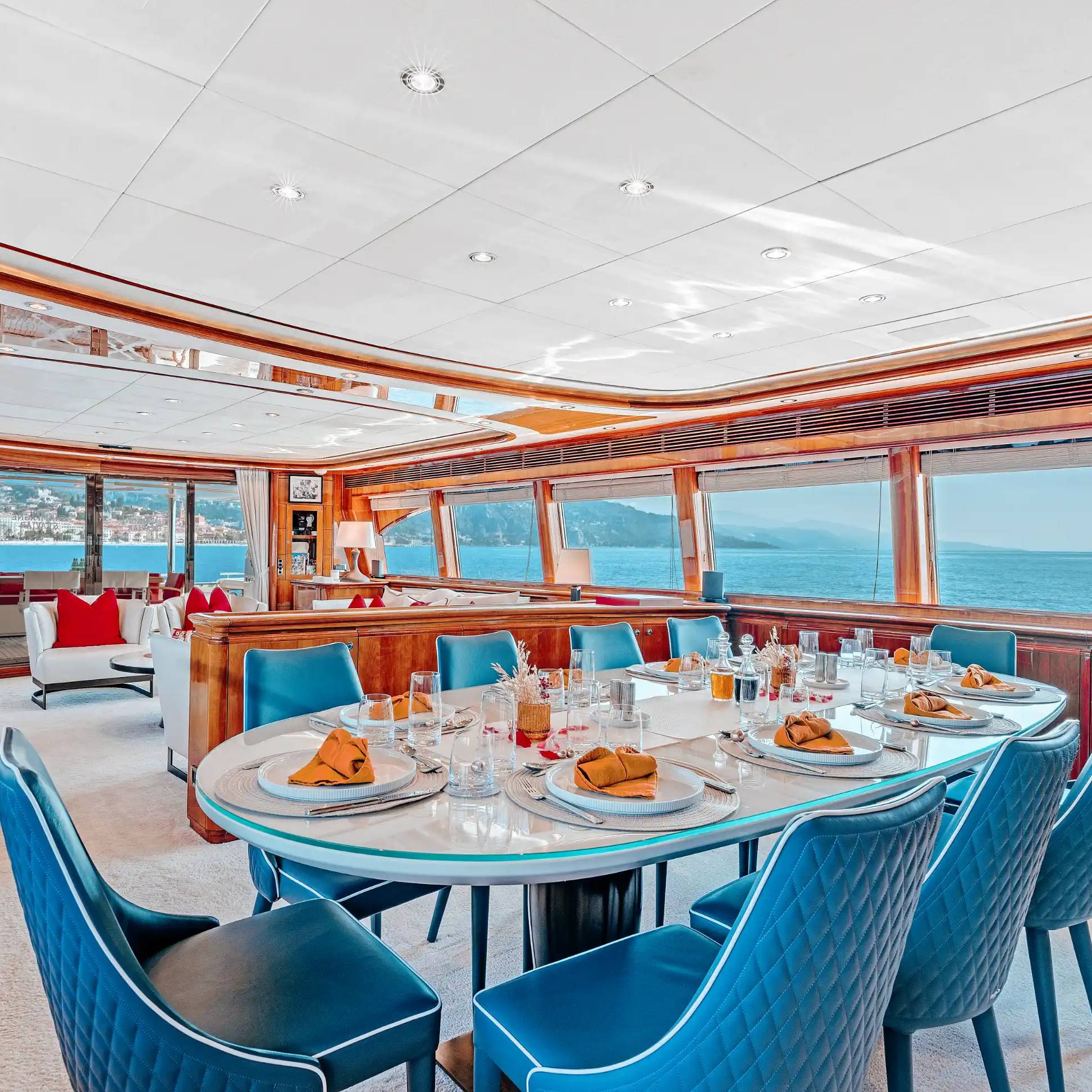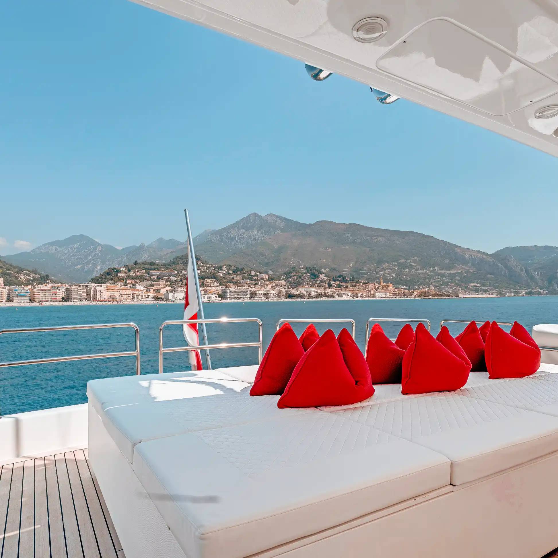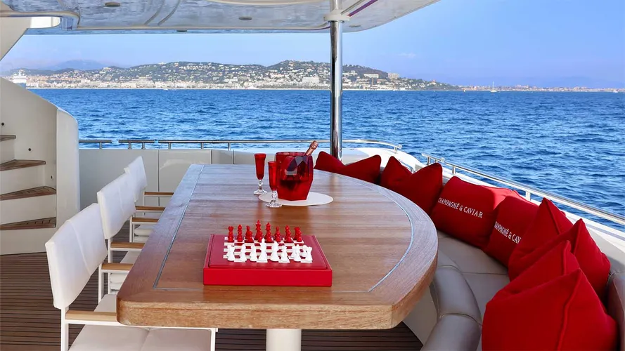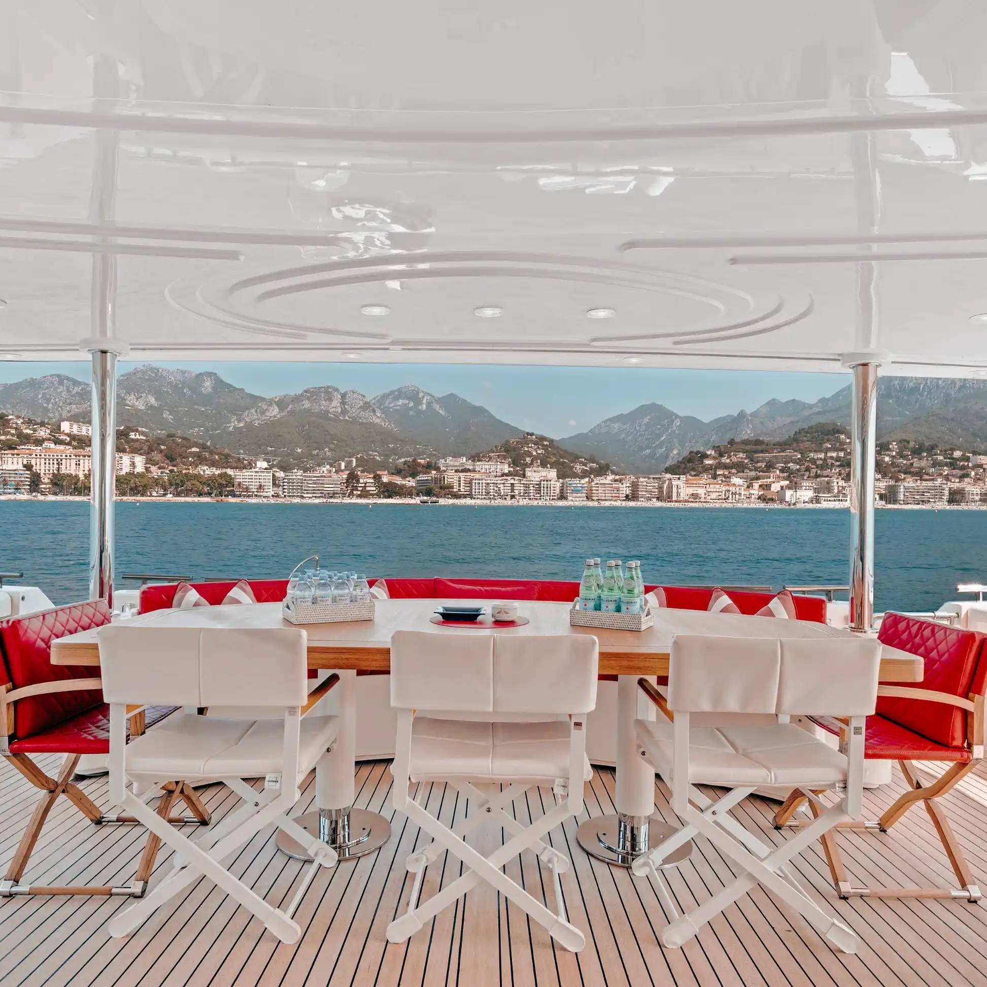 Step into the main salon, adorned with art by Slim Aarons, and dine at the stylish glass table perfect for gatherings of up to 12. For relaxation seekers, enjoy multiple alfresco spaces with sun loungers and wet bars, all while soaking up Monaco’s breathtaking coastline views.