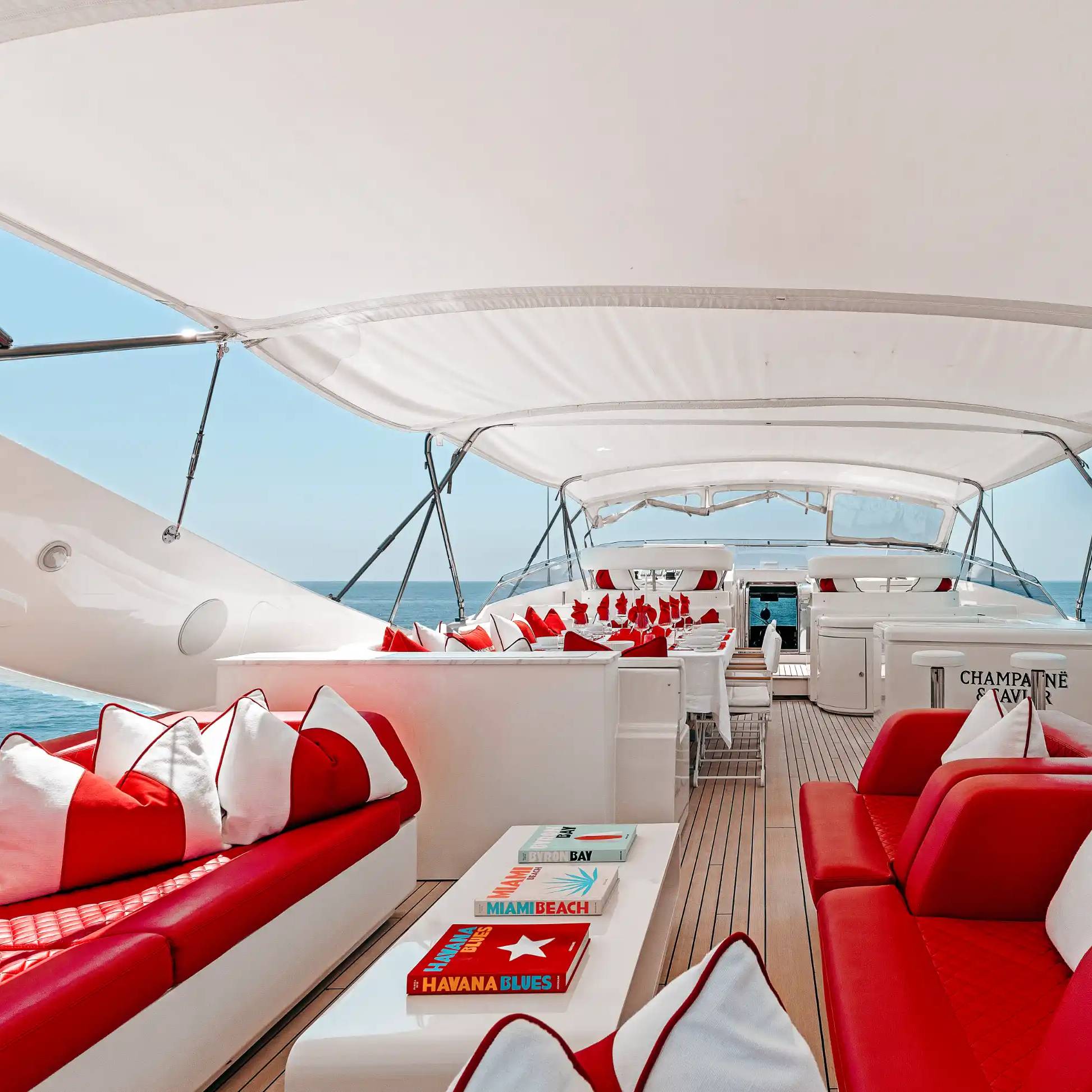 Say hello to CHAMPAGNE & CAVIAR, the sleek 34.14-meter Custom Line yacht, newly refitted in 2024 for an unparalleled outdoor living experience. With expansive interiors and open-air decks, this beauty invites you to lounge in style with sunbeds, outdoor bars, and a spacious sundeck. Hosting up to 12 guests, her flexible layout features a master cabin, two doubles, a twin, and a customizable fifth cabin for a massage room, gym, or private retreat.
