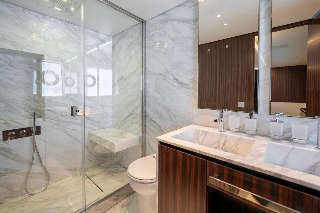 COCOY hosts four exquisite cabins: a full-beam master suite, a VIP suite forward, and two twin cabins with convertible options. Each cabin is ensuite, adorned with rich woods and premium materials. The crew quarters are efficiently designed with separate access.
