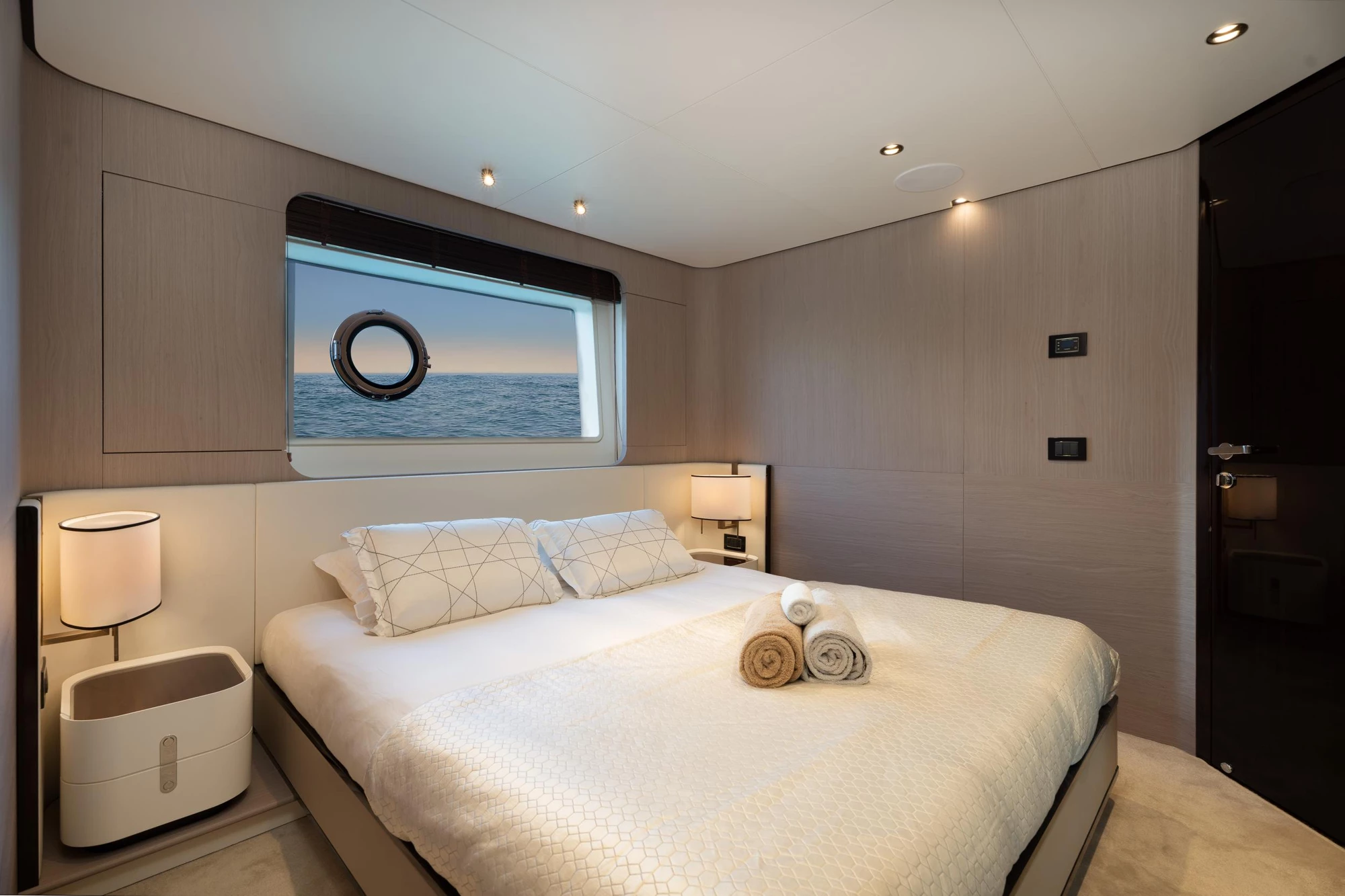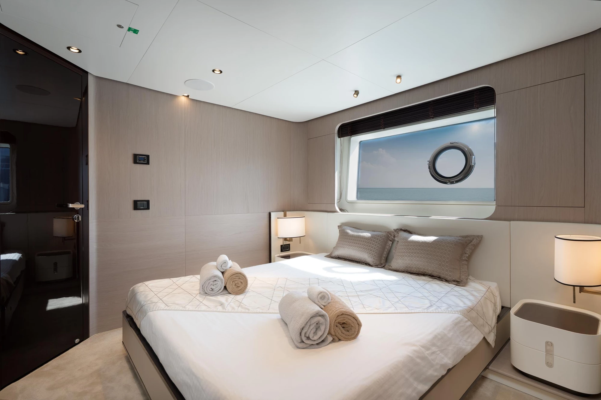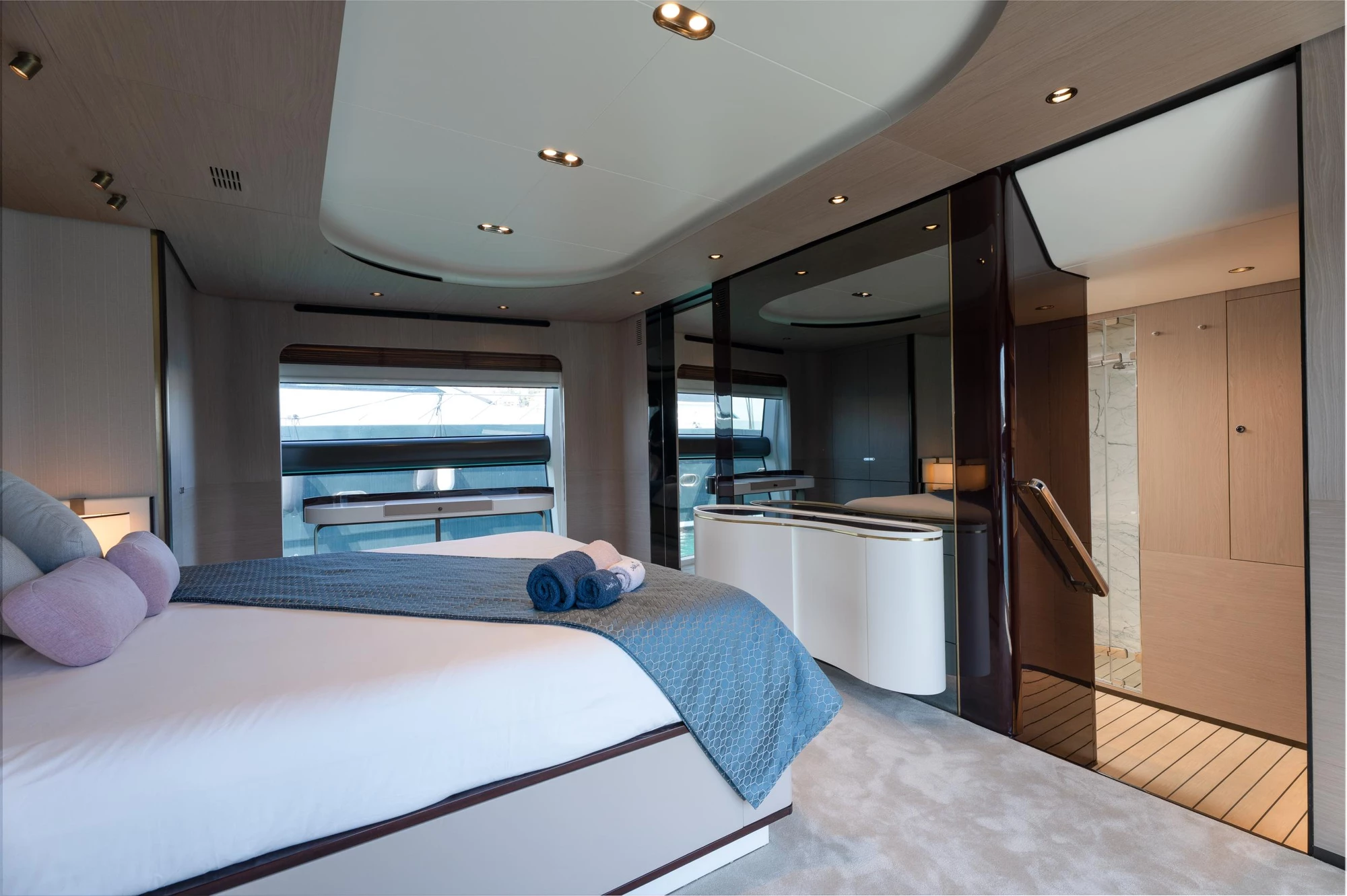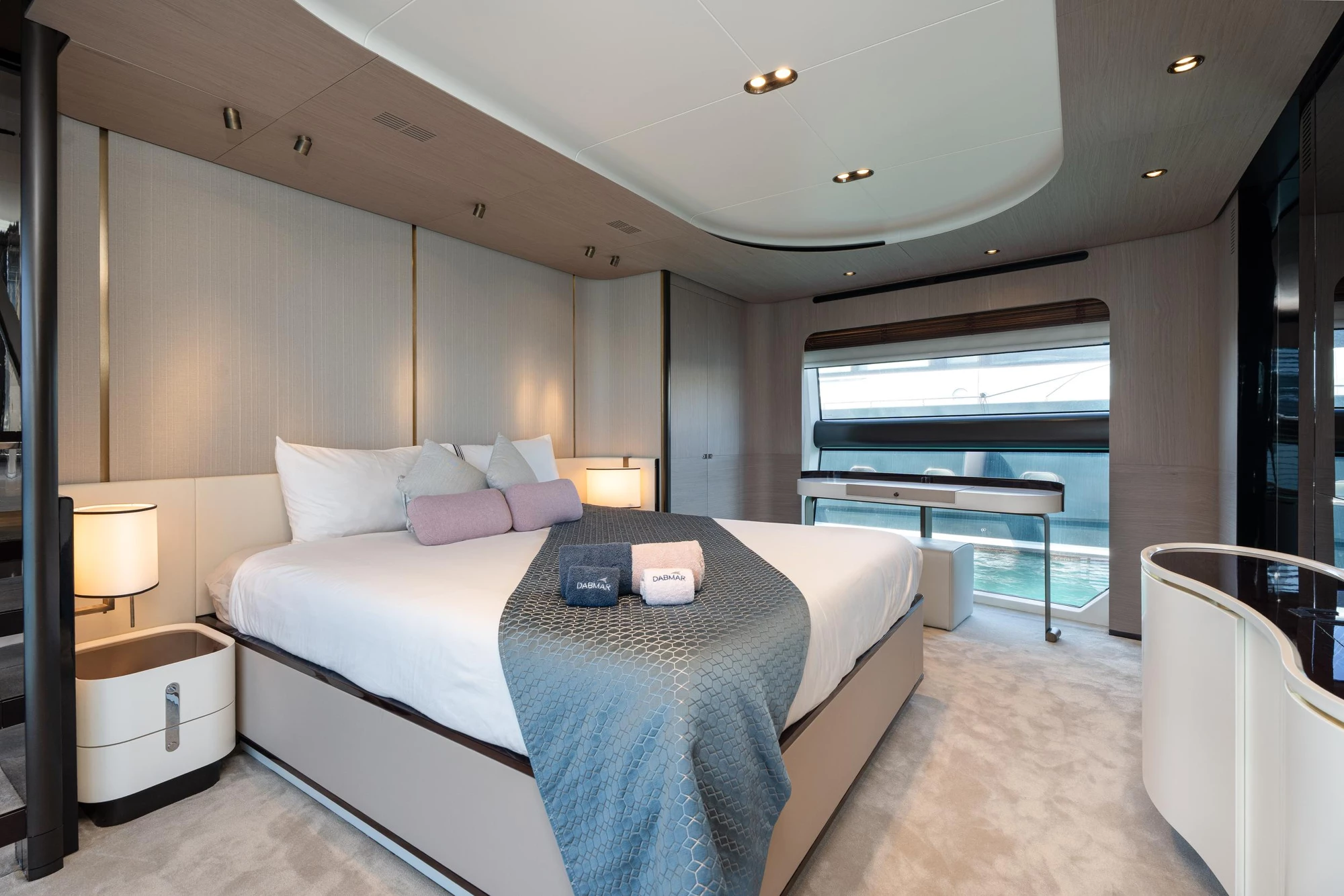 DABMAR stands out for its smart layout. The full-beam Owner’s suite sits forward on the main deck, offering exceptional privacy and panoramic views. Four versatile guest staterooms on the lower deck accommodate up to 10 guests in total comfort.