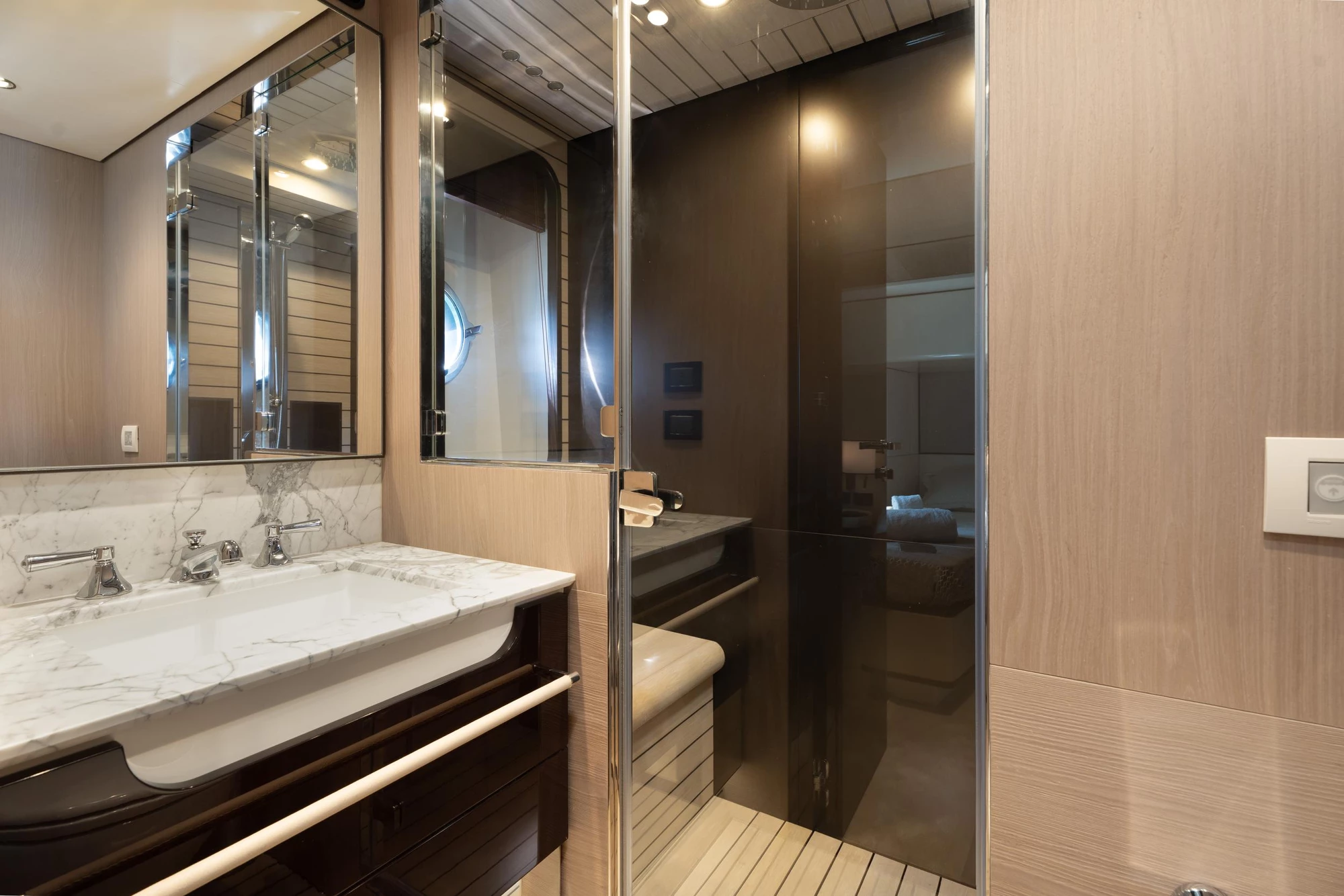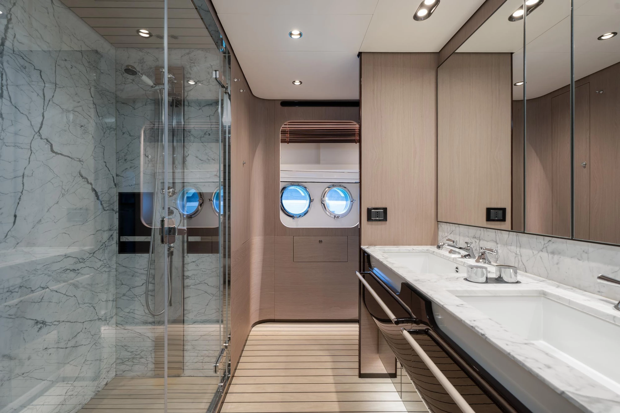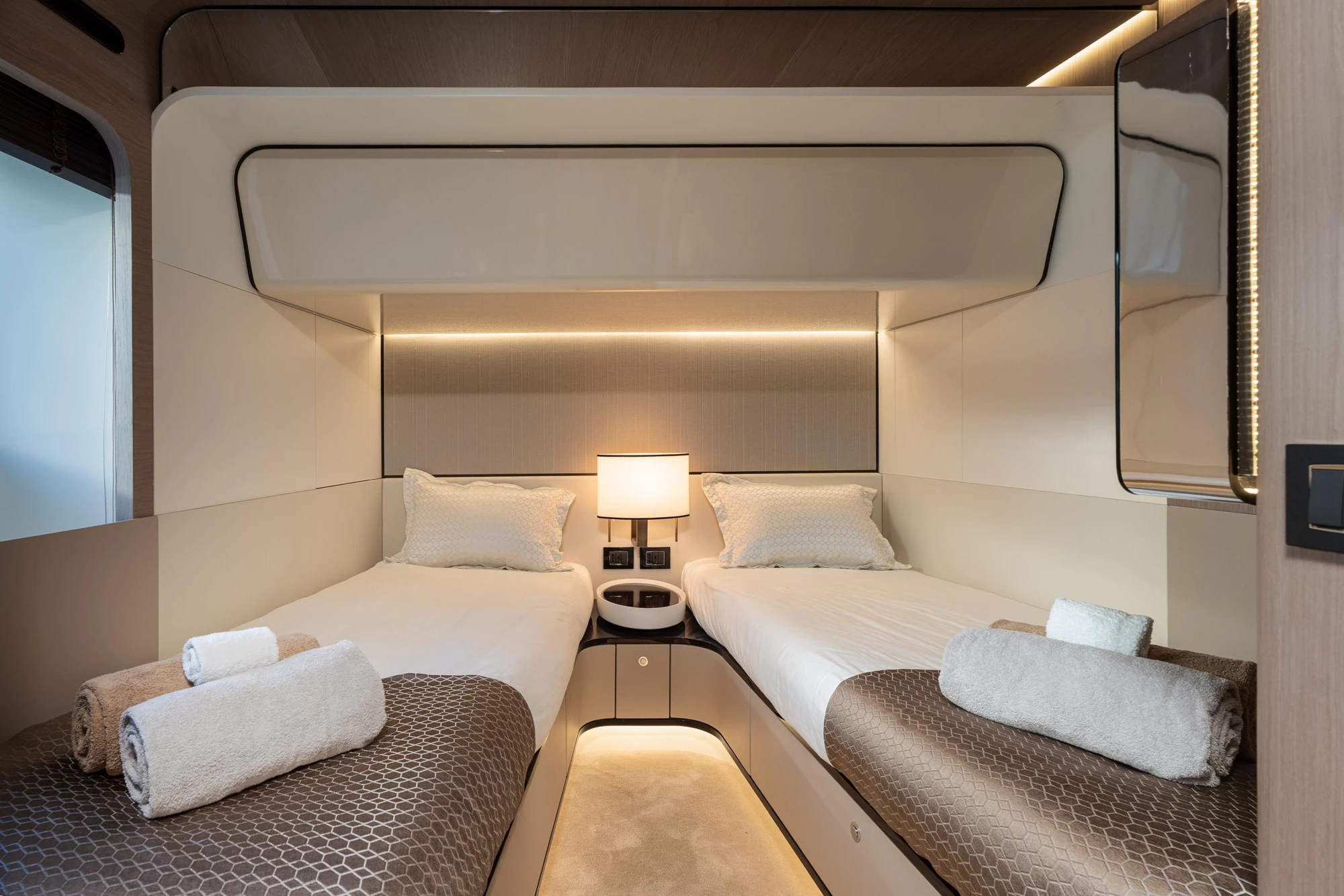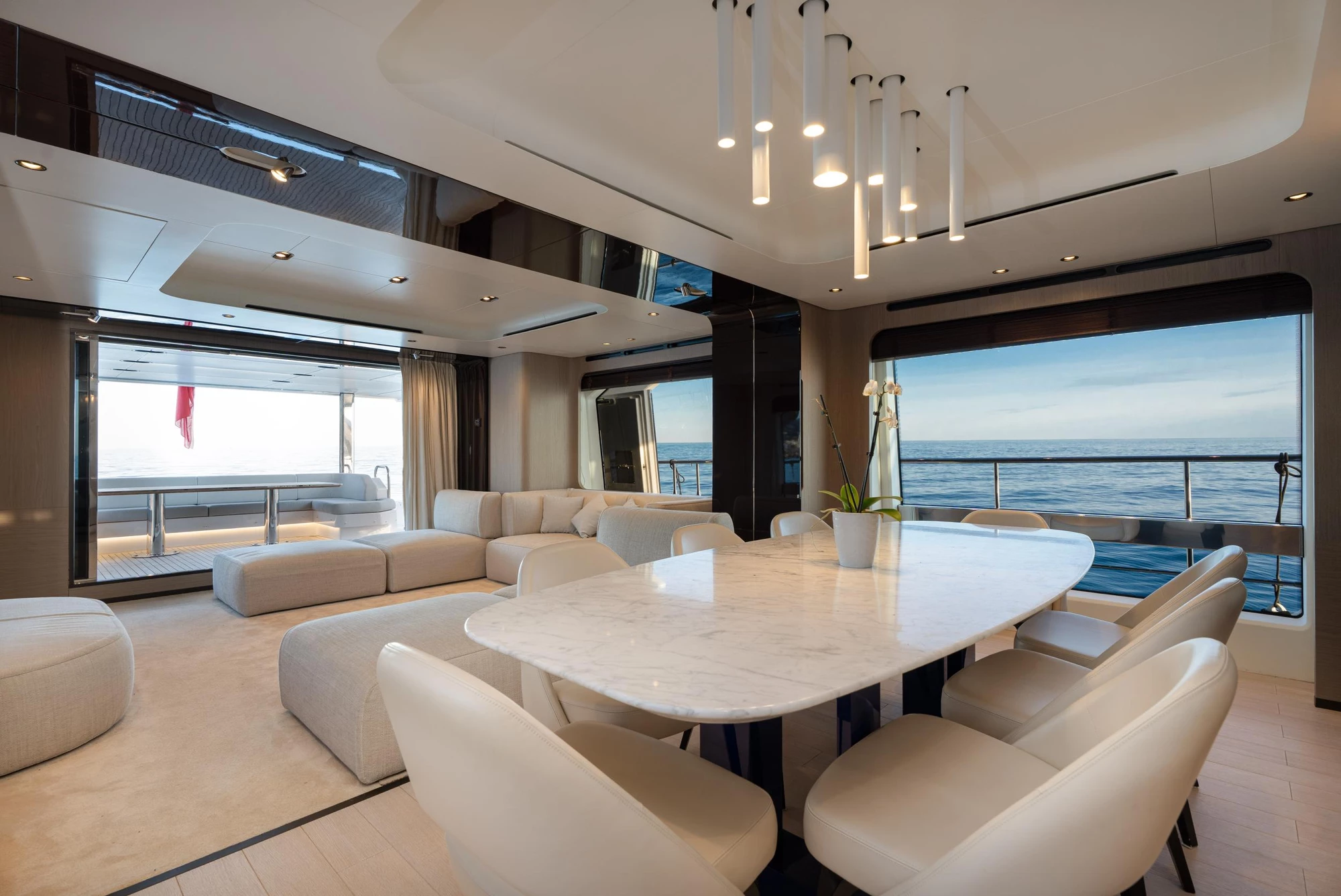 DABMAR stands out for its smart layout. The full-beam Owner’s suite sits forward on the main deck, offering exceptional privacy and panoramic views. Four versatile guest staterooms on the lower deck accommodate up to 10 guests in total comfort.