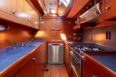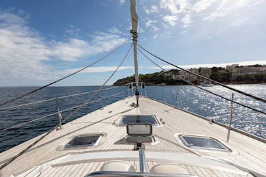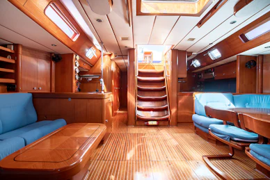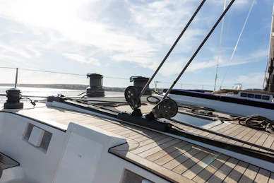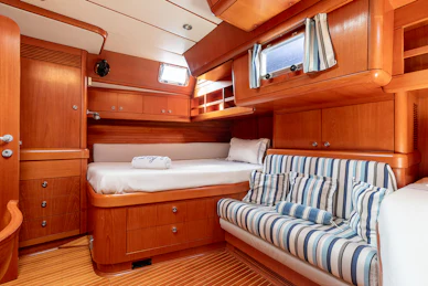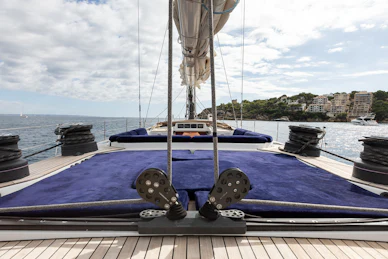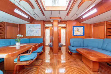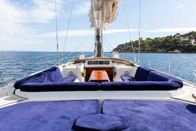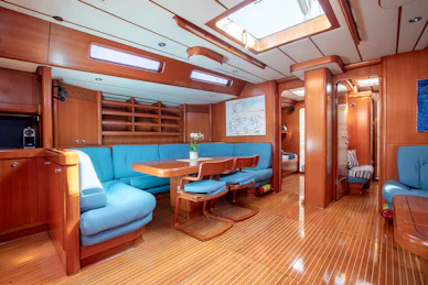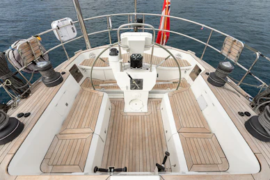 Equipped with a carbon mast and boom, cutter rig and hydraulic furlers, DAG delivers strong offshore performance while remaining manageable for a small crew. Her 3.4 m deep keel and substantial ballast provide strong upwind capability and stable motion in challenging conditions. The deck layout features two dedicated cockpits—an aft sailing cockpit and a forward guest cockpit for dining and relaxation. A carbon passerelle leads to the aft deck, with steps down to the swim platform, while the flush foredeck offers generous storage and tender‑carrying capacity.