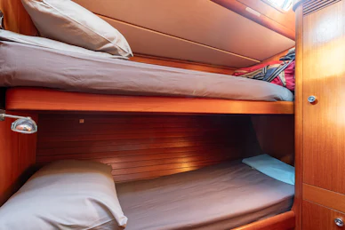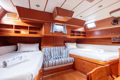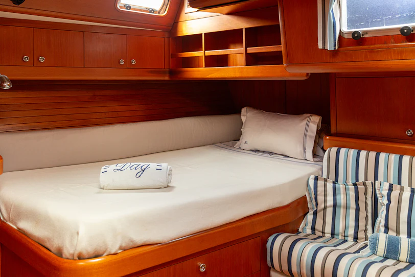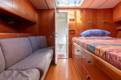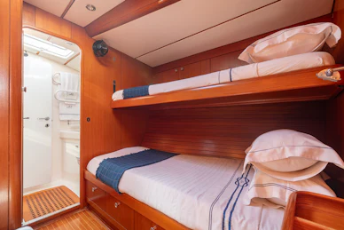 Accommodation is arranged for seven guests in four cabins, plus separate crew quarters forward. The full‑beam master cabin includes two queen‑size berths, a sofa, ensuite bathroom and a private study with the original Swan desk and chair. Two midships guest cabins offer large lower berths, upper bunks and ensuites, while an additional aft‑starboard cabin uses the day head. Forward, the crew area features a double bed, sofa and private ensuite.