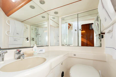Four guest cabins for seven guests, including a full‑beam master suite with study, plus separate forward crew accommodation.
