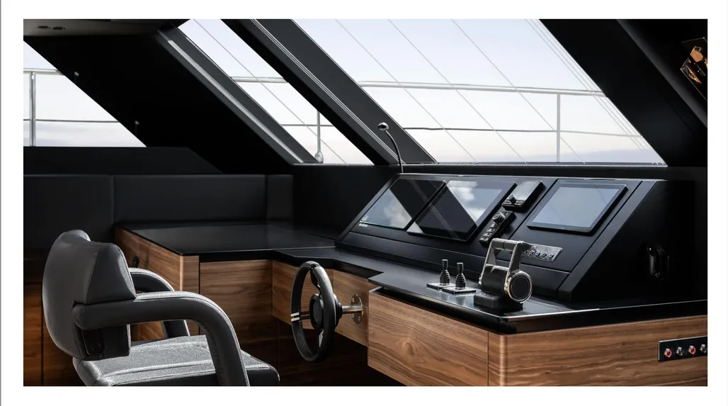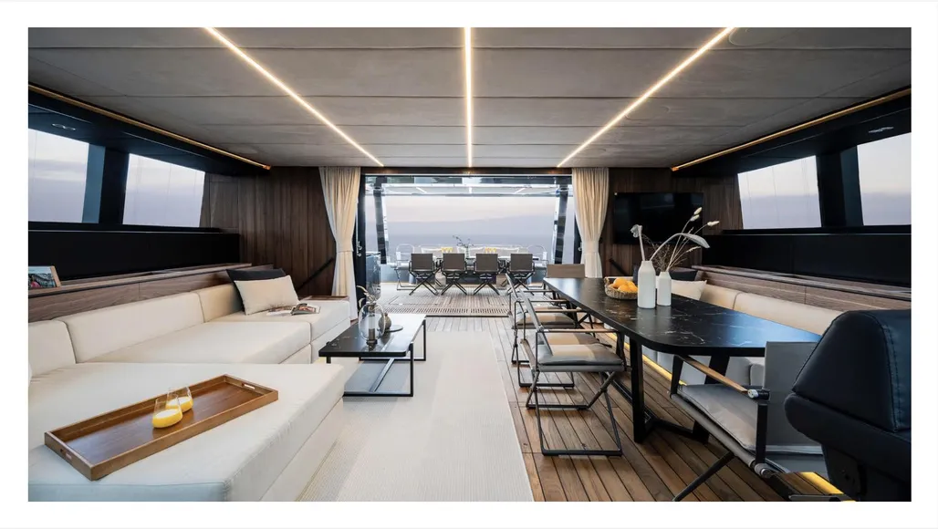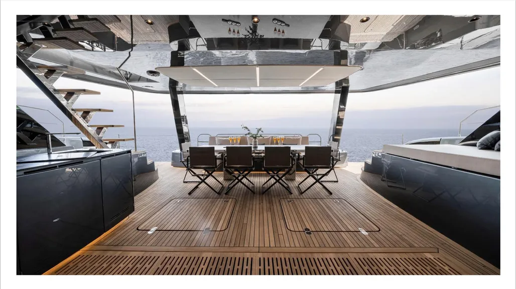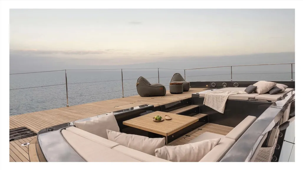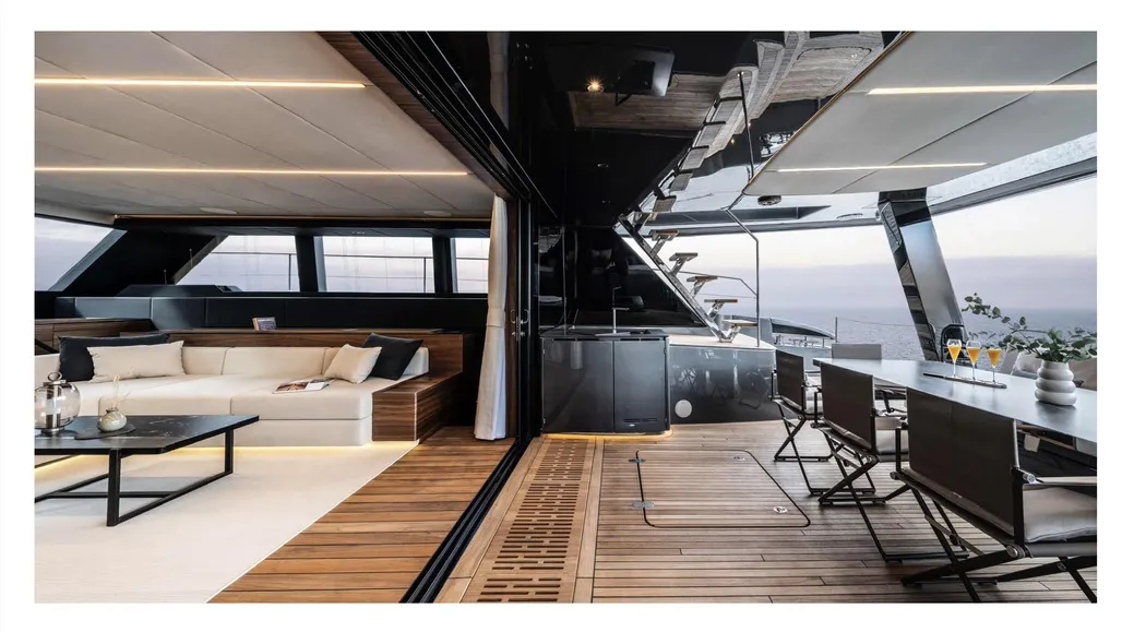 Step outside to discover sleek metallic finishes, a hydraulic swim platform, and inviting sunbathing lounges. The flybridge boasts a composite hardtop bimini with skylights and integrated lighting, while the main deck features a versatile lounge, a stylish bar, and teak-clad platforms for that classic yachting feel.