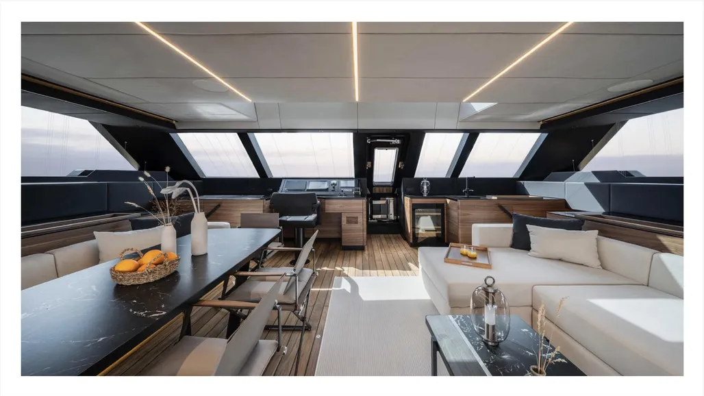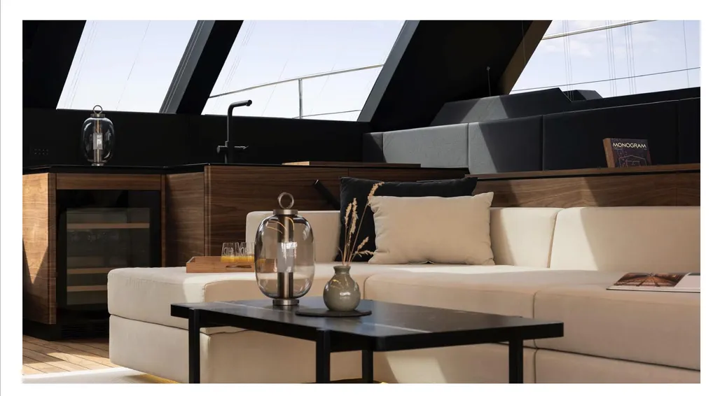 • Loose furniture includes five dining chairs in the saloon, four in the cockpit, and a quartz-sintered cockpit dining table