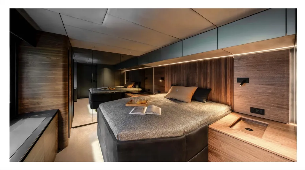 • Owner’s cabin: ample storage, two night shelves, 160 x 200 cm bed, wall with mirrors, personal safe