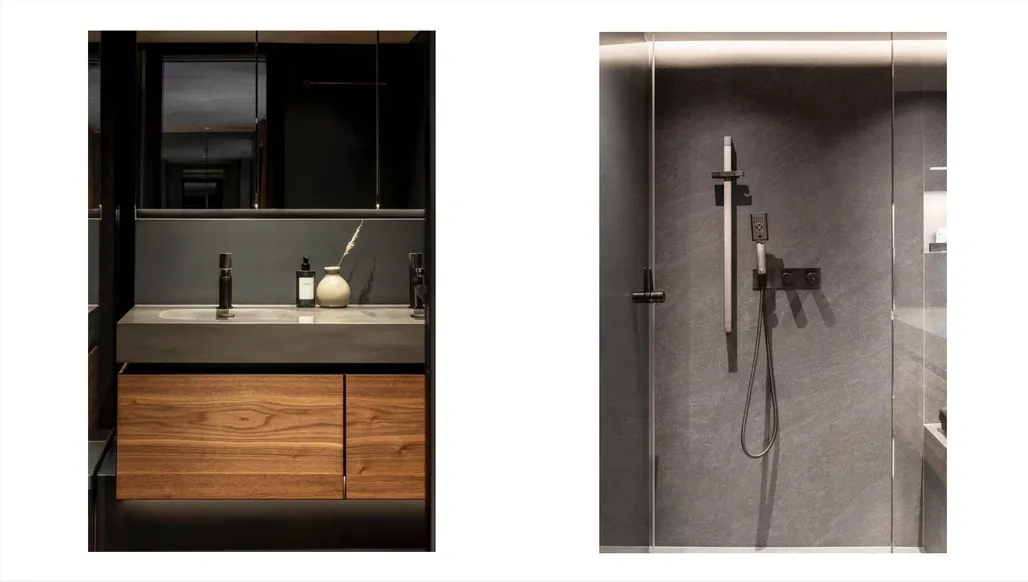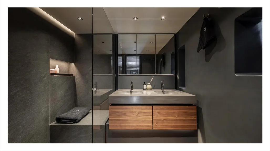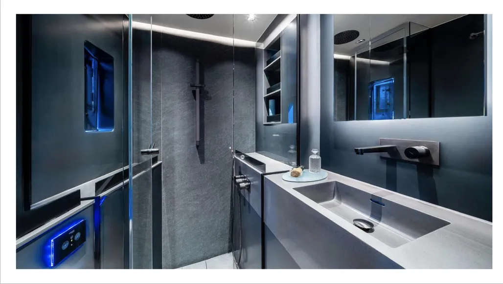 • Walls finished in glossy gel coat with a striking sintered quartz accent wall