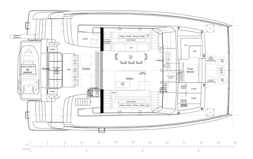 • Full-size multifunctional lounge with foldable backrest (main deck aft)