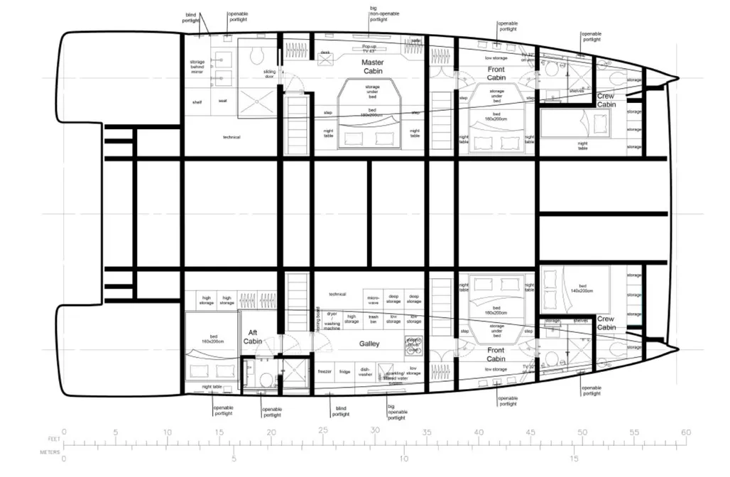 Experience luxury and smart design in every corner. This yacht features a custom layout with a spacious master cabin and galley in the hull, three guest cabins, plus two crew cabins with private entrances—ideal for seamless hospitality.