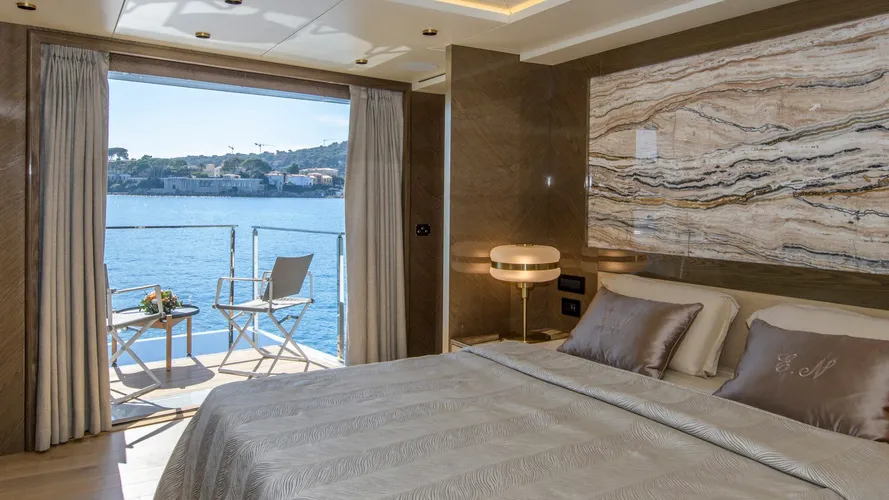 Key features include al fresco dining across three decks, a fold‑down balcony in the main‑deck master suite, and a folding beach club that opens to create an expansive waterside terrace. She accommodates 10 guests in five cabins, including a main‑deck master and two full‑beam suites. With a top speed of 13.5 knots and a range exceeding 4,000 nm, EBYSHINE is well suited for efficient long‑range cruising.