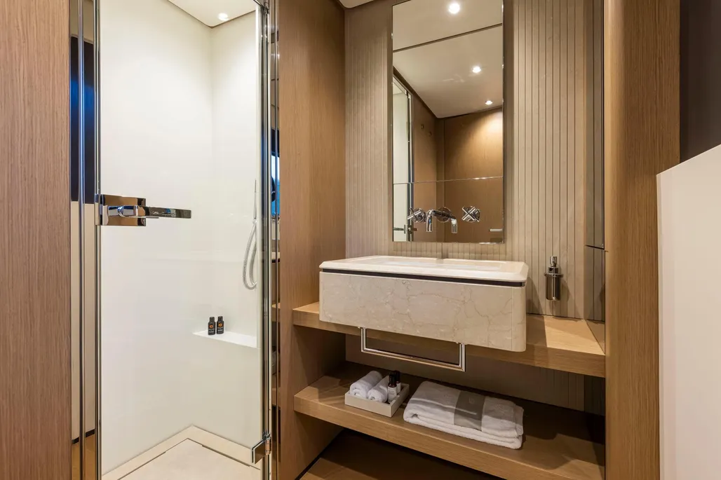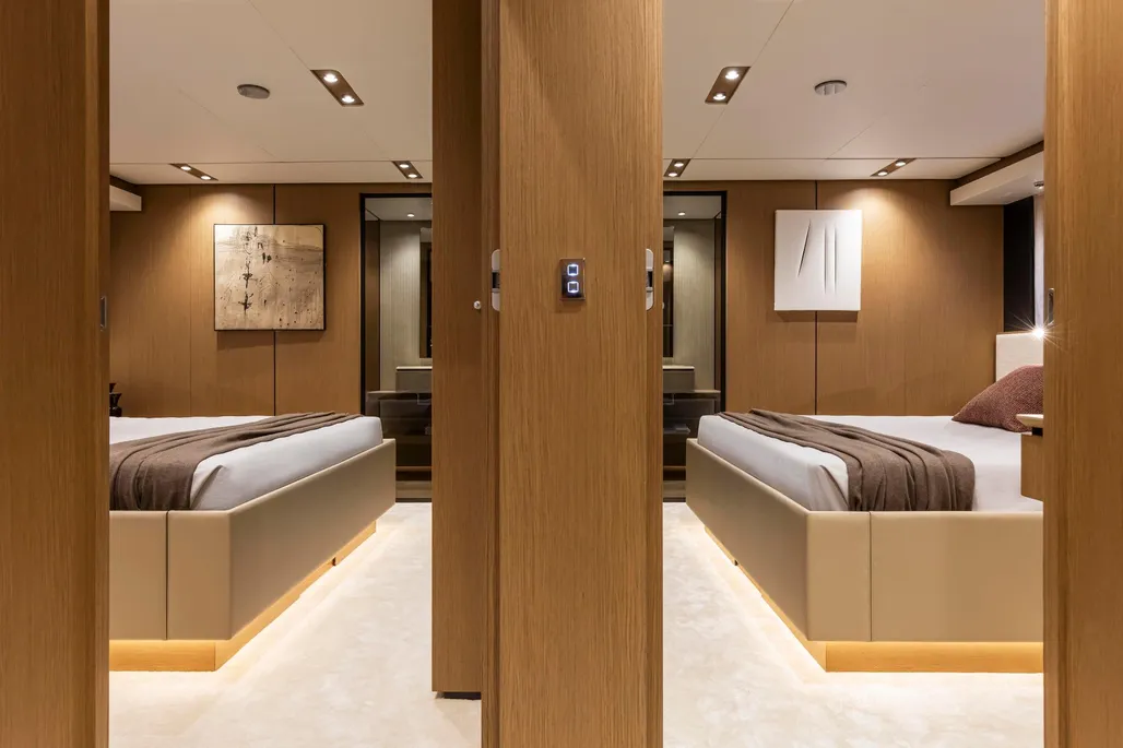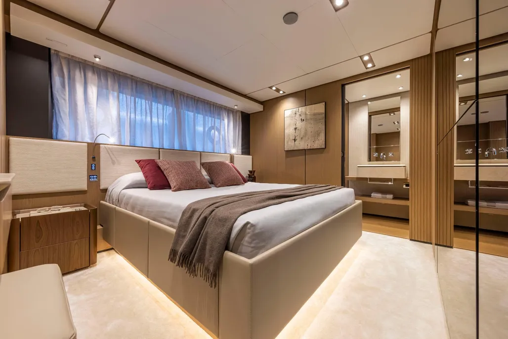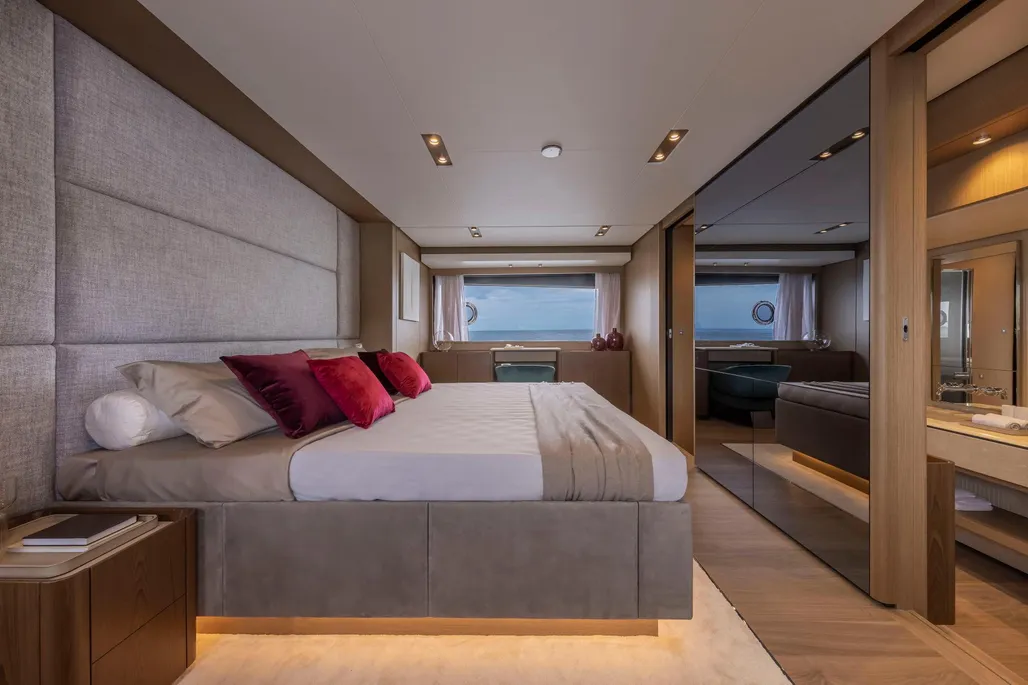 At 30.13 meters with a 6.81-meter beam, EPIC impresses with sleek Italian styling, a spacious flybridge, and floor-to-ceiling salon windows. The main deck hosts a full-beam Master suite, while below deck, four guest staterooms comfortably sleep up to 10 guests.